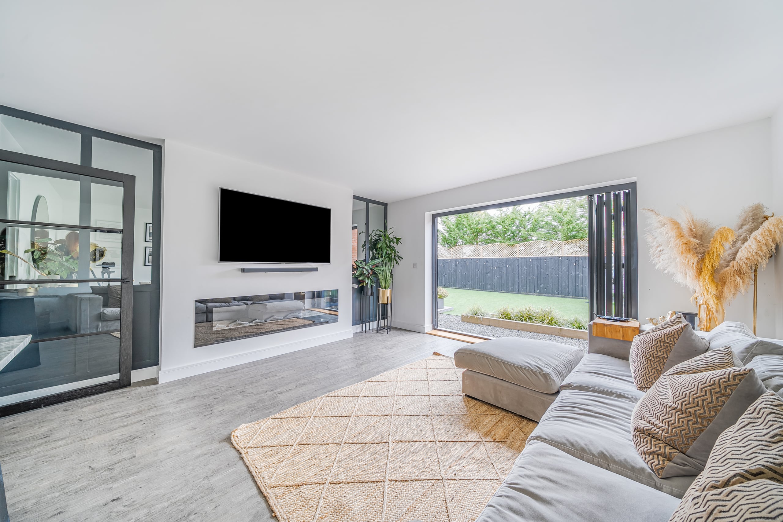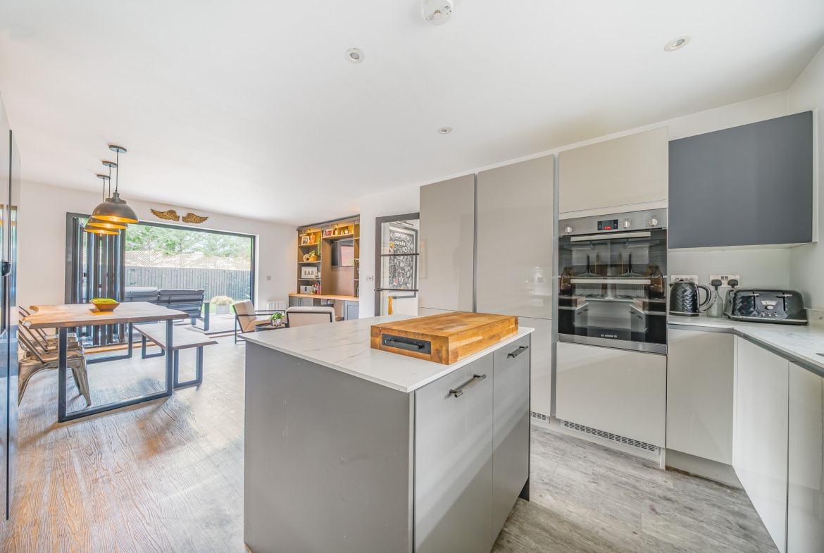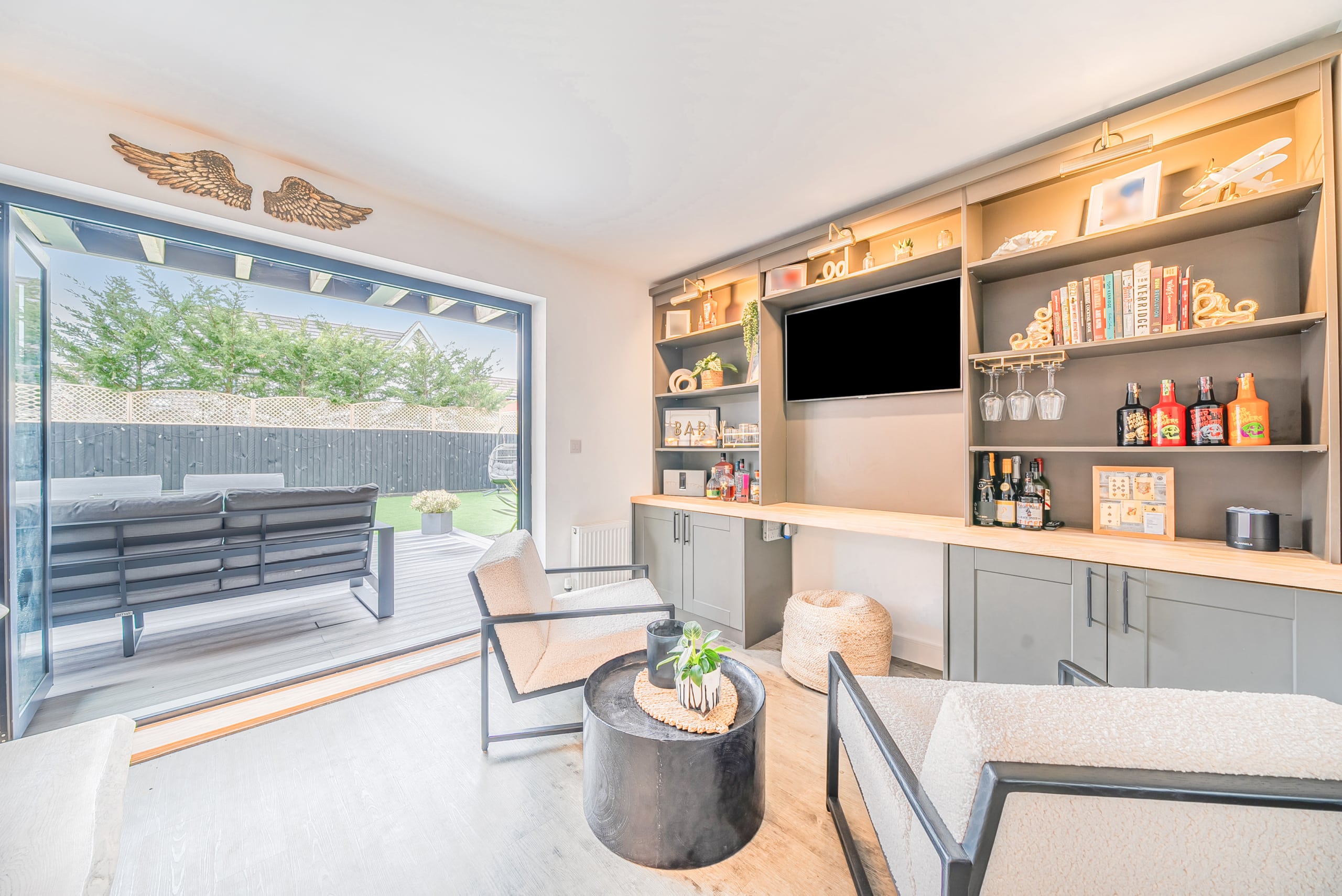 The heart of the home is the spacious kitchen/diner, a beautifully designed space perfect for entertaining and everyday living. Featuring built-in appliances, a central island, and ample room for a large dining table, this area also includes a cosy seating space with built-in storage. Bi-folding doors lead seamlessly to the landscaped rear garden, flooding the space with natural light.