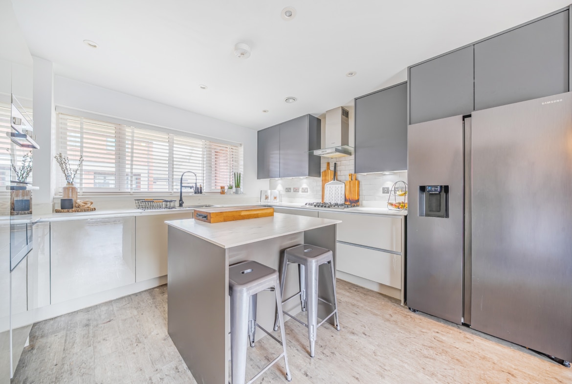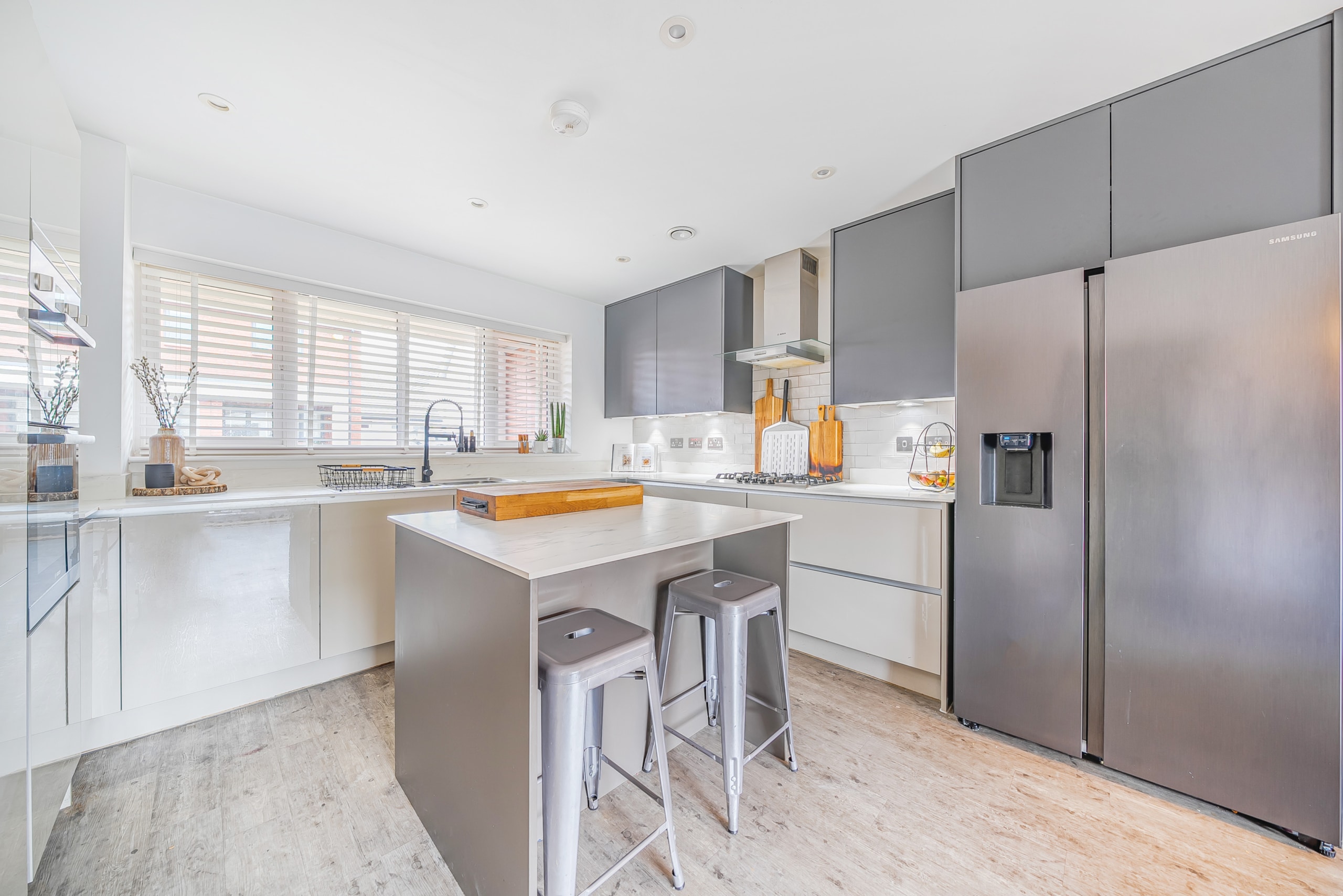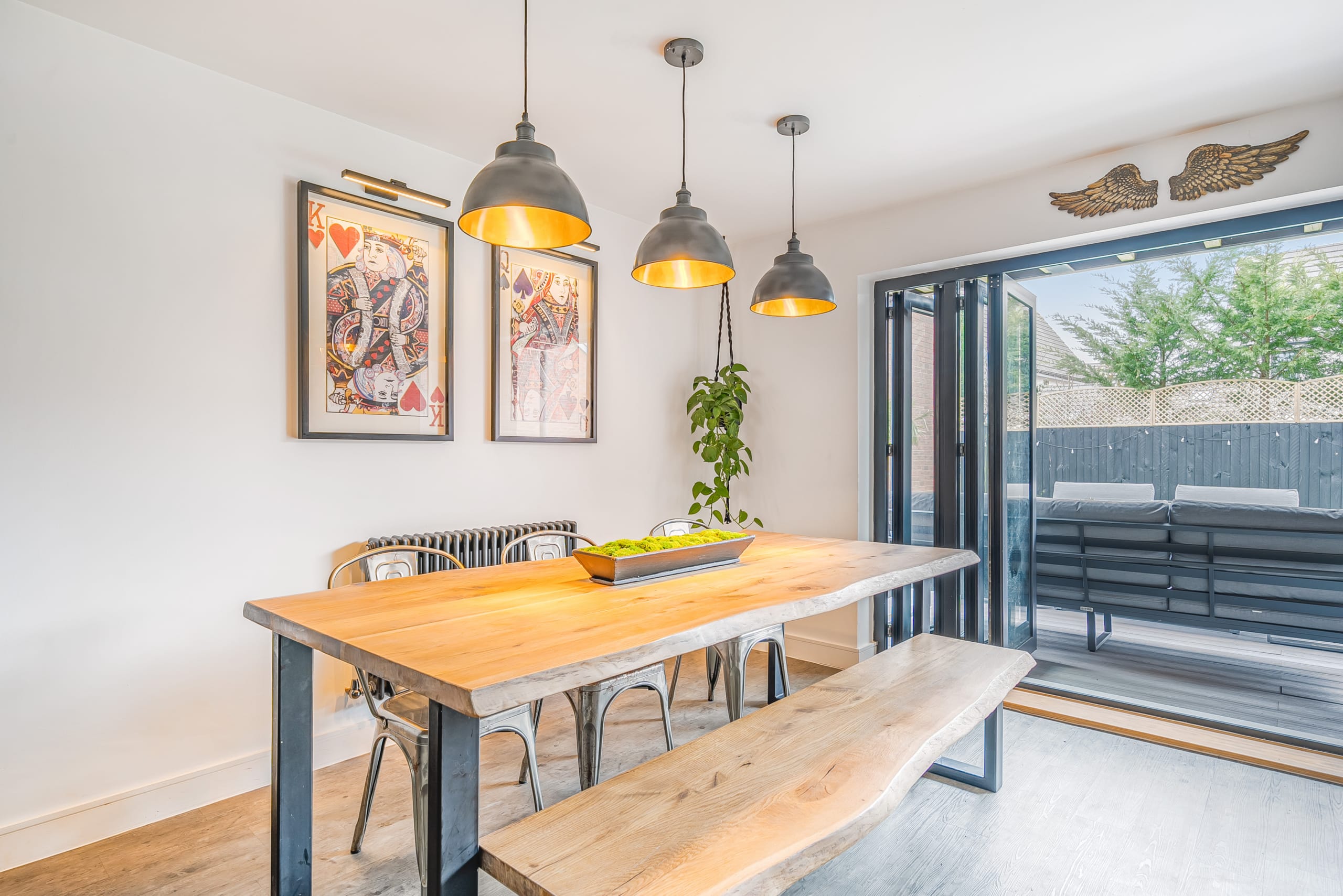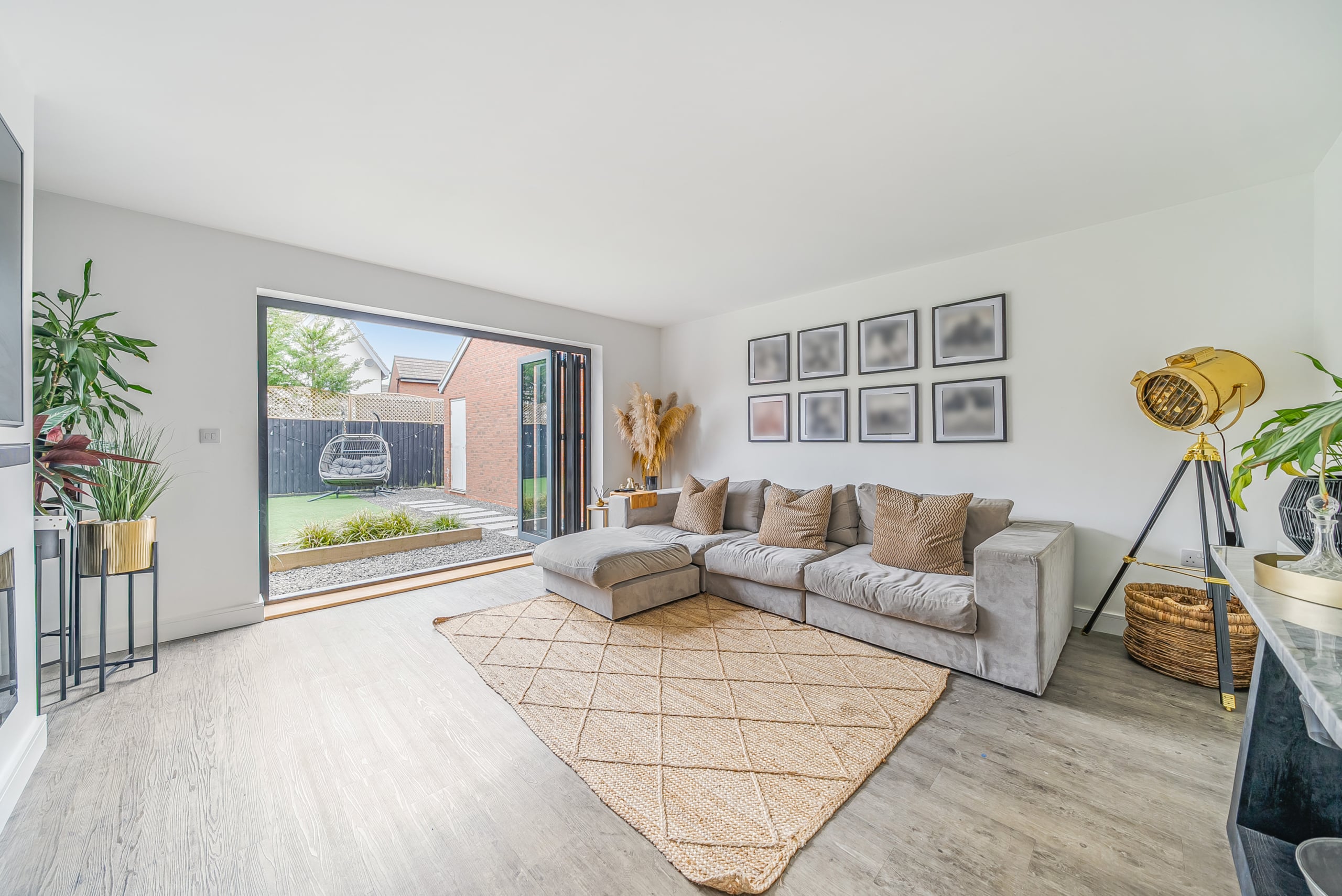 The heart of the home is the spacious kitchen/diner, a beautifully designed space perfect for entertaining and everyday living. Featuring built-in appliances, a central island, and ample room for a large dining table, this area also includes a cosy seating space with built-in storage. Bi-folding doors lead seamlessly to the landscaped rear garden, flooding the space with natural light.