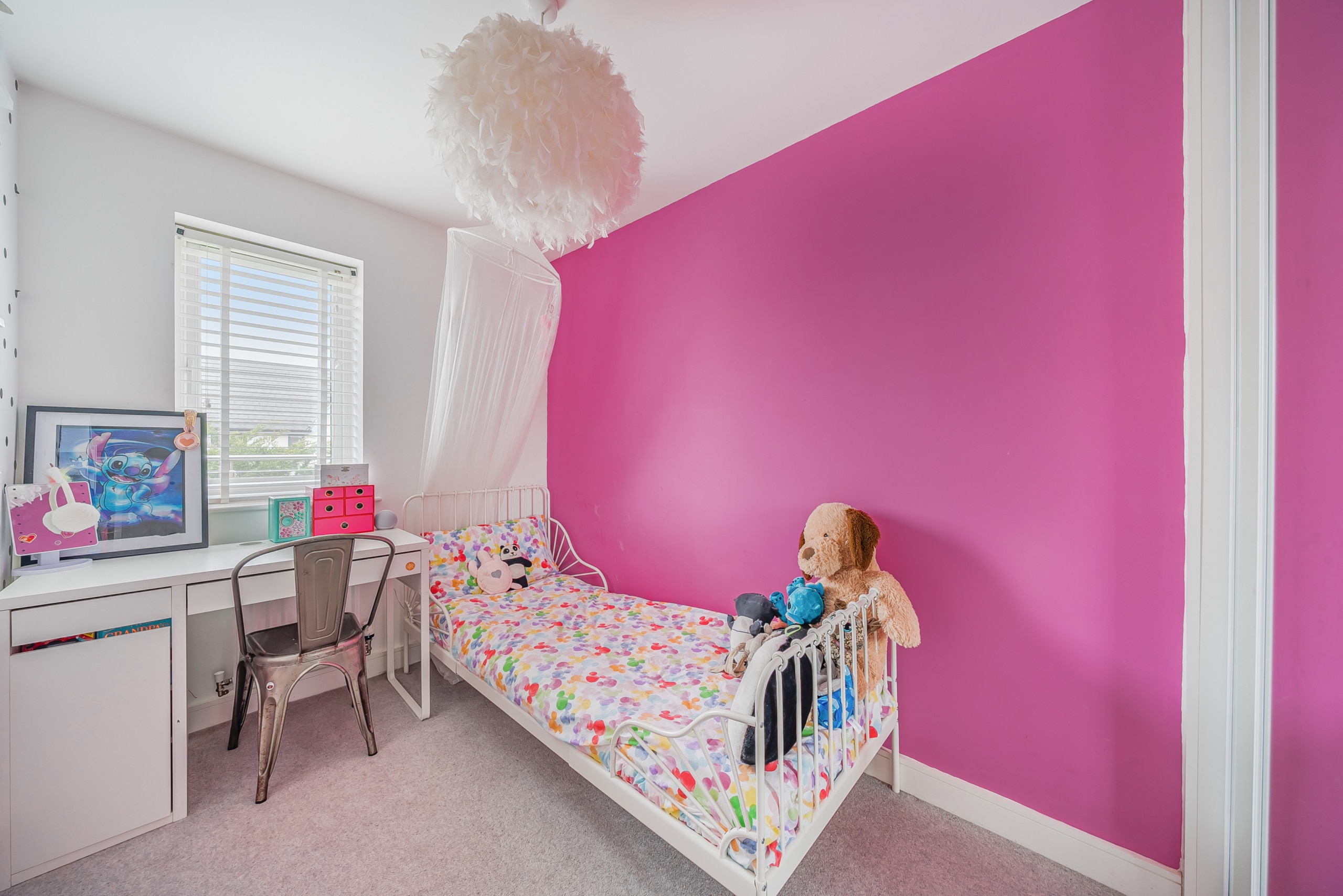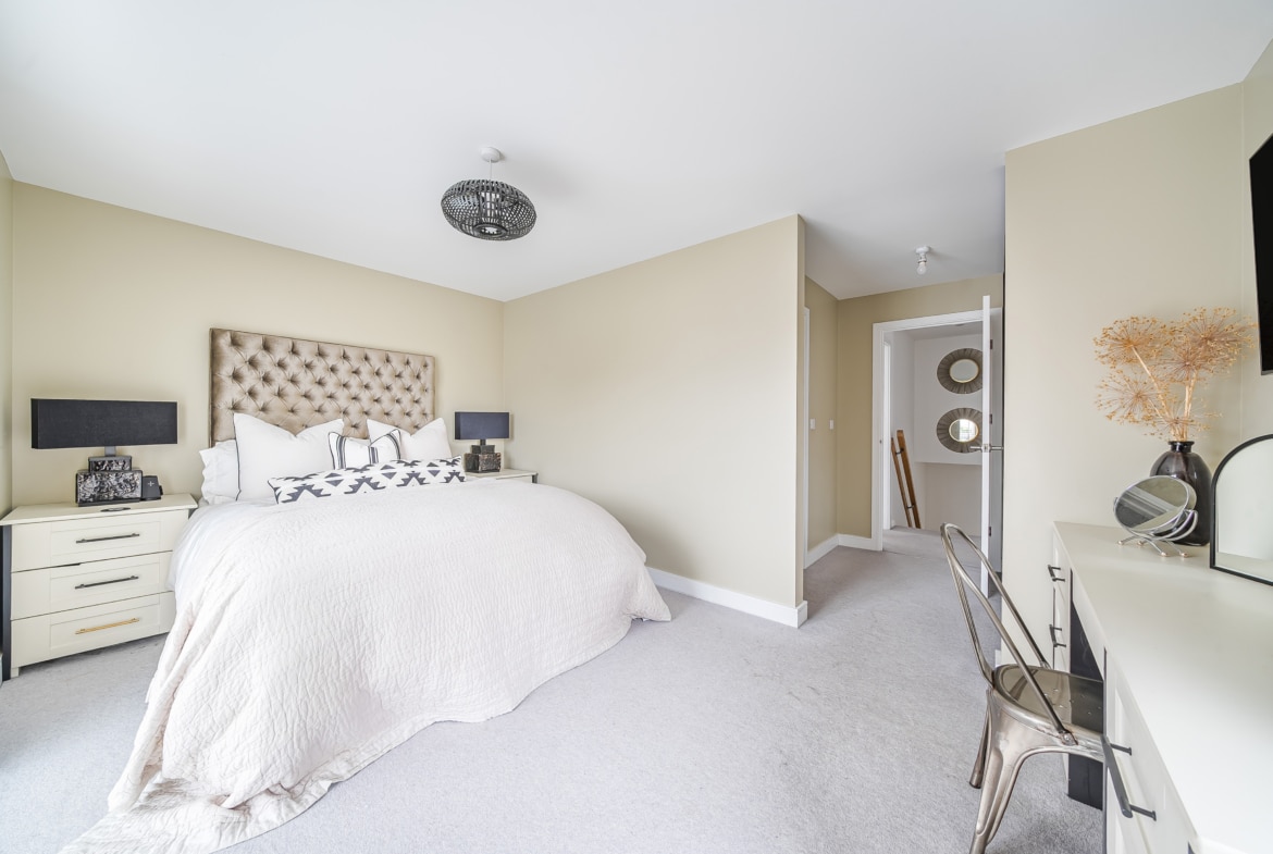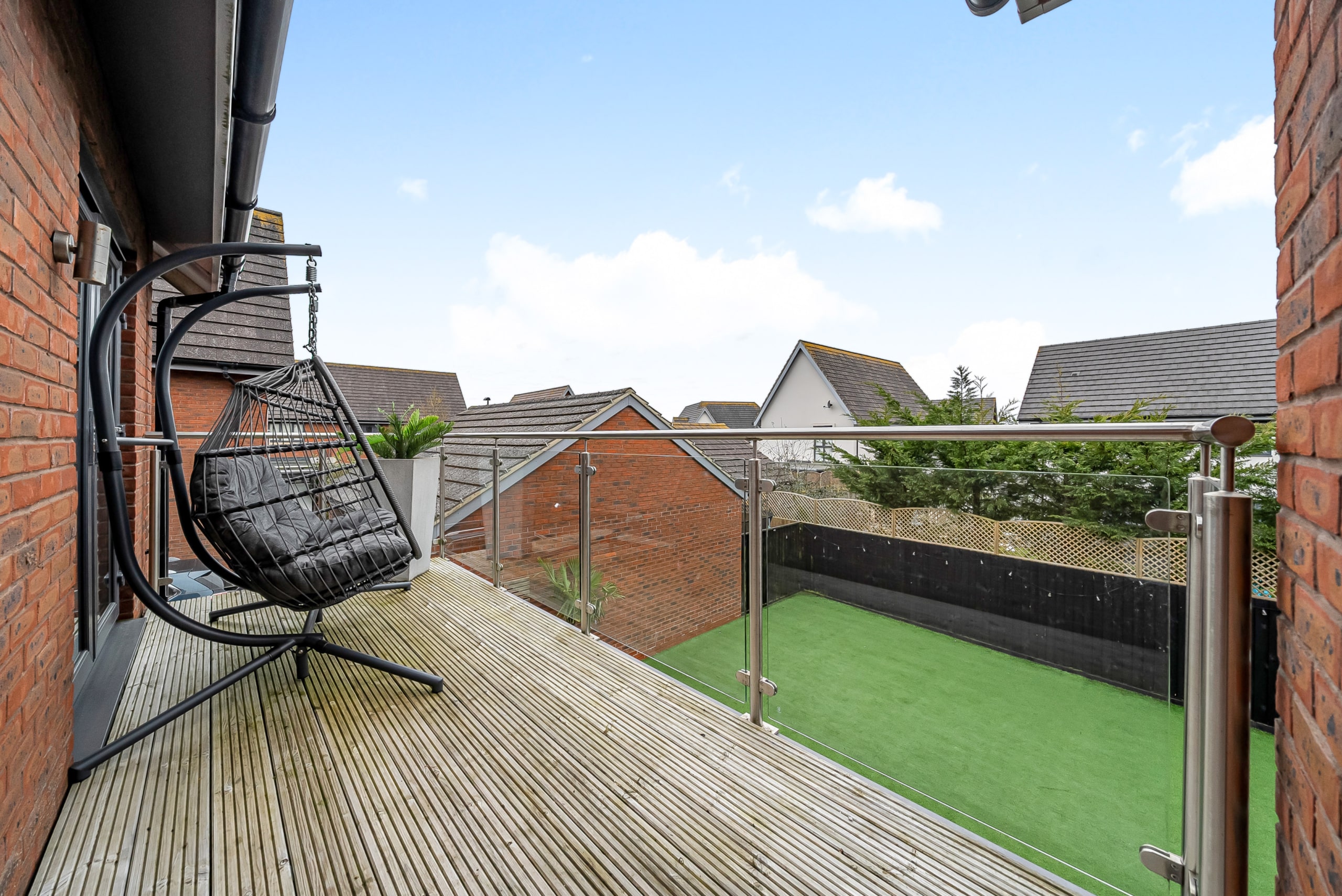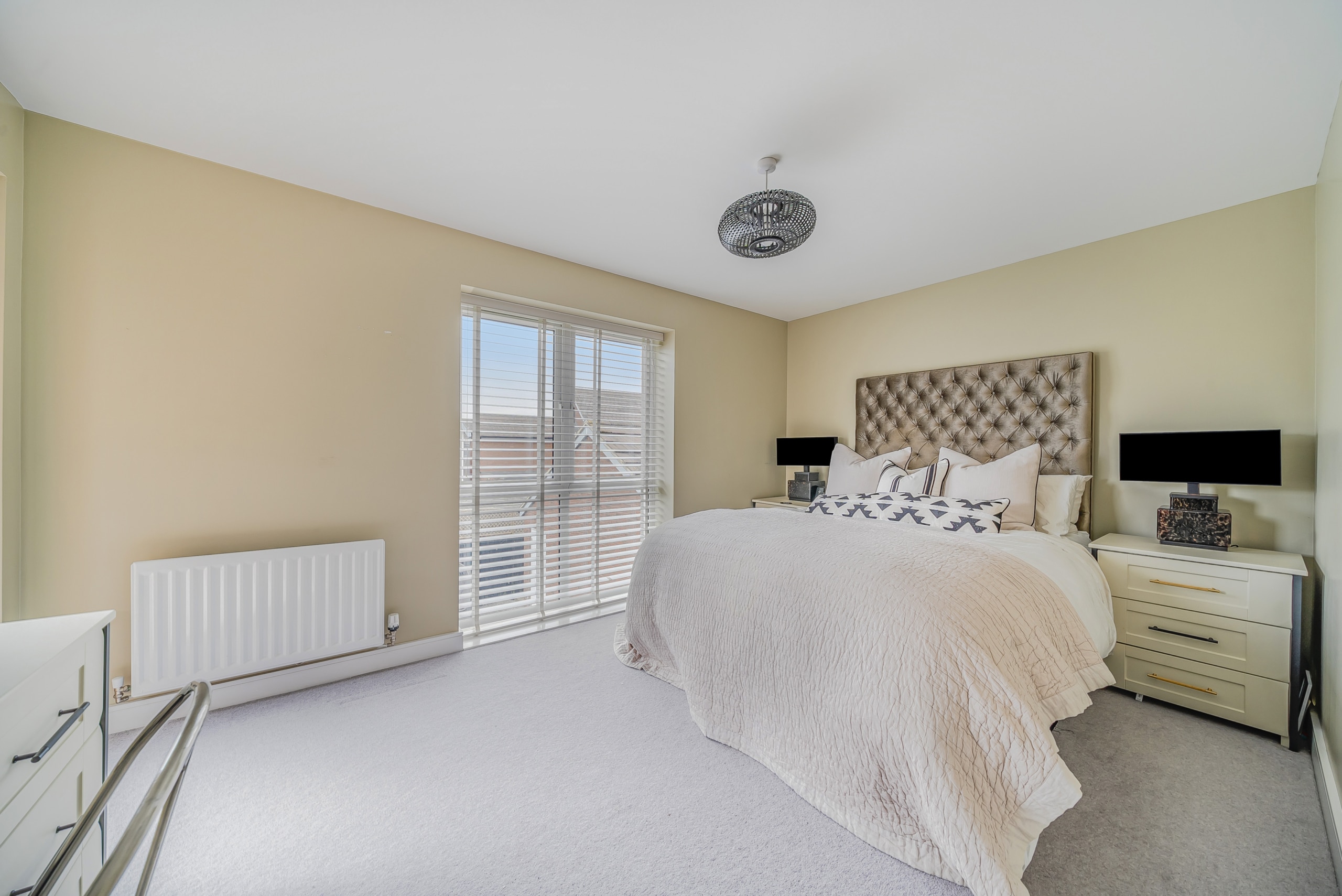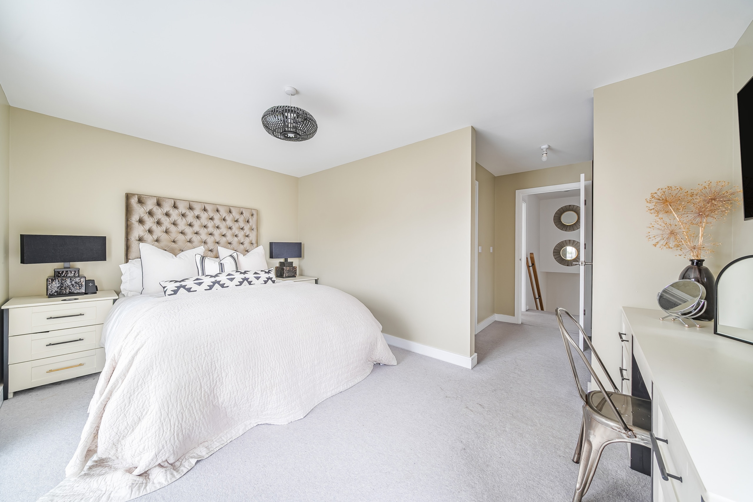 Upstairs, the master bedroom is simply stunning, boasting full-length windows, built-in wardrobes, and access to the rear balcony. Its luxurious en-suite bathroom features a double shower. Bedroom two also enjoys balcony access via French doors and benefits from its own private en-suite. Bedroom three is a spacious double, while bedroom four is a comfortable single, ideal for a child’s bedroom.