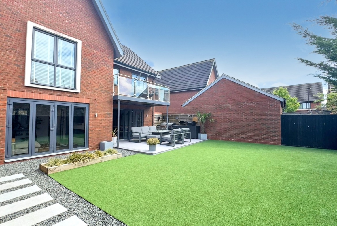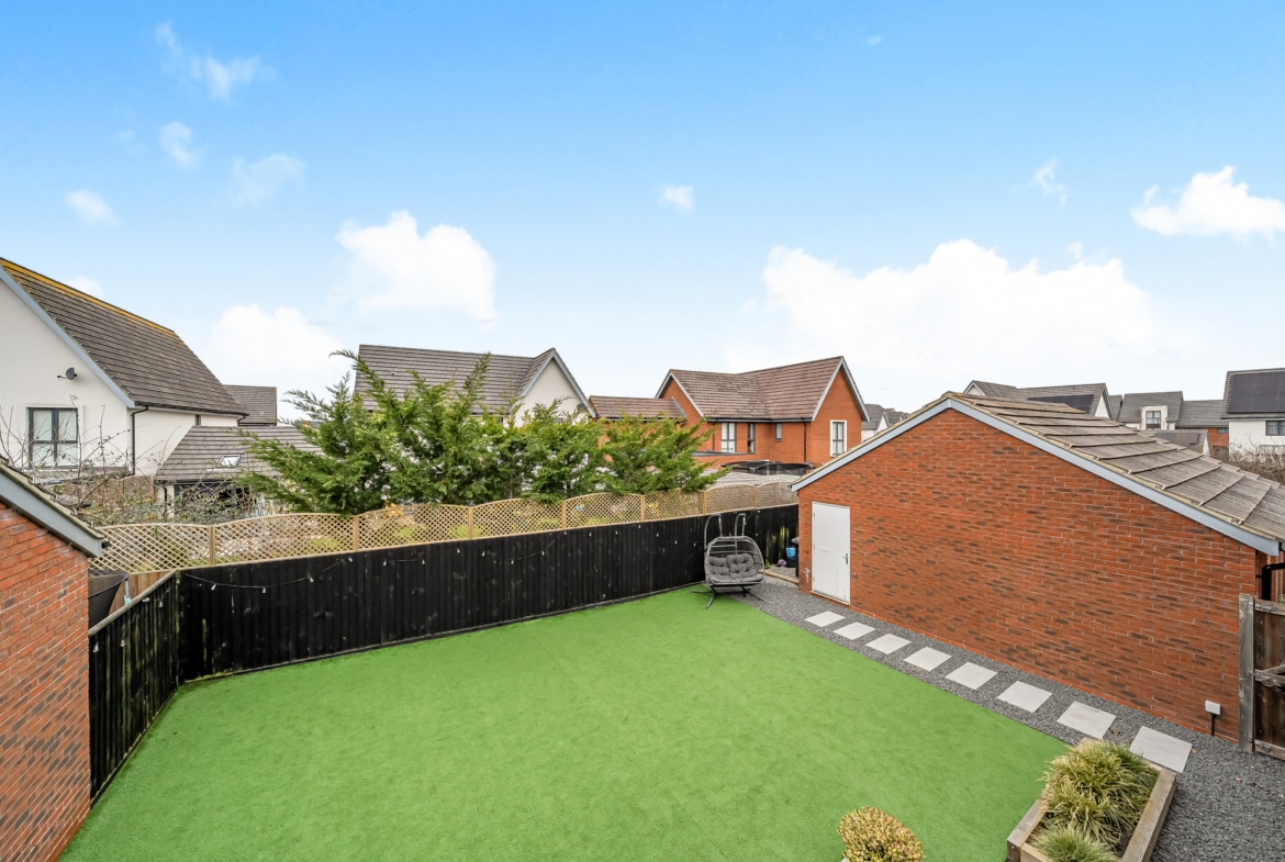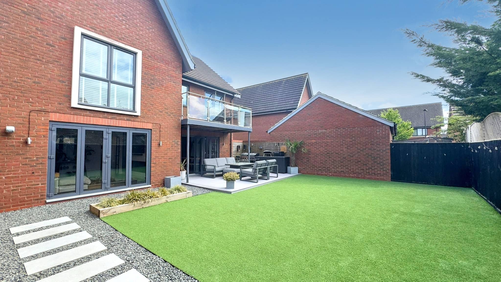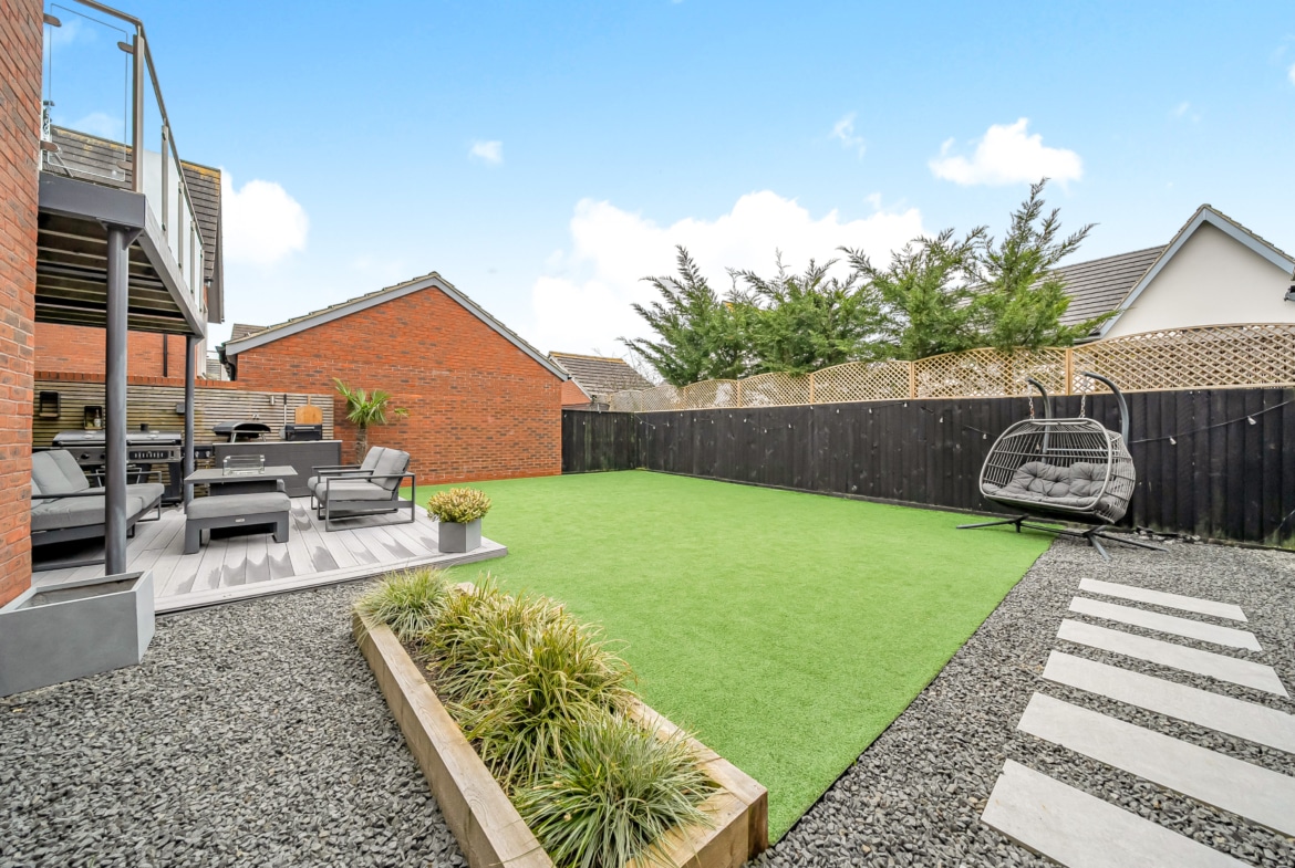 Outside, the rear garden has been thoughtfully landscaped with a combination of decking, artificial grass, and decorative stones, creating a stylish yet low-maintenance outdoor space. The property also benefits from a double garage to the side, providing ample parking and storage.