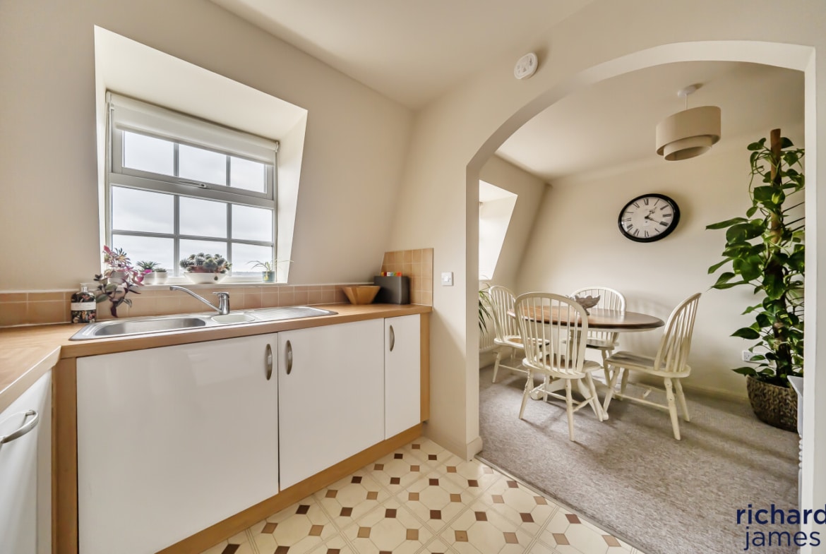The spacious reception/dining room measures over 22 feet at its maximum and is a real highlight. Dual aspect enjoying plenty of natural light and elevated views across the open green space. There is ample room for both living and dining areas, with a comfortable layout that works equally well for entertaining or everyday living, flowing naturally into the kitchen.