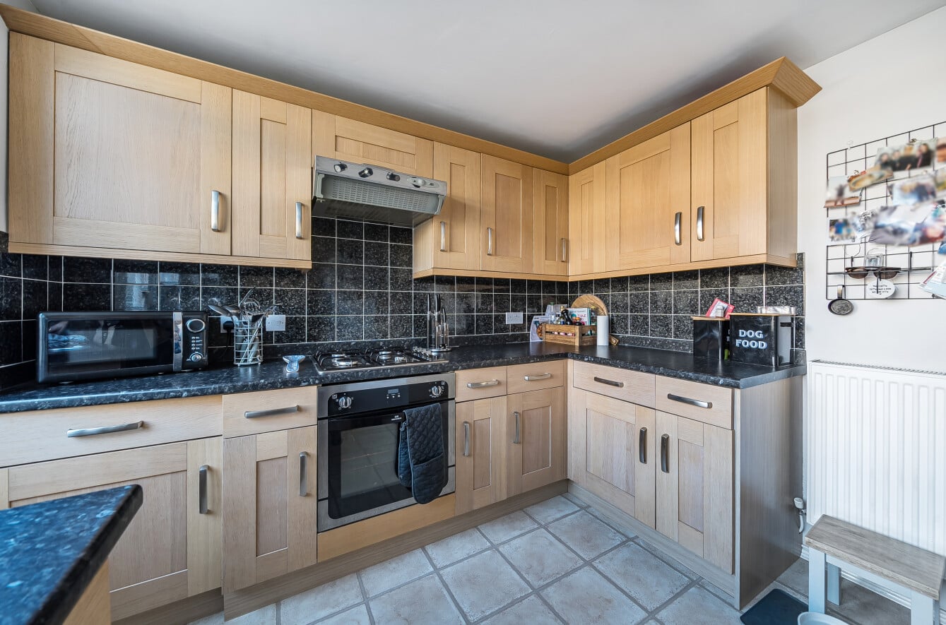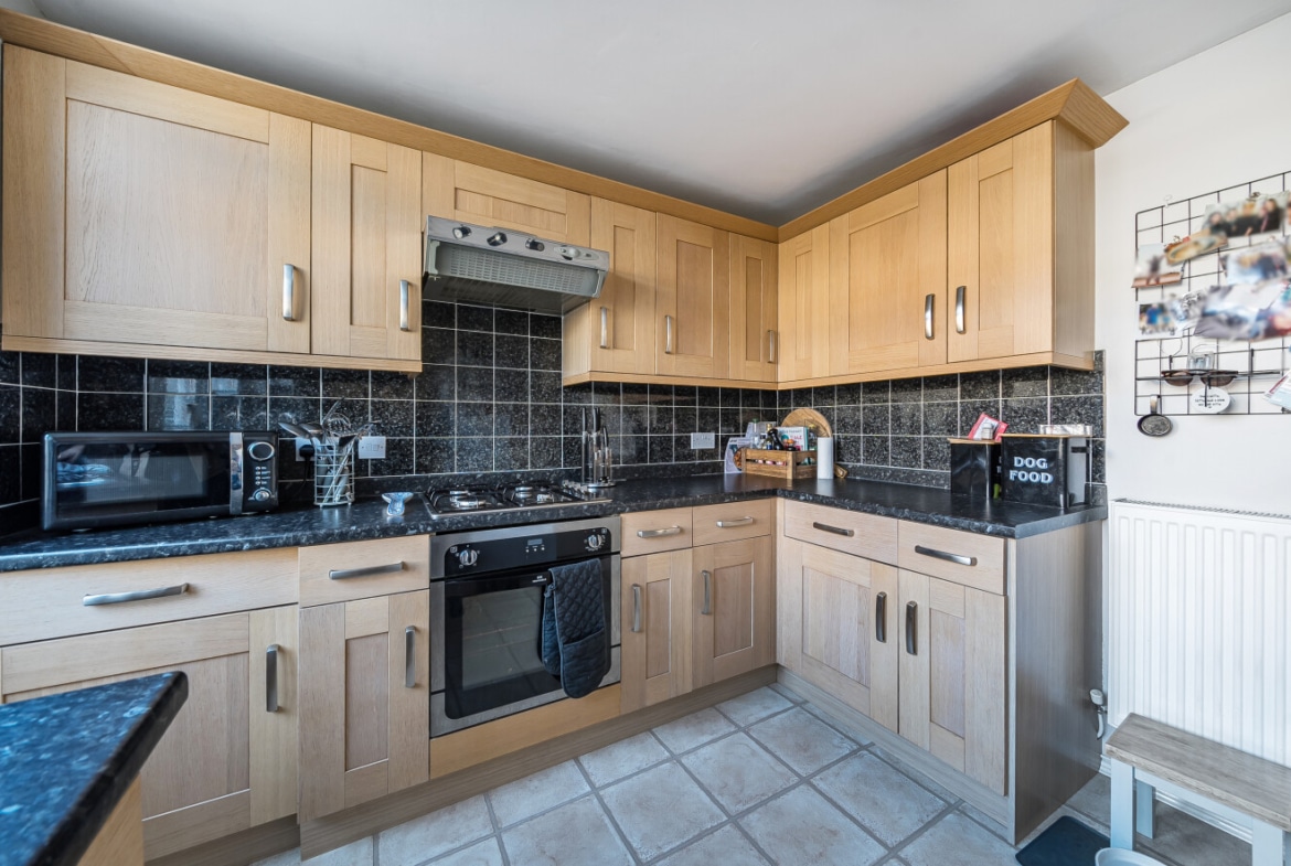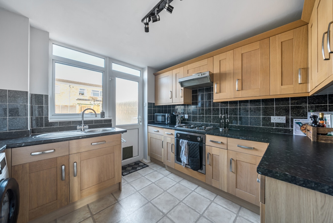To the rear of the property is a well-appointed kitchen with ample storage, providing plenty of room for everyday cooking and organisation. From here you can access the rear garden, offering a great outdoor space to relax or entertain.