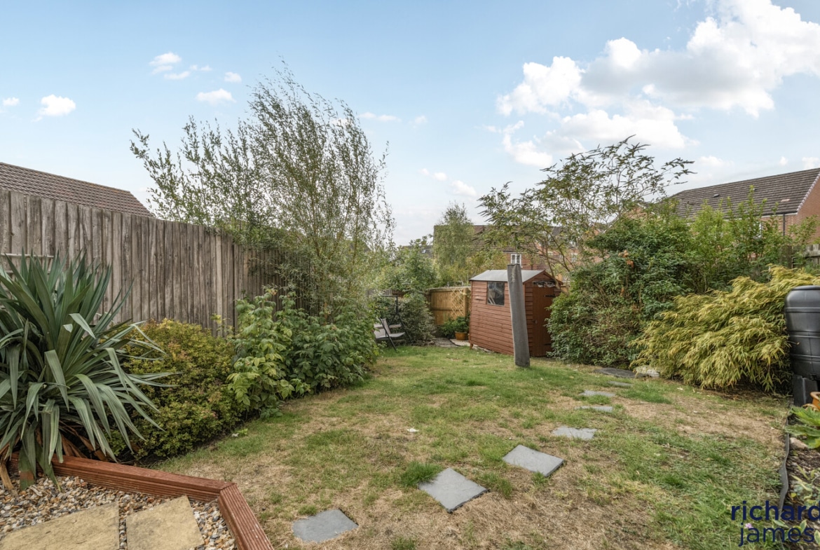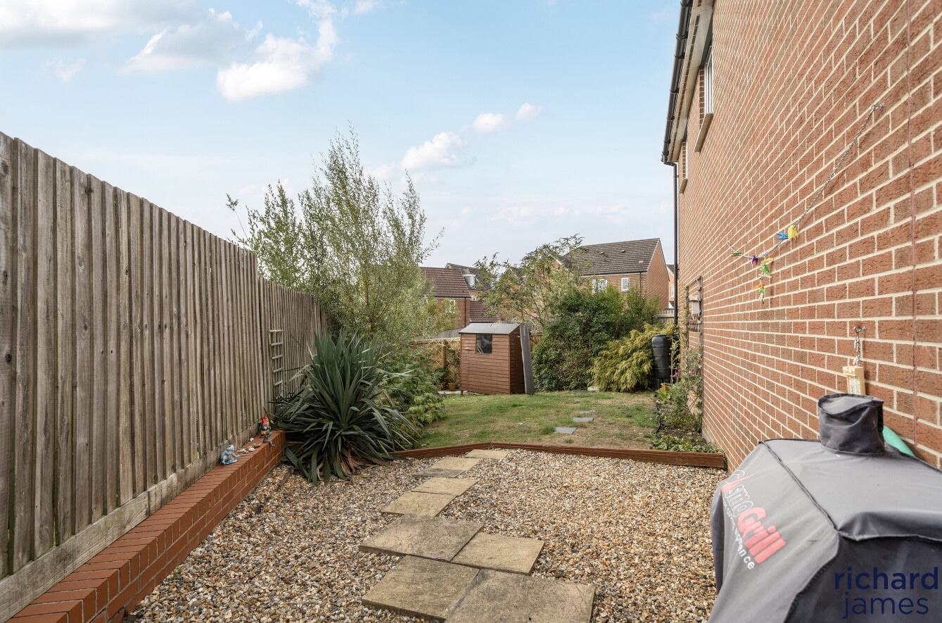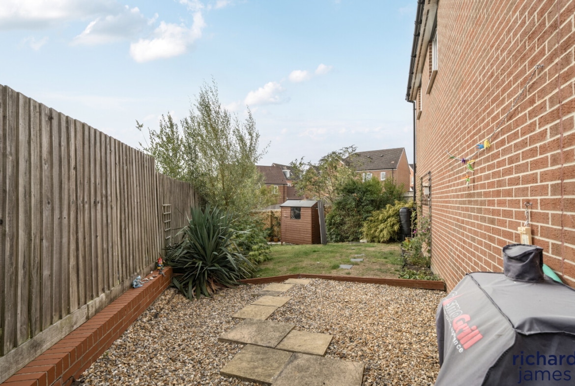 To the rear, accessed either through the garage or via a side gate, is a generous and enclosed private garden, laid to lawn and gravel, complete with a timber garden shed and close board fencing for added privacy.