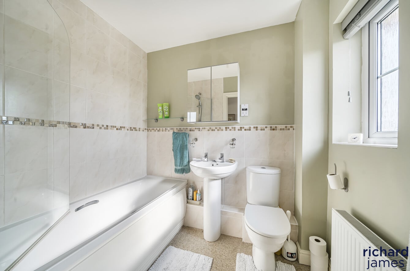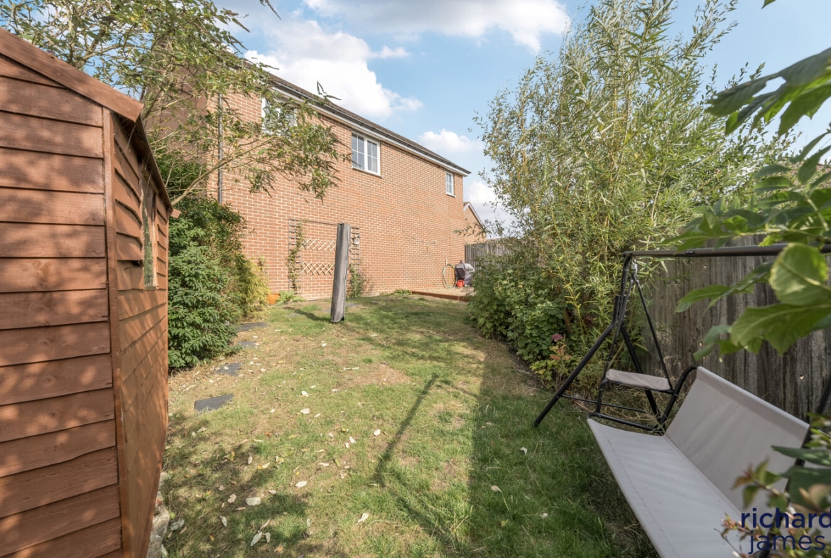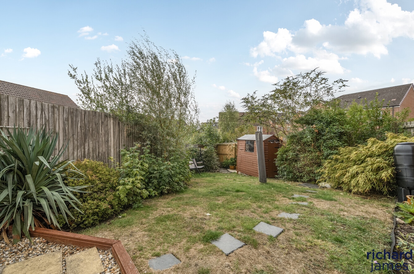 To the rear, accessed either through the garage or via a side gate, is a generous and enclosed private garden, laid to lawn and gravel, complete with a timber garden shed and close board fencing for added privacy.