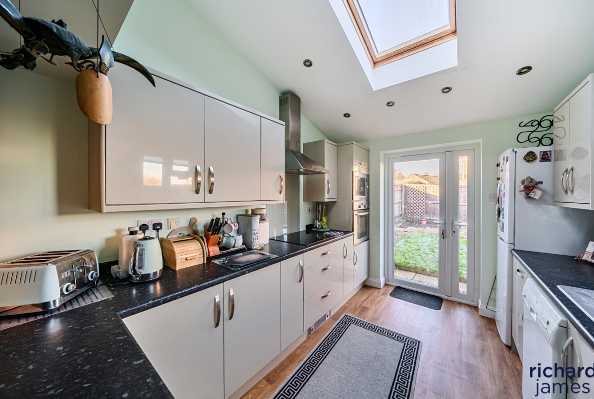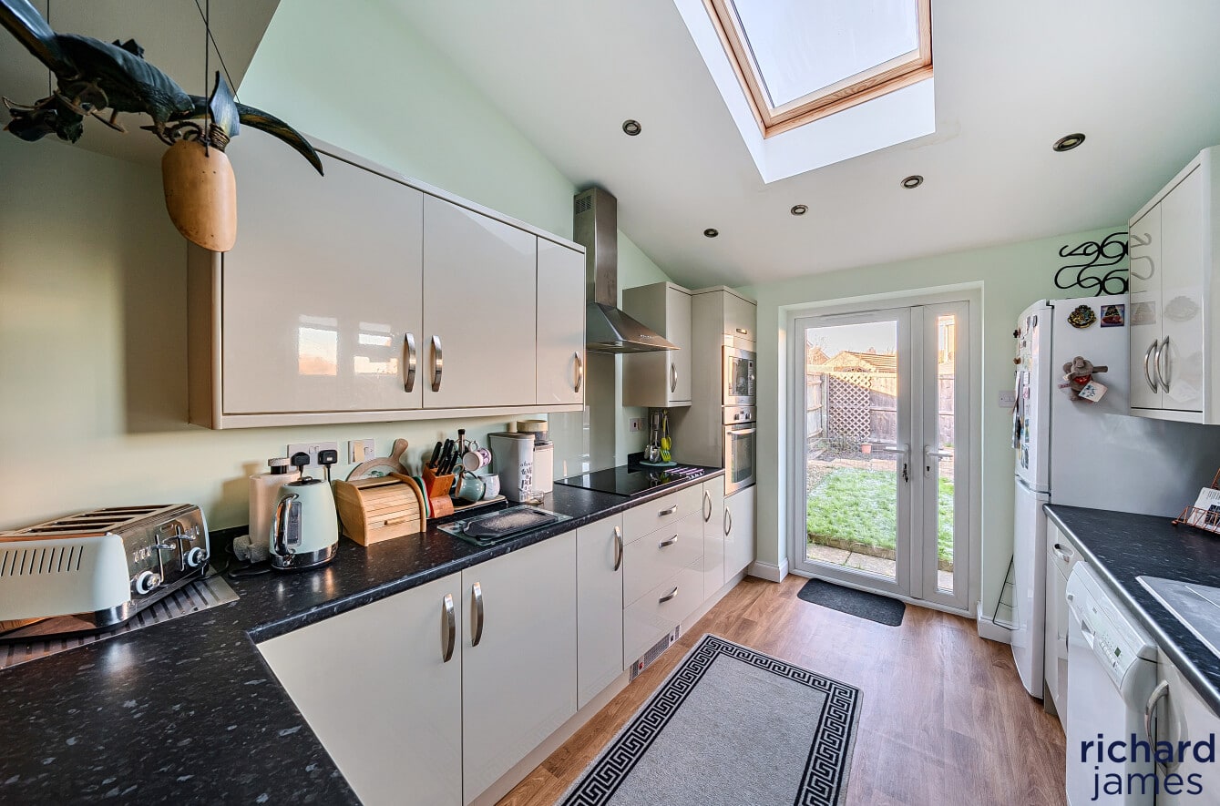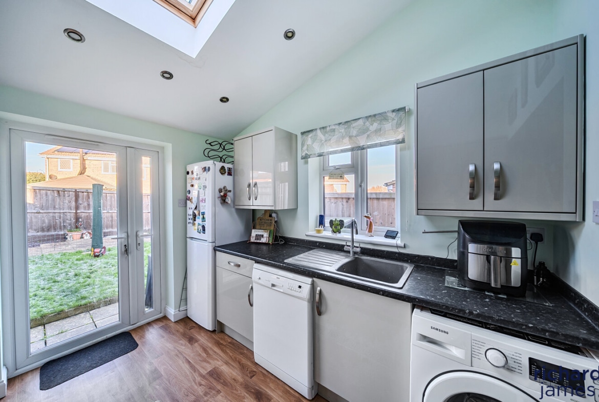 This well-presented three-bedroom house features a single-storey extension to the rear, adding valuable living space. The property opens into an entrance hall with stairs leading to the first floor. The ground floor includes a comfortable living room, a separate dining room, and a bright kitchen enhanced by an additional Velux window that provides extra natural light. A convenient downstairs W.C. and a versatile office room complete the ground-floor accommodation.