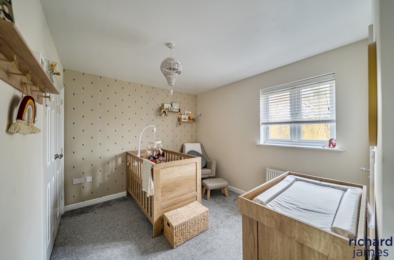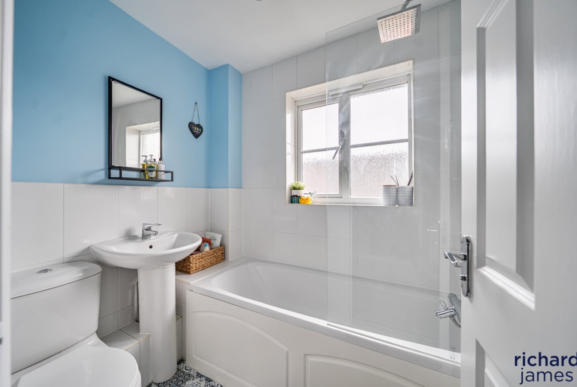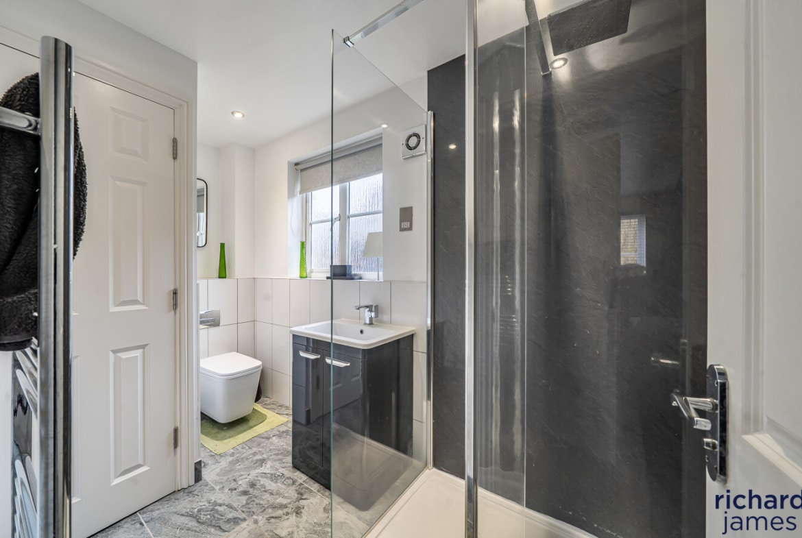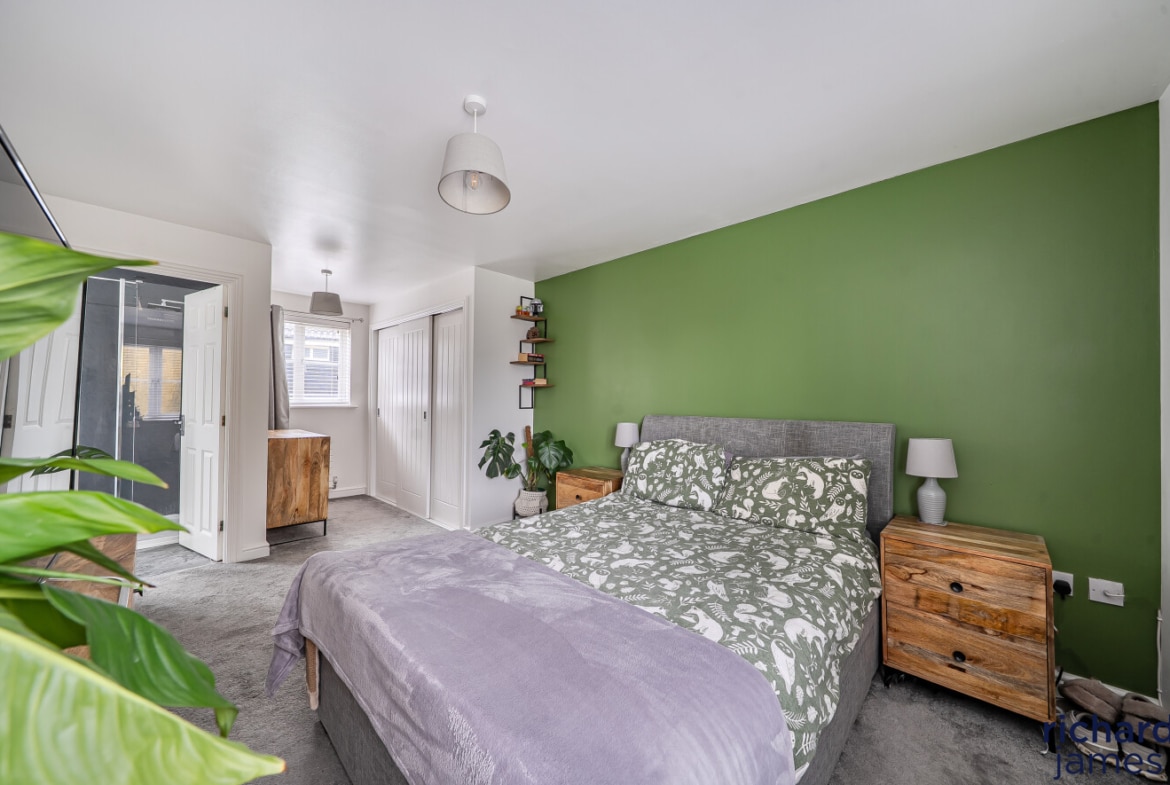 On the first floor, the property boasts an impressive master suite, providing a peaceful retreat complete with built-in wardrobes and a well-appointed ensuite bathroom. The remaining accommodation is arranged over the upper floor, where Bedroom Two also benefits from its own ensuite, while Bedroom Three is served by the family bathroom. All three bedrooms are generous doubles and include built-in wardrobes, offering excellent storage throughout.
