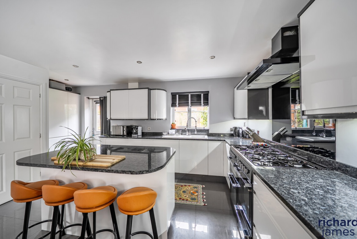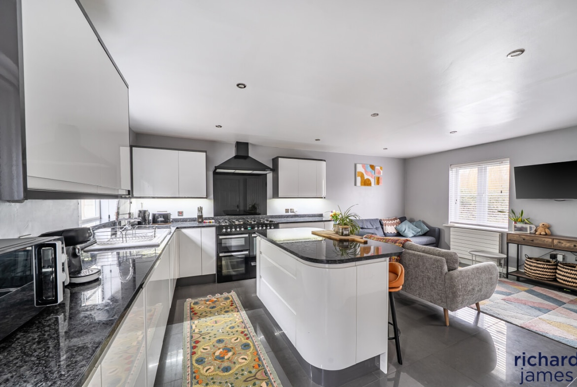 The ground floor features a spacious open-plan kitchen and living area that forms the heart of the home. Bright and welcoming, this space offers ample room for relaxing, dining, and entertaining, while enjoying a pleasant and private outlook to the front overlooking greenery, creating a calm and attractive setting.