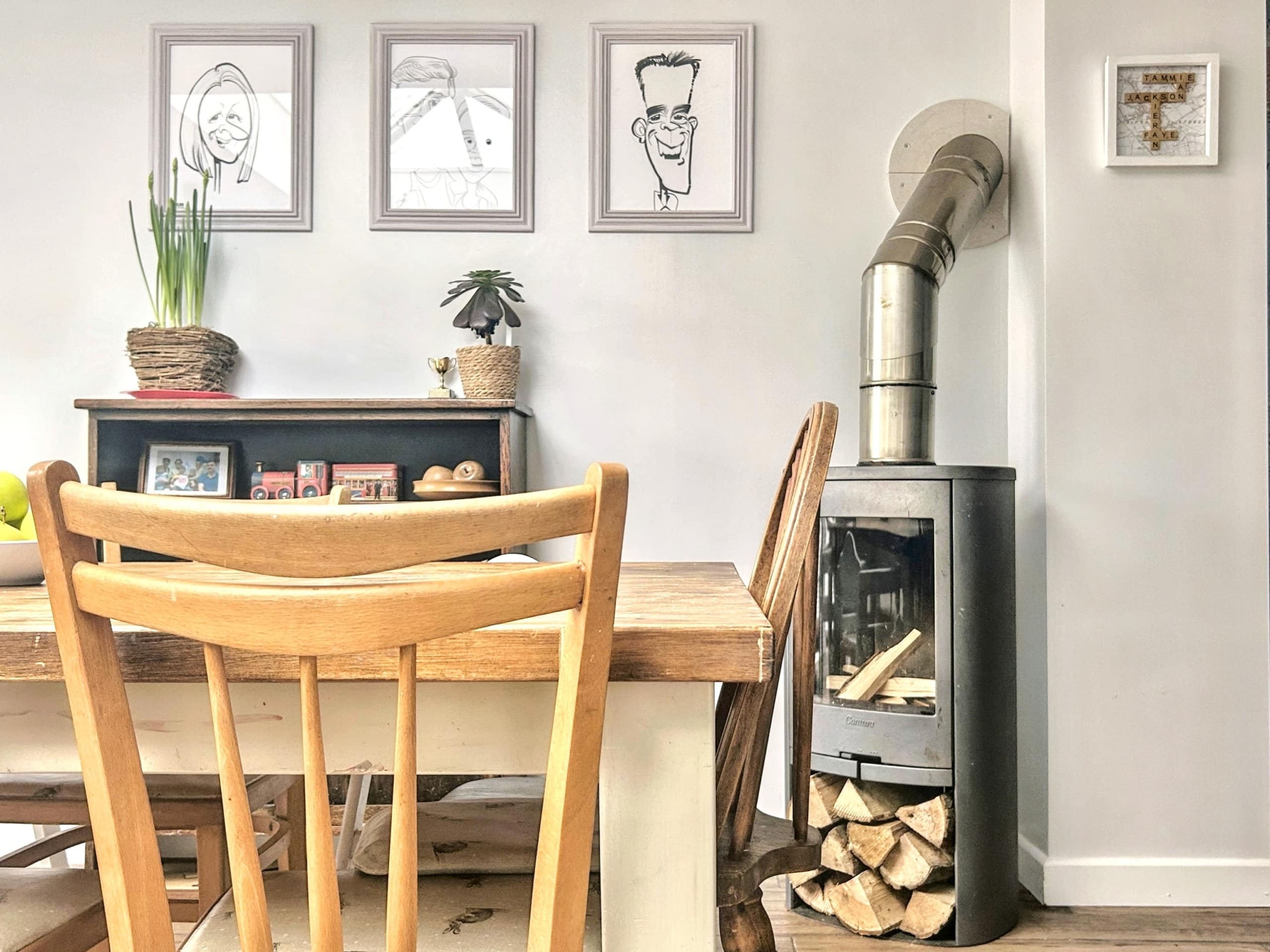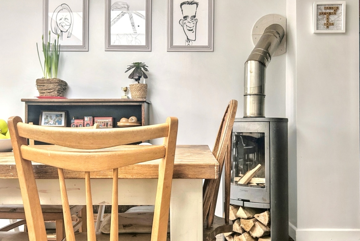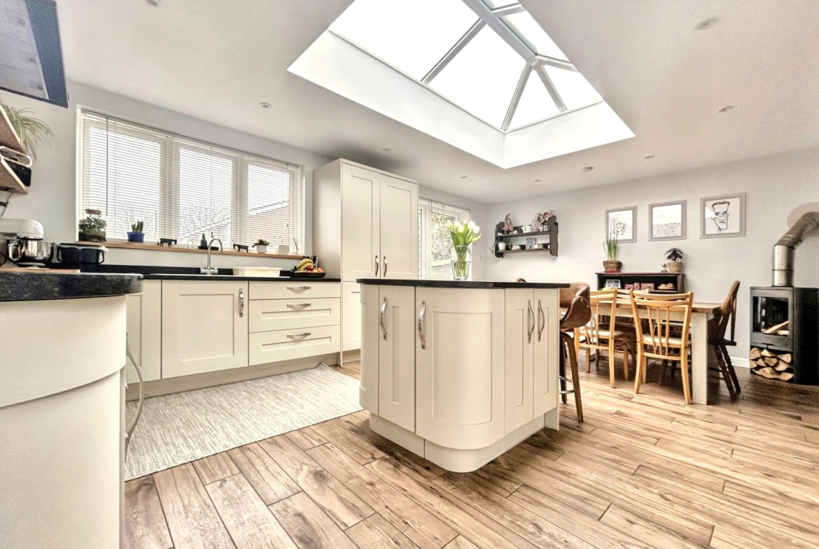 Inside, the ground floor impresses with its thoughtfully designed layout. The stunning kitchen/dining room is a true highlight, featuring a lantern roof light over the kitchen island that floods the space with natural light and a charming wood burner for cooler evenings—ideal for family meals and social gatherings. A cozy snug and a spacious living room with additional wood burner provide further options for relaxation. Practicality is key, with a convenient utility room and a downstairs WC catering to the needs of busy family life.