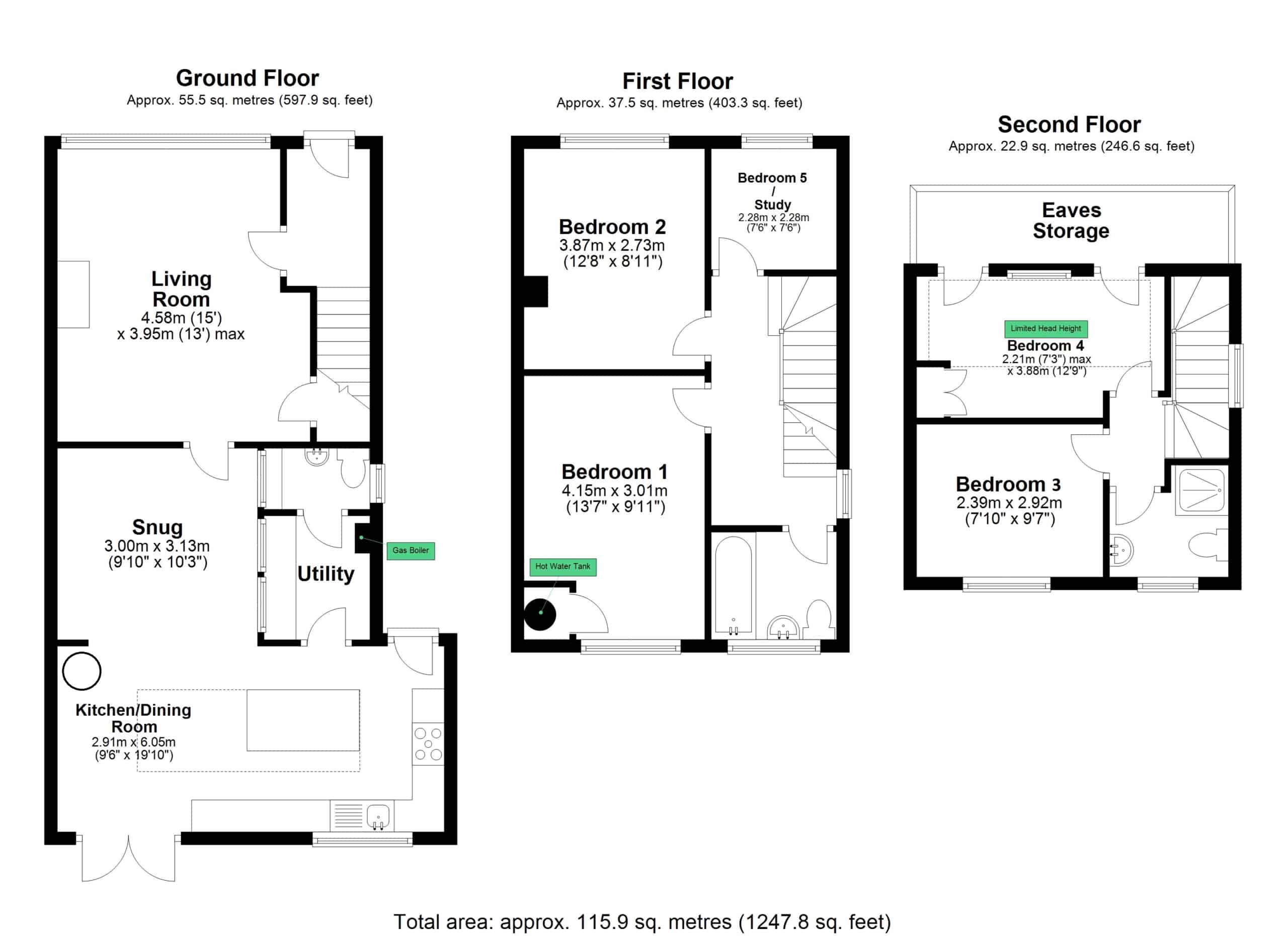 Upstairs, the first floor features a large principal bedroom, the family bathroom, a second double bedroom, and a versatile fifth bedroom/study, offering flexibility to suit your lifestyle. The second floor provides two further bedrooms, including a charming loft room with eaves storage, and a shower room.