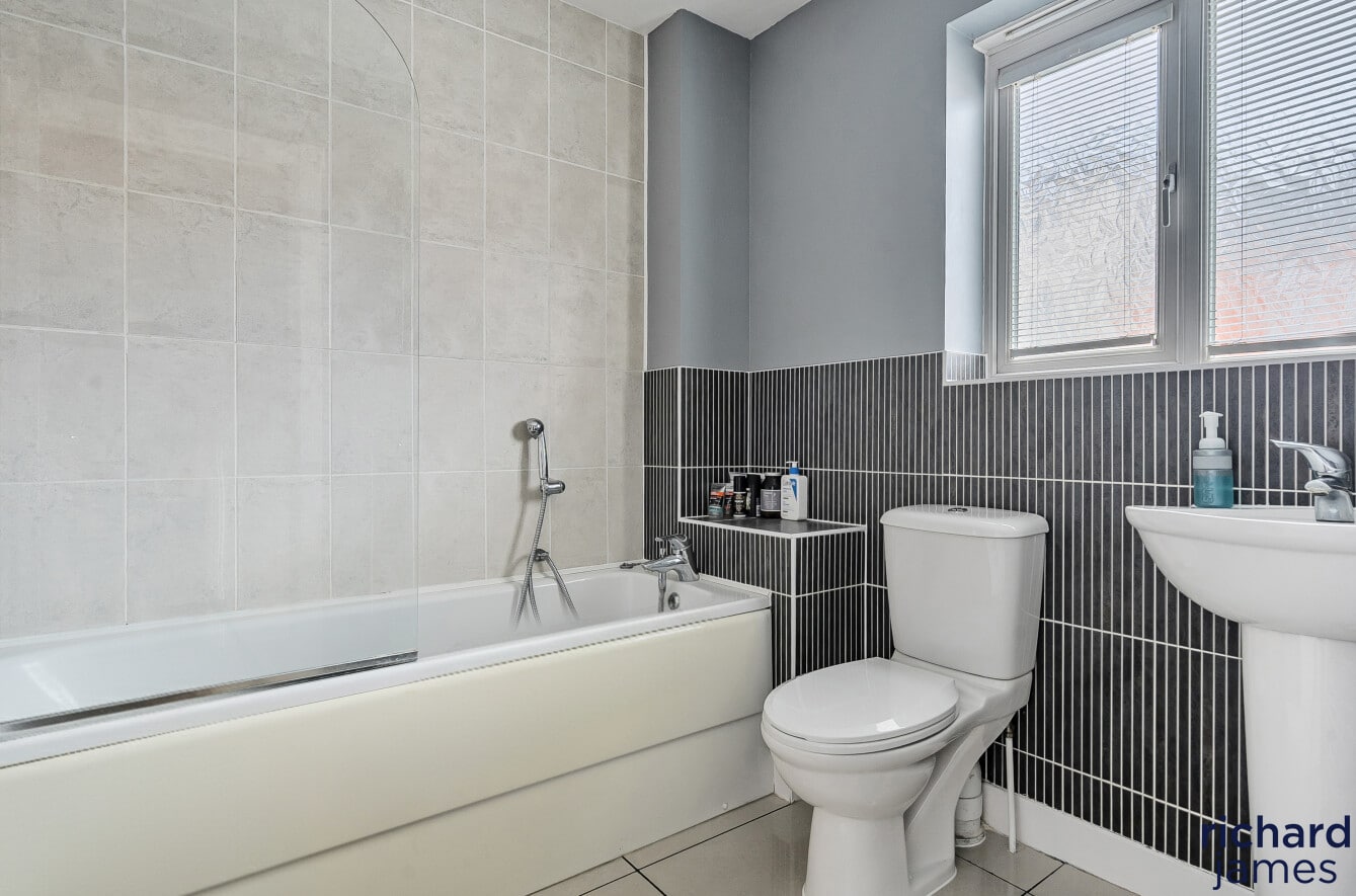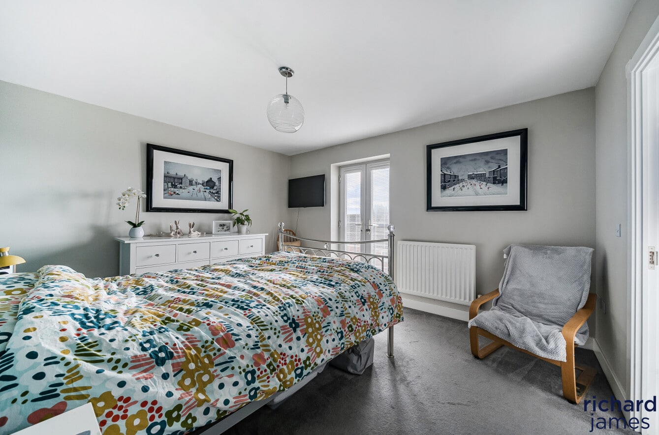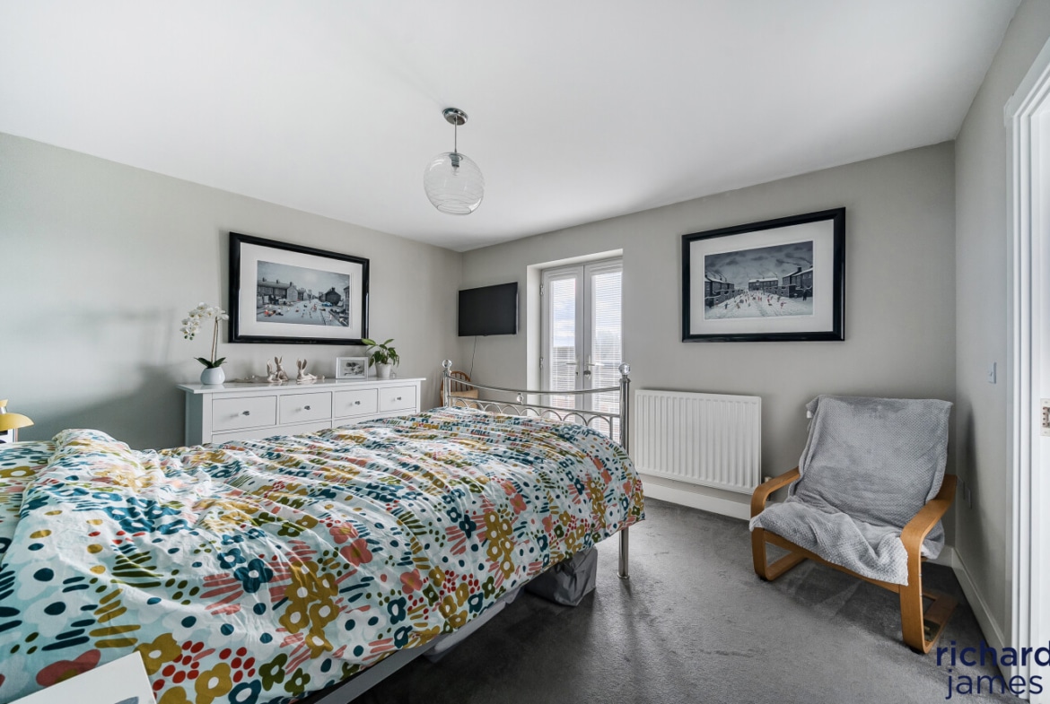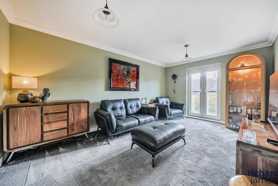 The first-floor landing guides you to a spacious living room featuring French doors and a Juliet balcony that overlook the rear garden, creating a bright and inviting atmosphere. Two further well proportioned bedrooms (bedrooms three and four) offer flexible living options, complemented by a sleek, modern family bathroom.