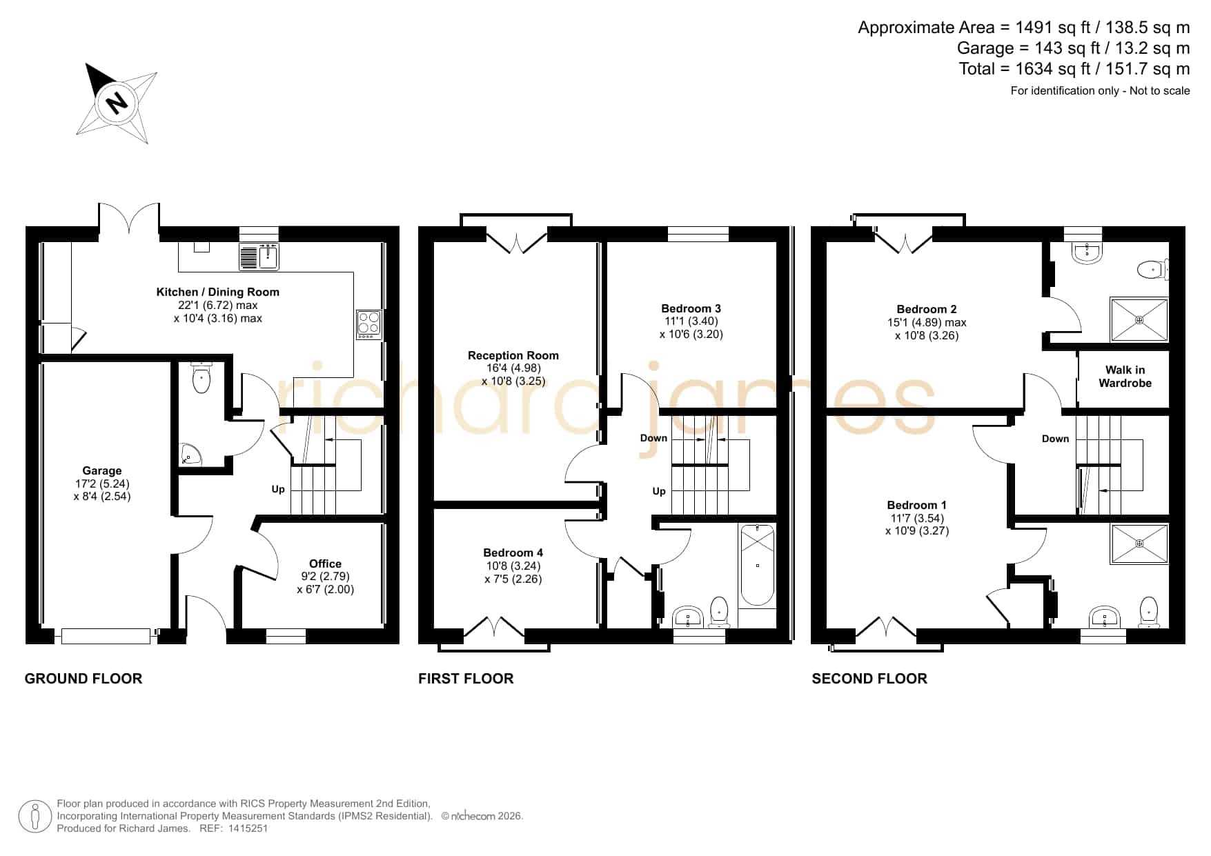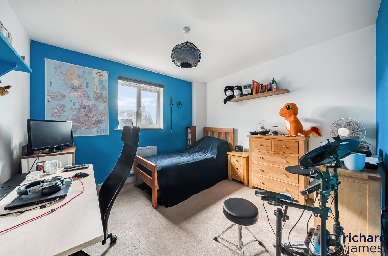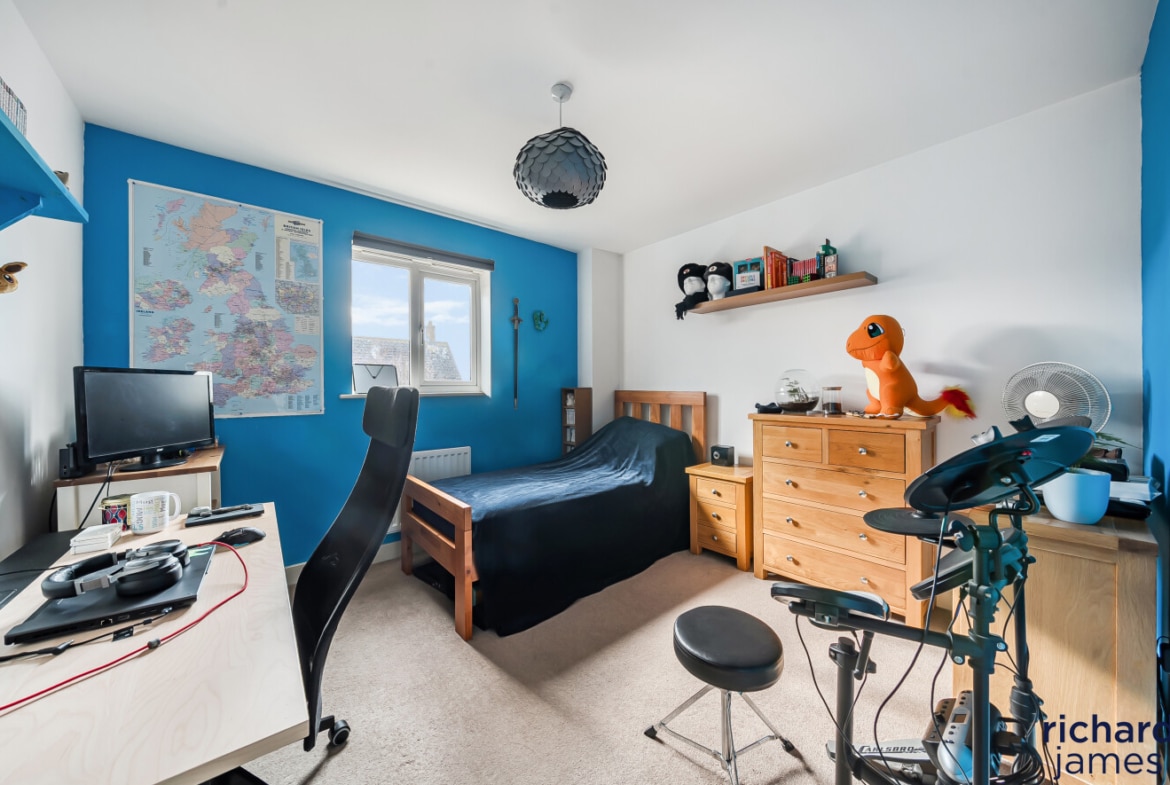 The first-floor landing guides you to a spacious living room featuring French doors and a Juliet balcony that overlook the rear garden, creating a bright and inviting atmosphere. Two further well proportioned bedrooms (bedrooms three and four) offer flexible living options, complemented by a sleek, modern family bathroom.