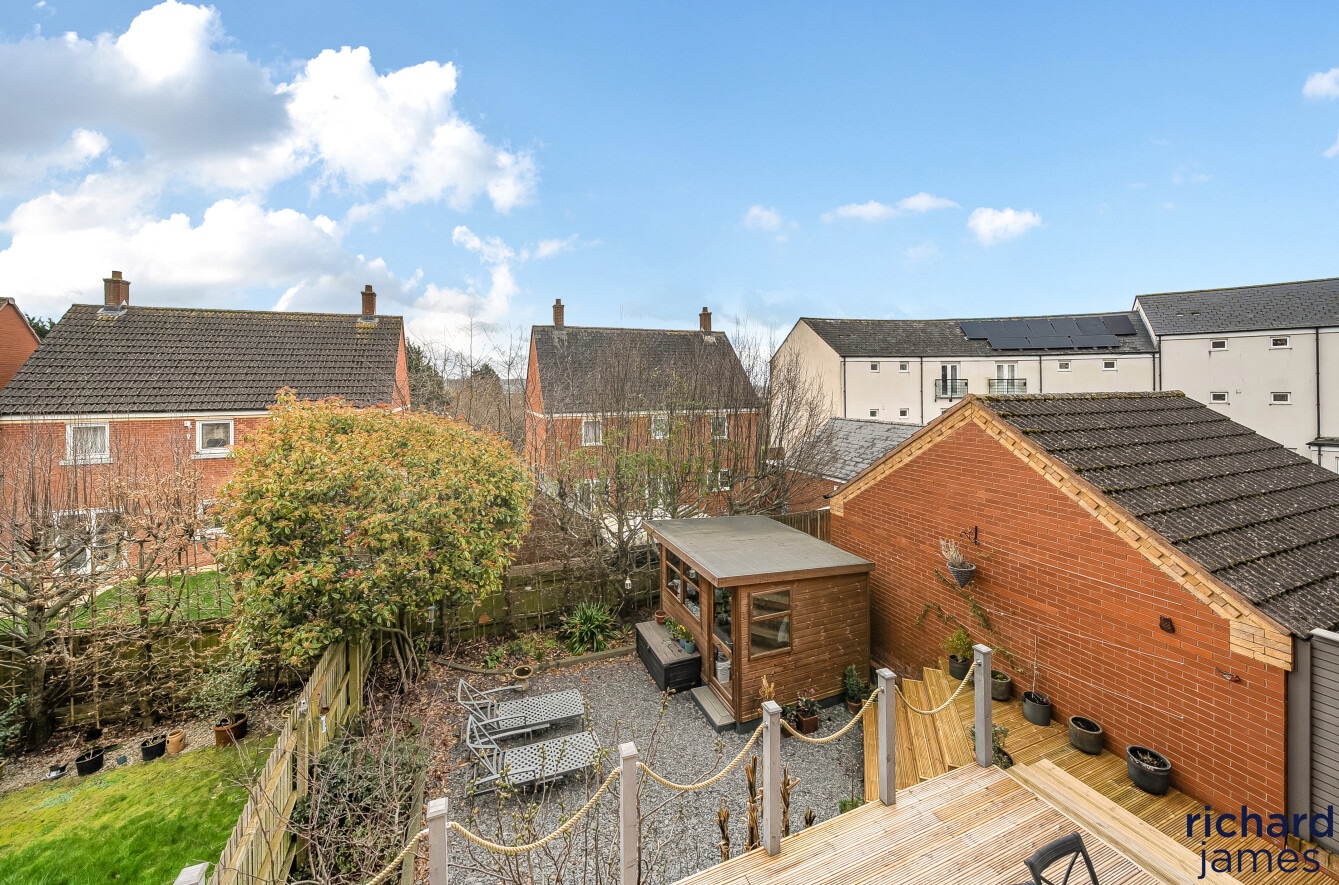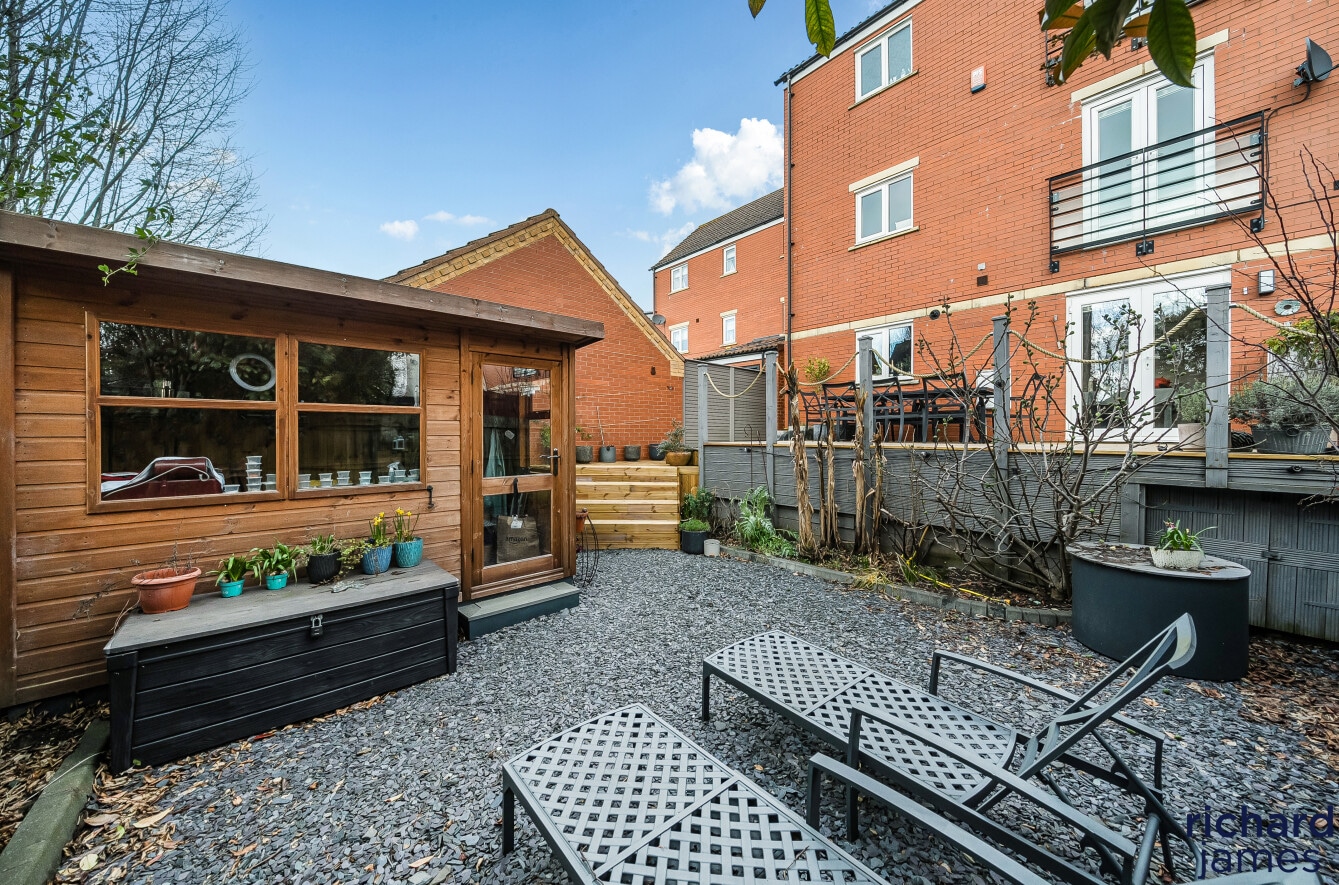 The rear garden has been thoughtfully and recently landscaped, offering a stunning raised decked seating area ideal for entertaining, with steps leading down to a private lower section featuring blue slate chippings and a generous summer house—perfect as a workshop, studio, gym, or additional storage.