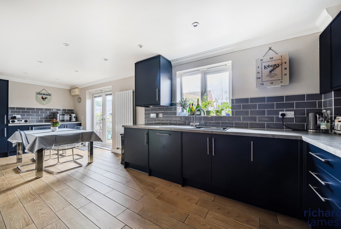 Step into a welcoming entrance hall that leads to a versatile office/study—ideal for those working from home. A convenient W.C and access to the integral garage. To the rear, the impressive modern kitchen/dining room offers a superb social hub, complete with contemporary fittings and French doors that open out onto the south facing landscaped garden, flooding the space with natural light.
