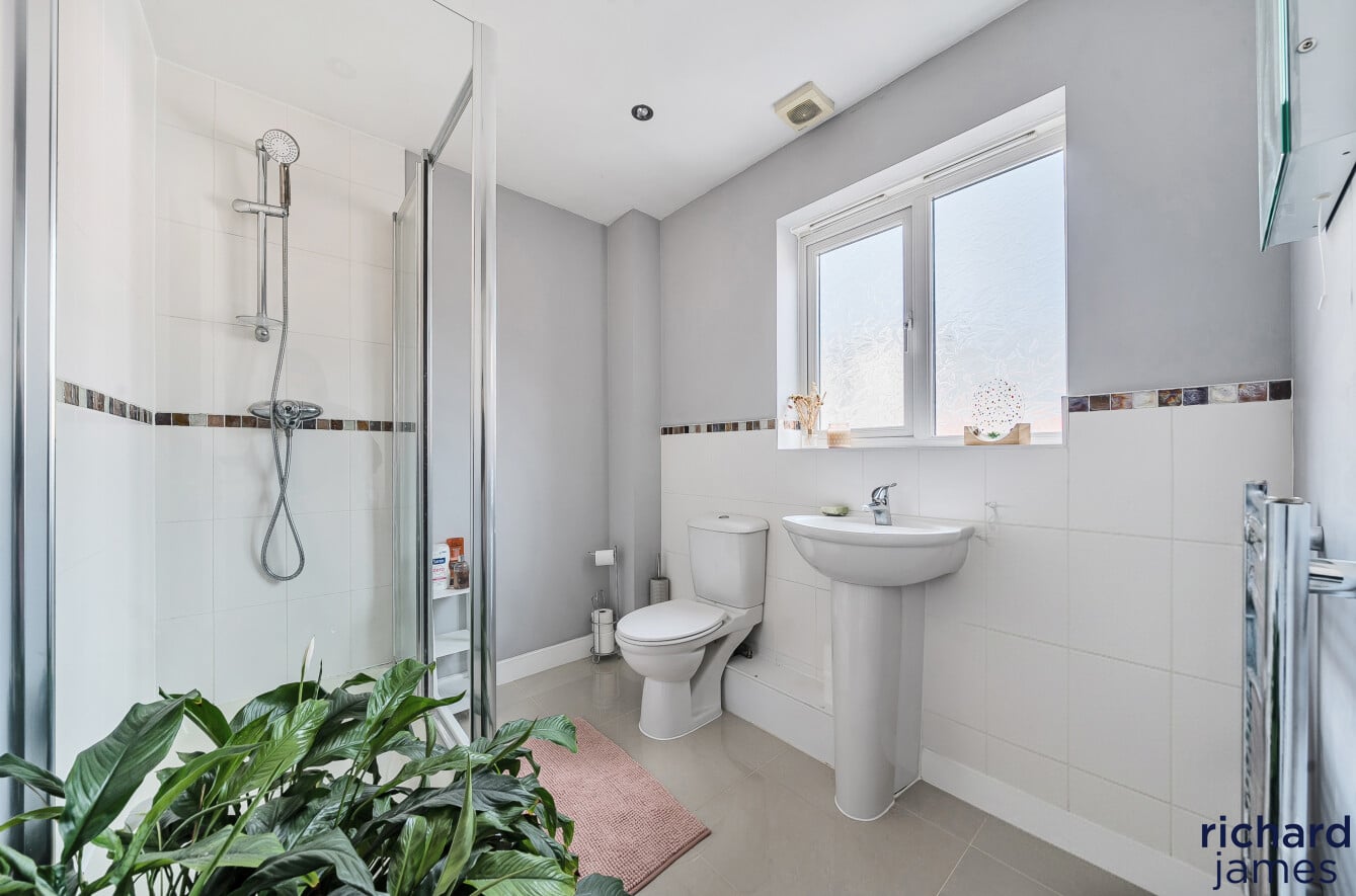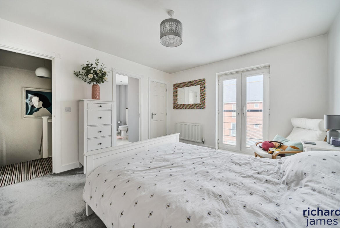 On the top floor, the second-floor landing leads to the expansive main bedroom, boasting its own Juliet balcony to the front and a stylish en suite shower room. Bedroom two is also an impressive double, benefitting from a Juliet balcony to the rear and its own en suite shower room—perfect for guests, older children, or multi generational living.