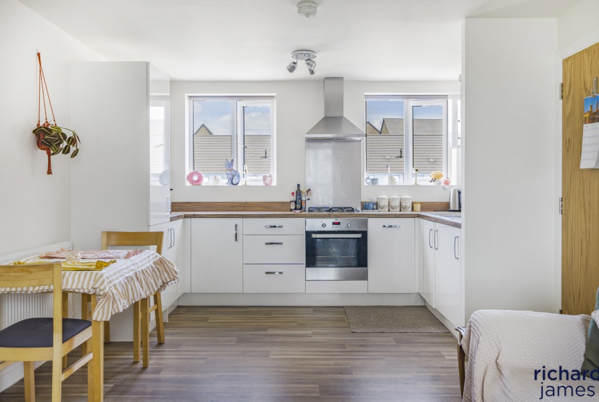 The kitchen has a modern light grey finish and has been upgraded with an integrated dishwasher and plenty of space for dining as well as living area.