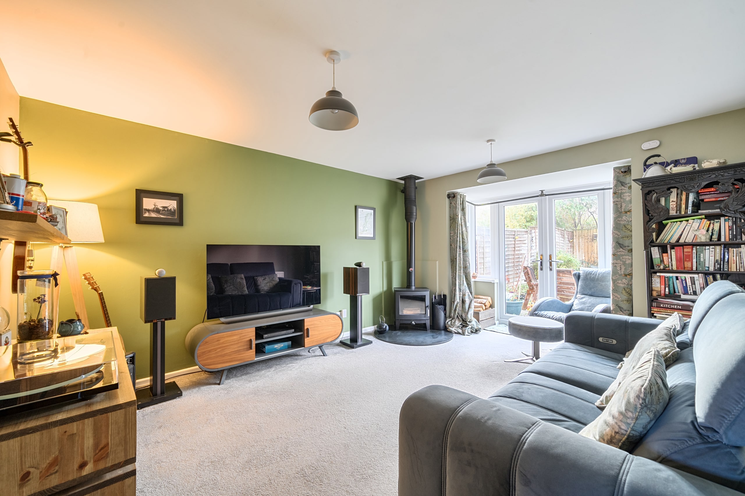 The ground floor comprises an entrance hall, dining room, generous living room with wood-burning stove and French doors to the rear garden, study, modern fitted kitchen with built-in double oven and hob, ground floor shower room, and a rear lobby providing access to the garden and garage.