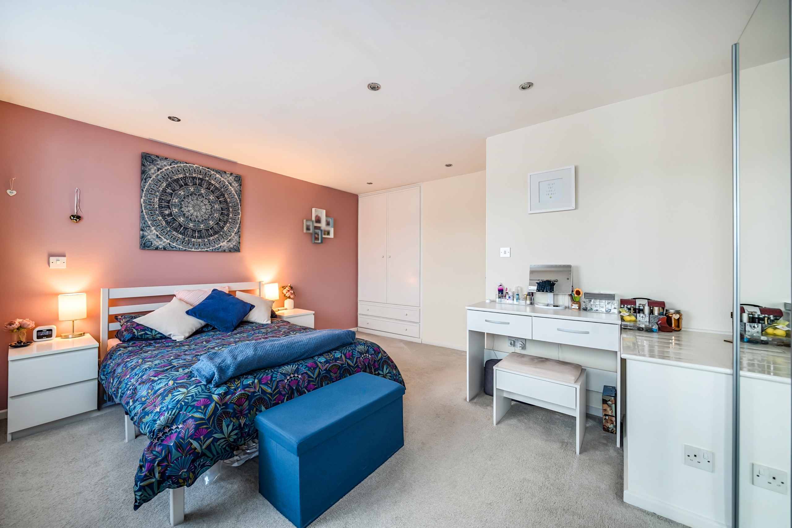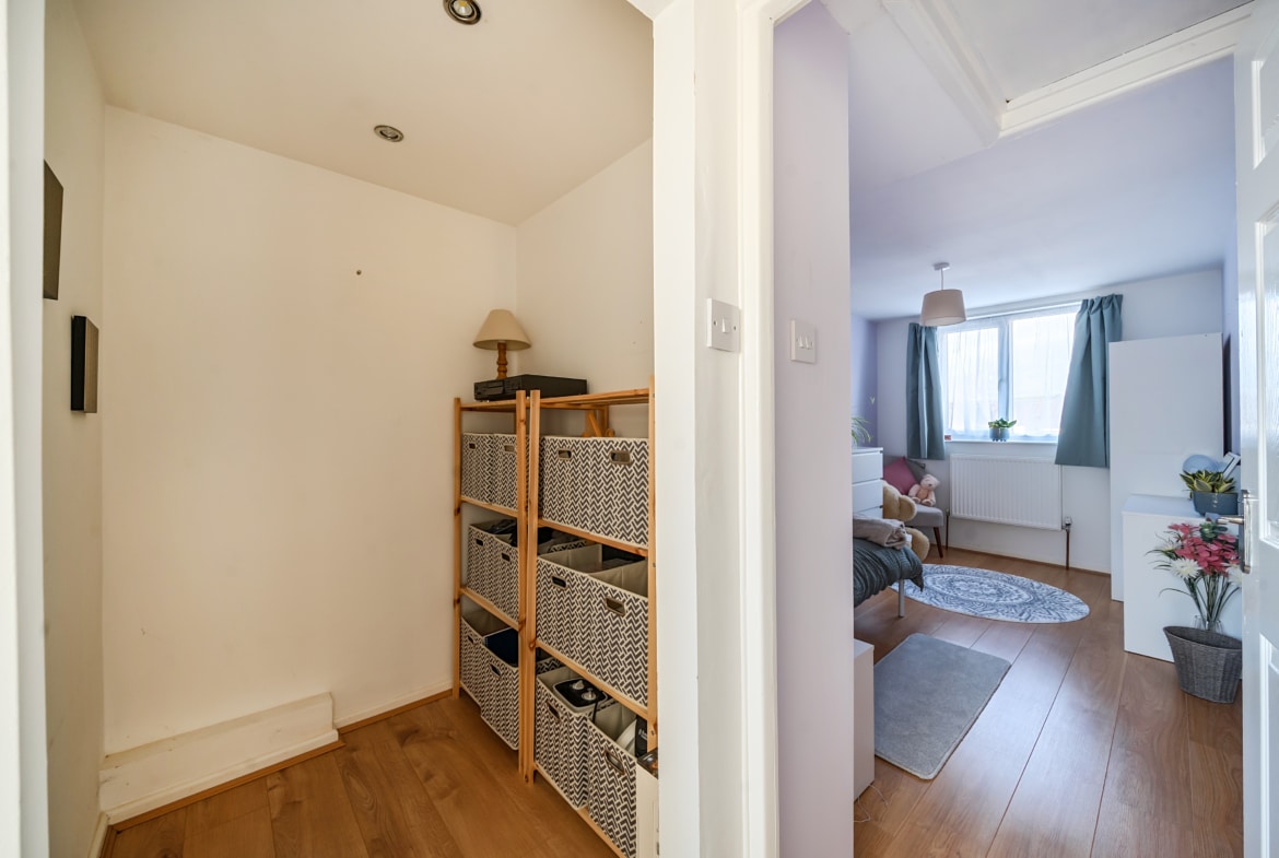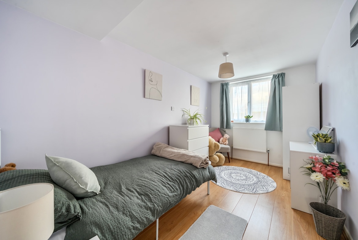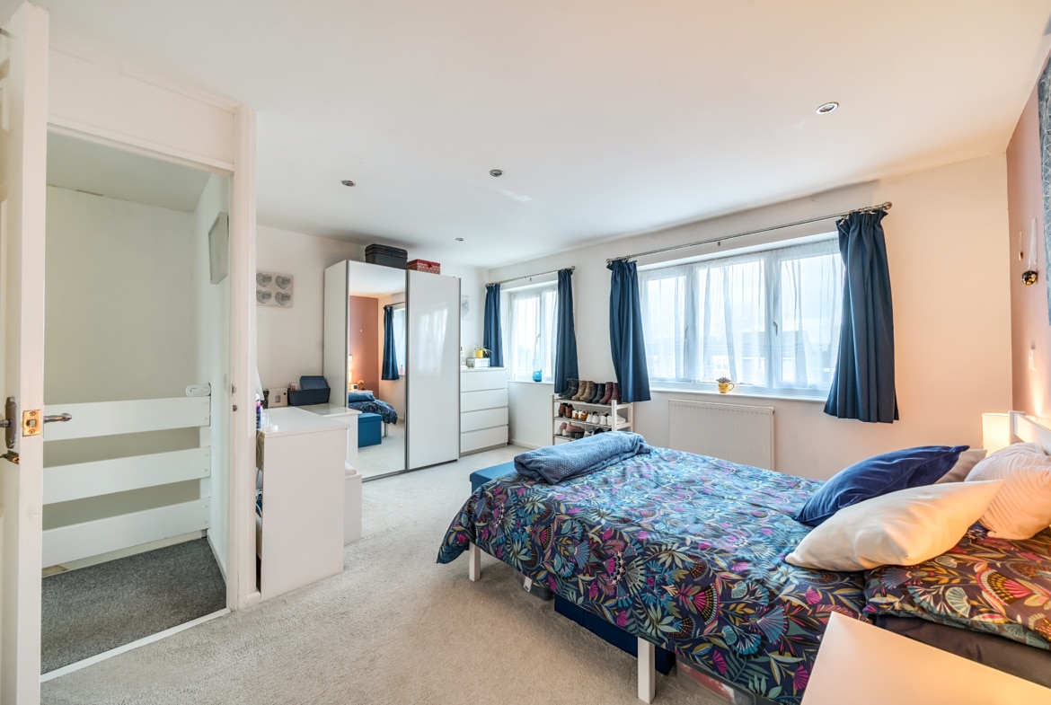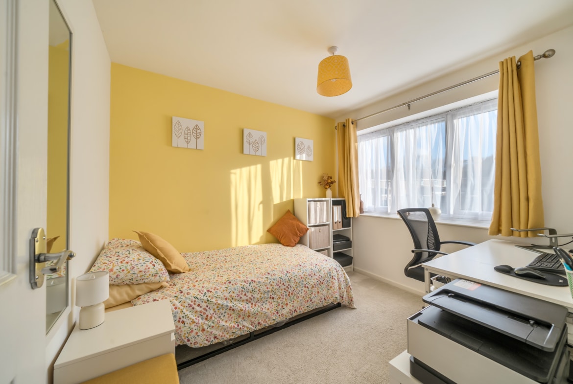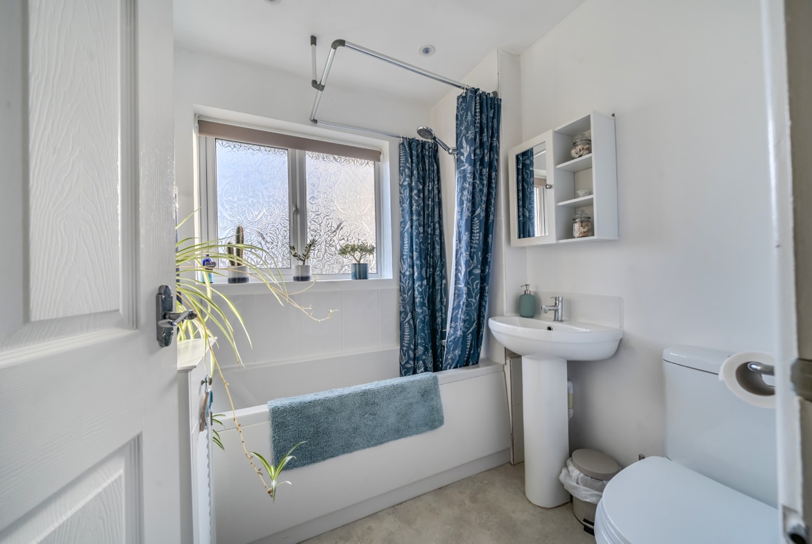 On the first floor, the accommodation continues with three well-proportioned bedrooms. The principal bedroom is a generous double, comfortably accommodating wardrobes and additional furniture. The second bedroom is also a good-sized double, while the third bedroom is ideal as a child’s room, guest bedroom or home office. A family bathroom, along with an additional bathroom featuring a shower, completes the first floor.