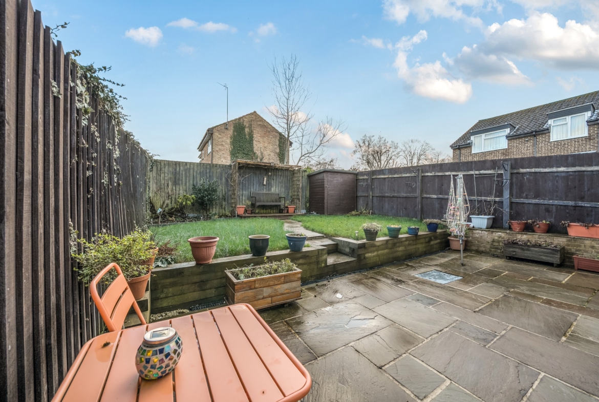 The rear garden is a real highlight, offering a combination of paved patio seating areas and a raised lawn, ideal for outdoor dining, entertaining, or relaxing in privacy. Fencing encloses the garden, creating a secure and pleasant outdoor space.