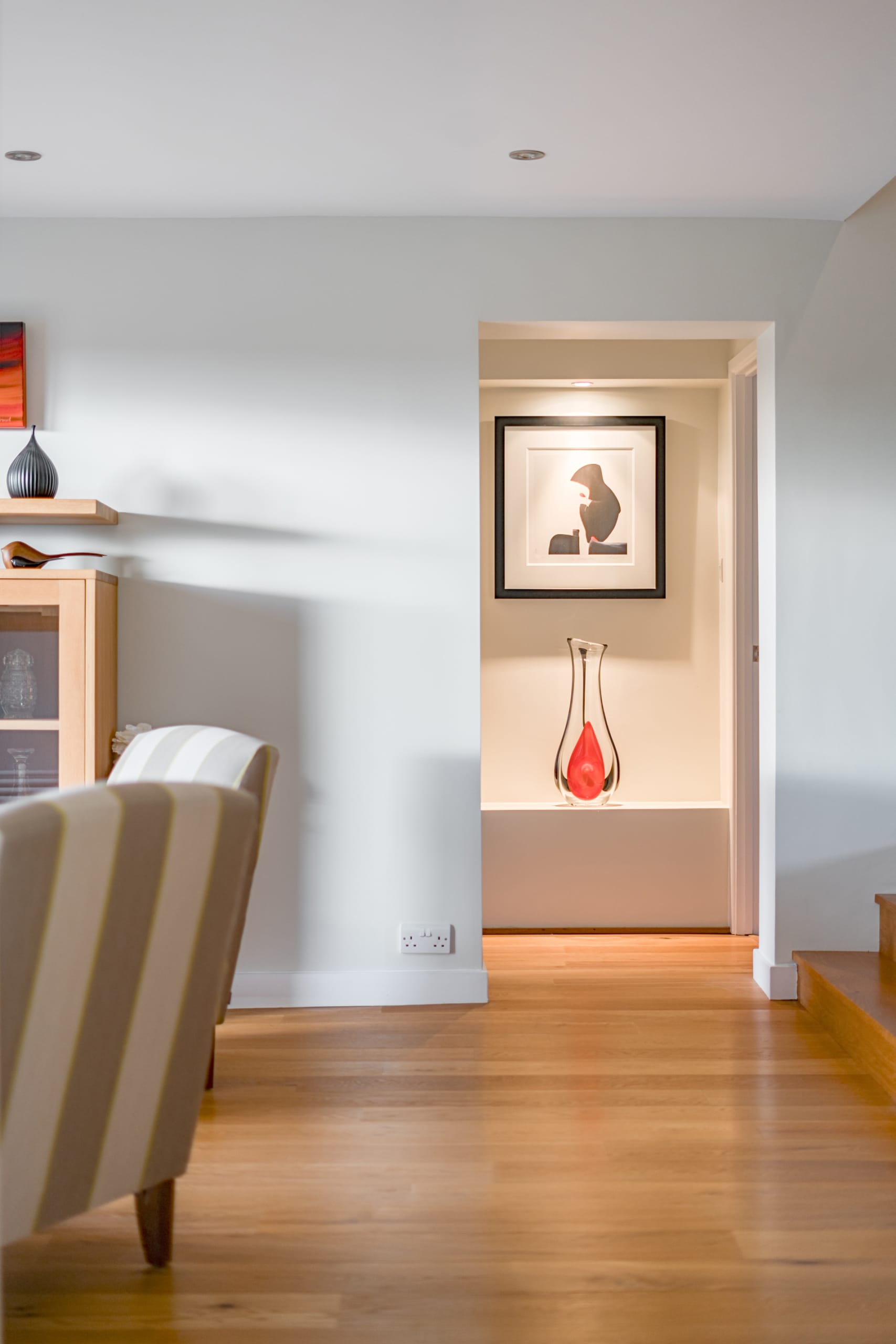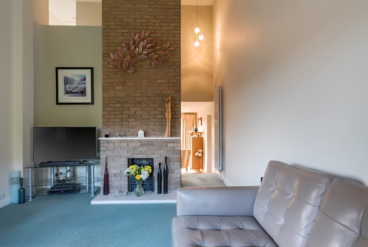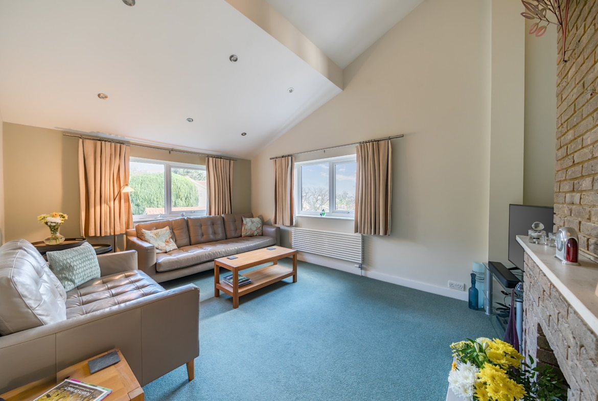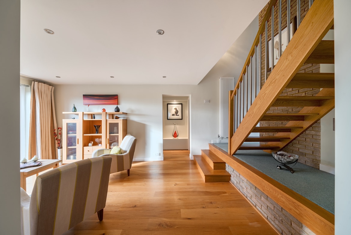 Behind its understated façade lies a wonderfully unique internal layout, where design and light take centre stage. The two principal reception spaces are particularly impressive: the lounge features a dramatic vaulted ceiling and a striking floor-to-ceiling stone chimney breast, while the open oak staircase rises elegantly through the heart of the home, establishing a statement of craftsmanship and style.