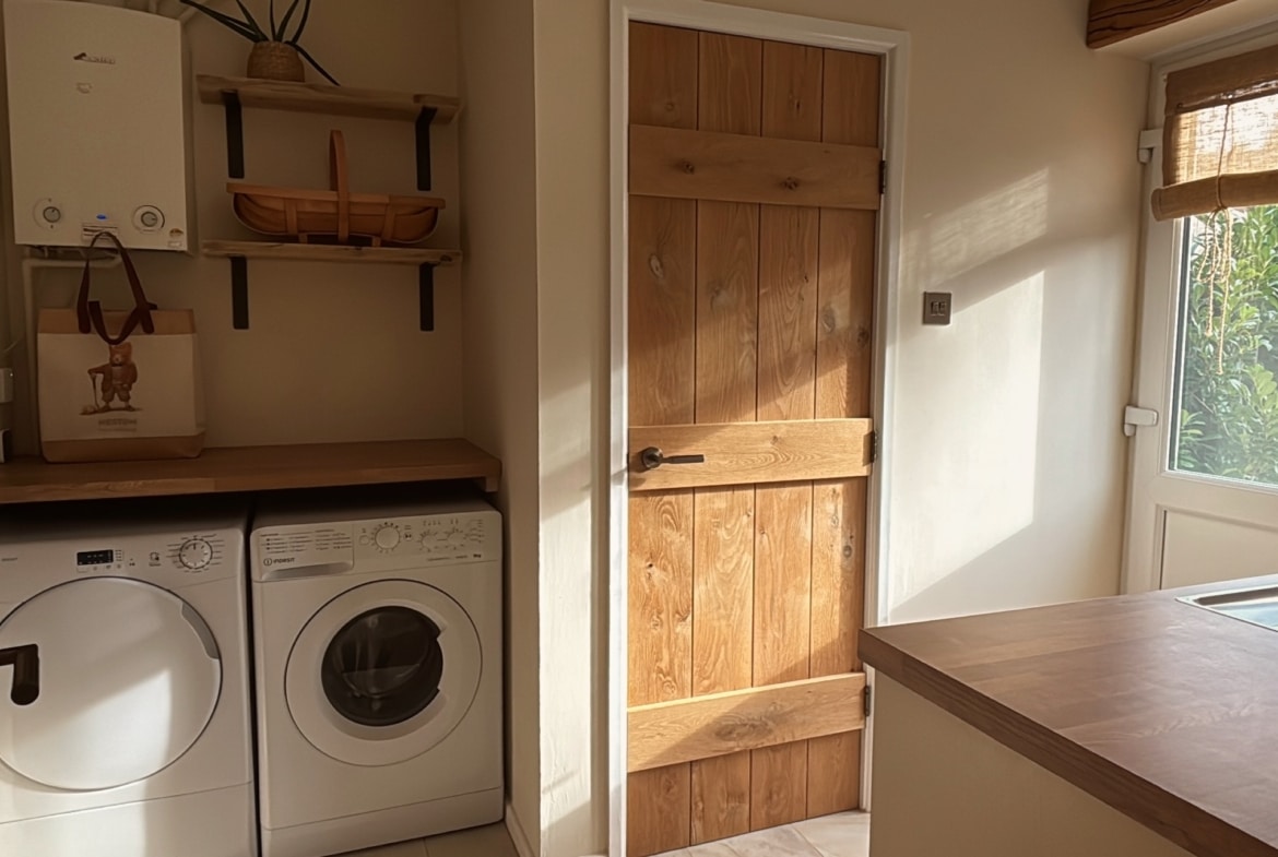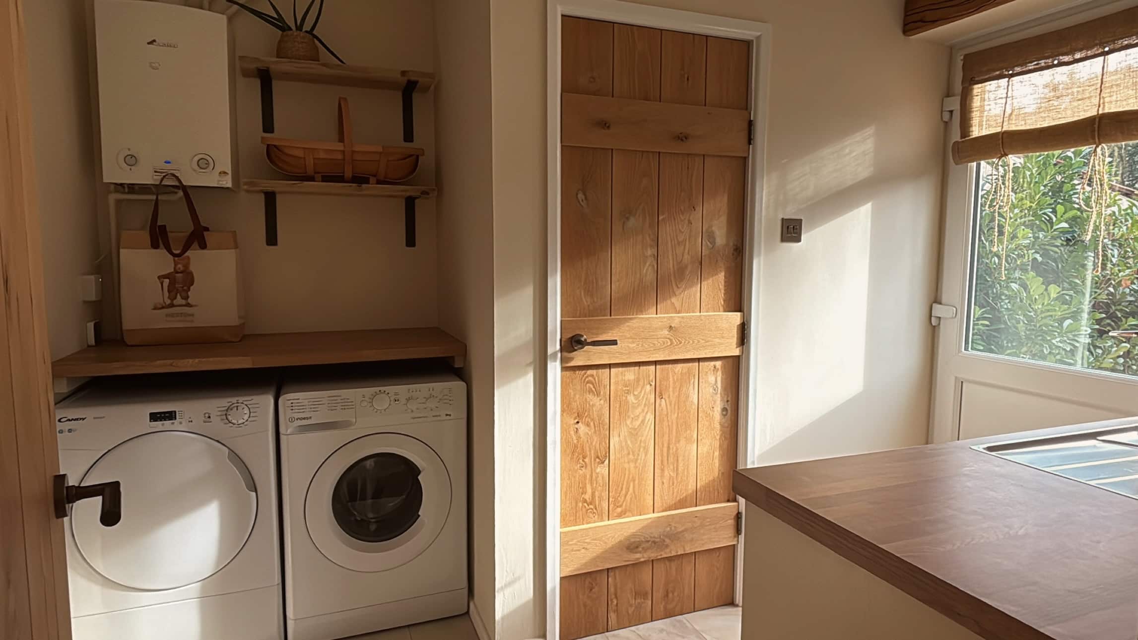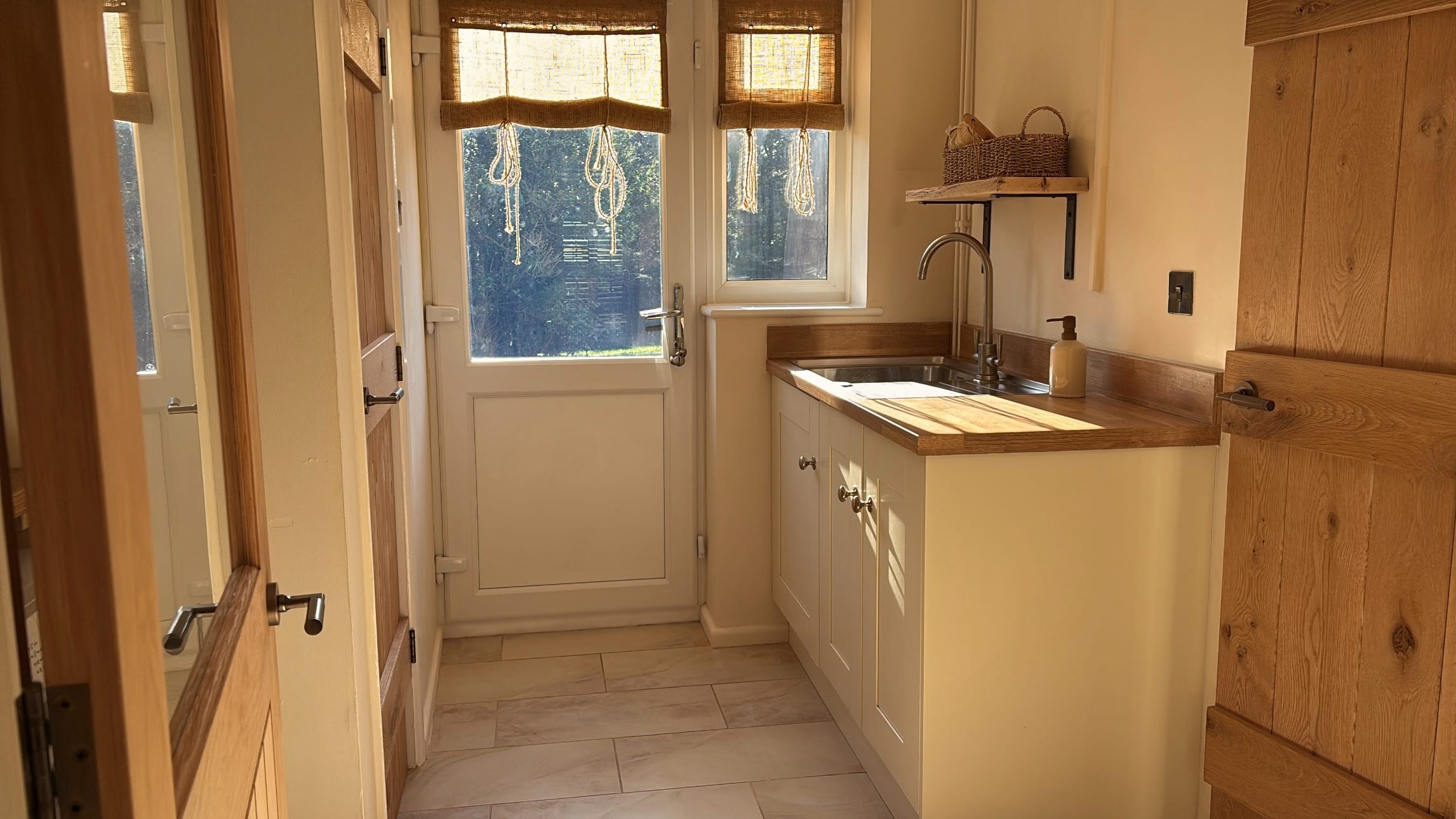 Inside, the accommodation is light and inviting. The welcoming entrance hall leads to a tastefully decorated living room, complete with a charming window seat set within a bay window — the perfect spot to relax. From here, you step into the sunny, open-plan kitchen/dining room, featuring a breakfast bar, integrated appliances, and French doors which open directly onto the south-facing rear garden — making it ideal for entertaining. This home also boasts a very generously sized utility room with ample space for laundry appliances, along with a convenient downstairs WC and a second door leading out to the garden.