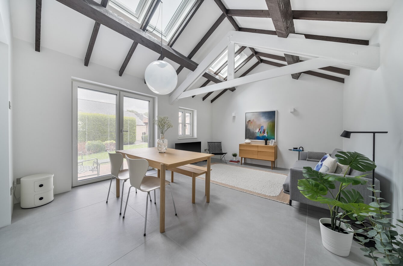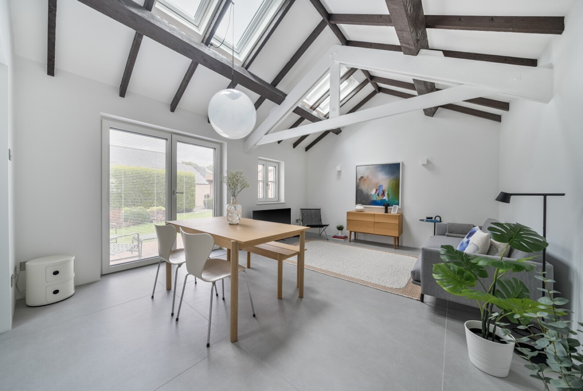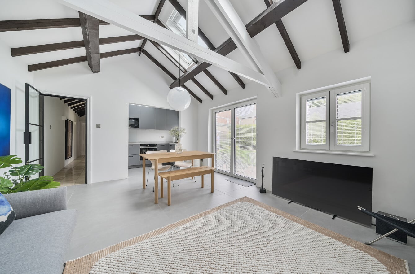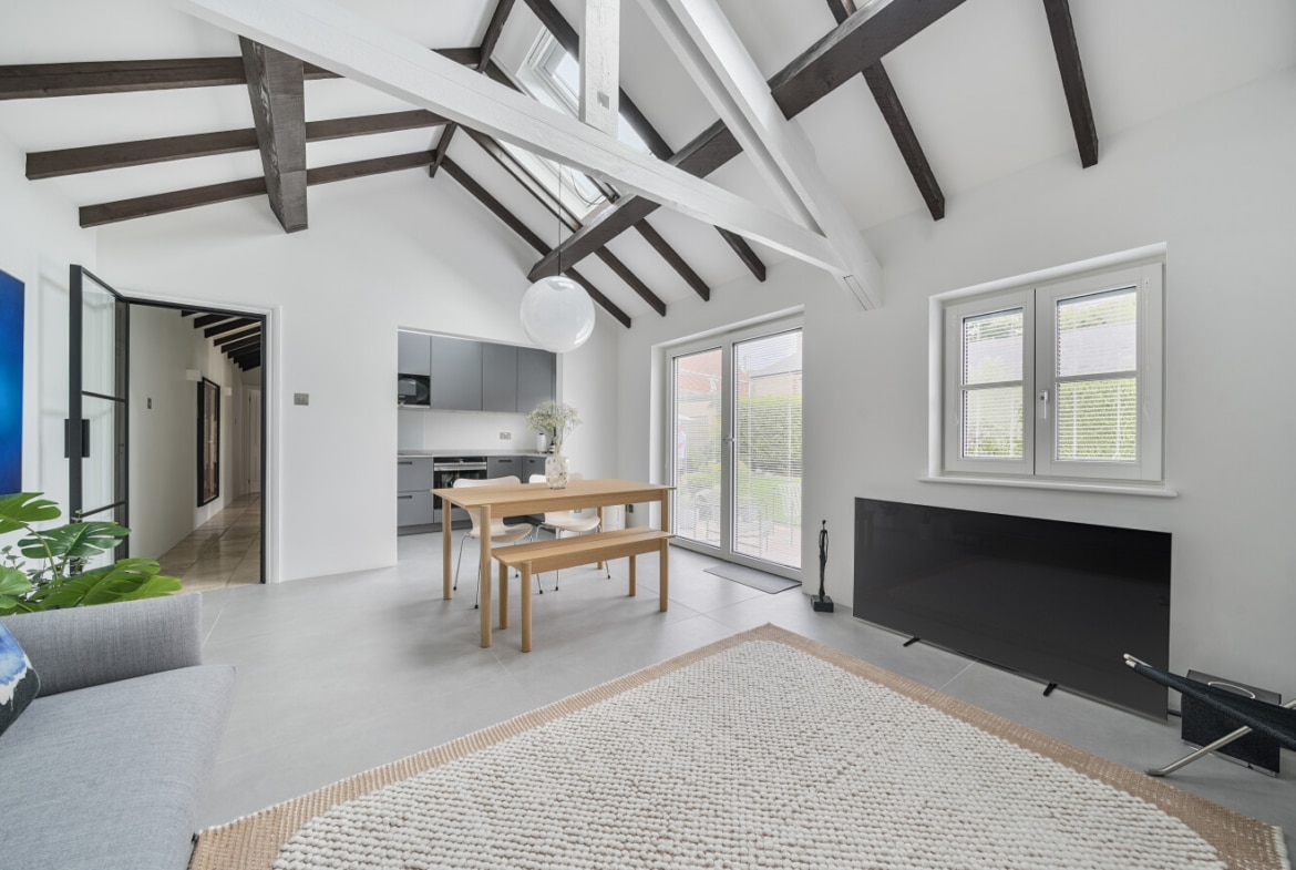Inside, the property offers stylish and thoughtfully designed accommodation throughout. The heart of the home is a stunning open-plan lounge and dining area with vaulted ceilings, giving a bright and spacious feel with a contemporary barn-style aesthetic. The modern refitted kitchen complements the living space perfectly, while the two bedrooms include a master bedroom and a second bedroom ideal as a guest room or office. A refitted bathroom completes the interior, all finished to a high standard.