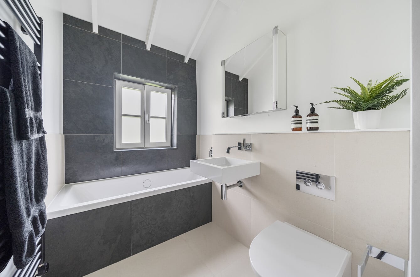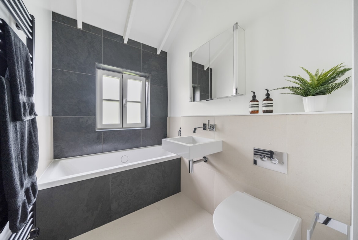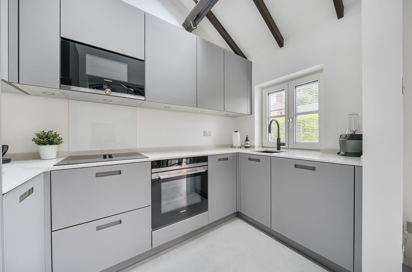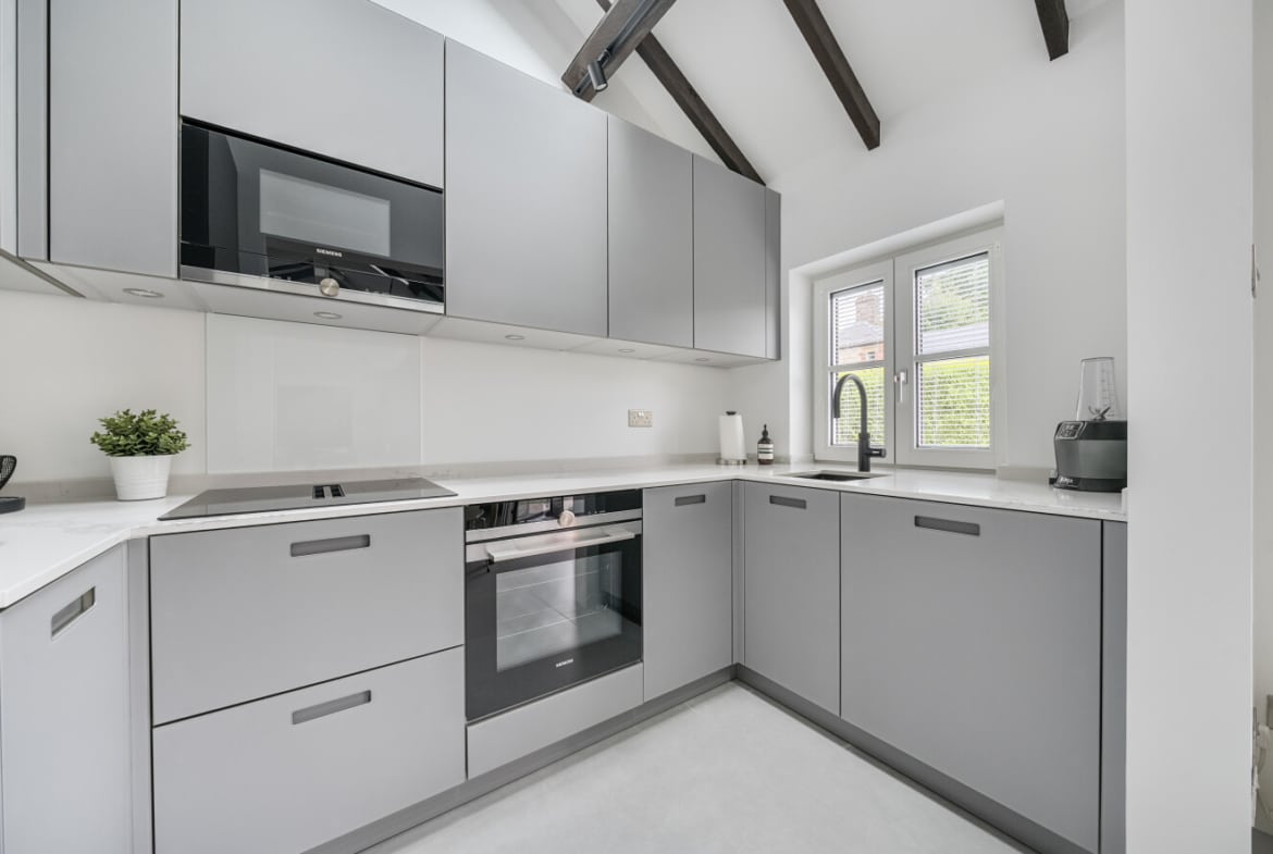 Inside, the property offers stylish and thoughtfully designed accommodation throughout. The heart of the home is a stunning open-plan lounge and dining area with vaulted ceilings, giving a bright and spacious feel with a contemporary barn-style aesthetic. The modern refitted kitchen complements the living space perfectly, while the two bedrooms include a master bedroom and a second bedroom ideal as a guest room or office. A refitted bathroom completes the interior, all finished to a high standard.