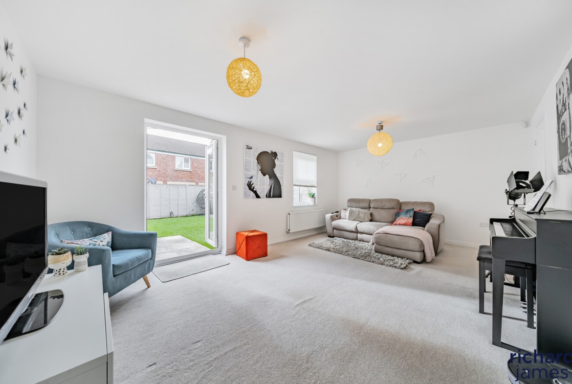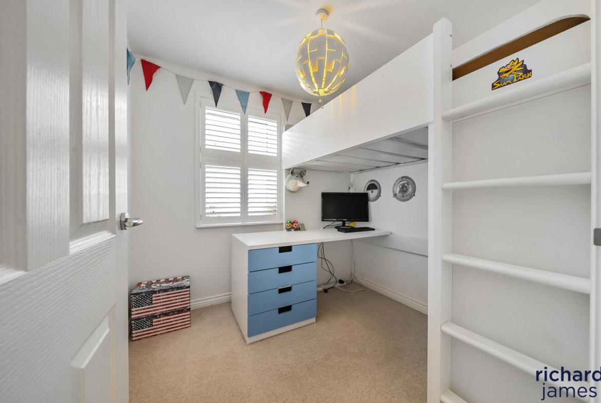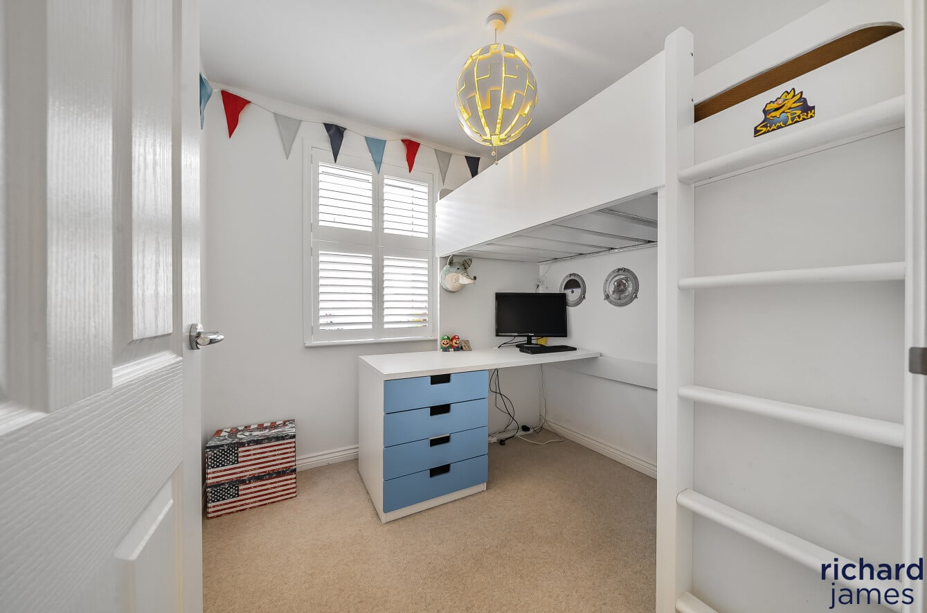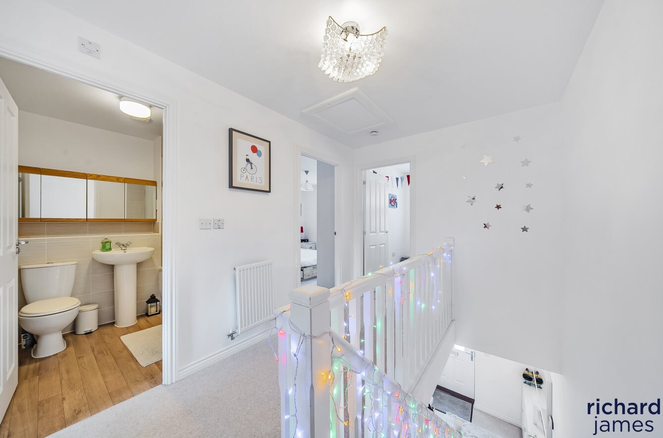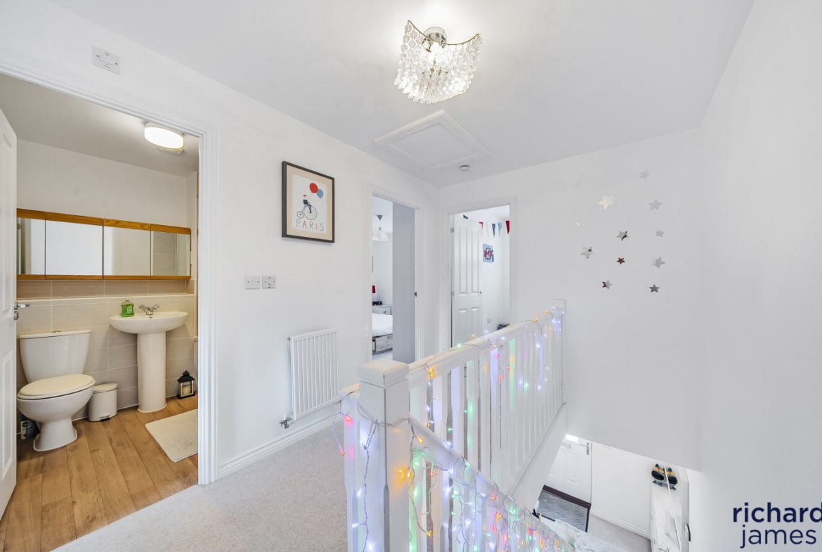 spacious Kitchen/Dining Room with integrated appliances, Cloakroom and Sitting Room with PVCu patio doors opening into the south facing Rear Garden and there’s also a small Study off the Sitting Room. The first floor, includes a large Landing, Four bedrooms, Ensuite shower room and fitted wardrobes to Bedroom One and a Family Bathroom.