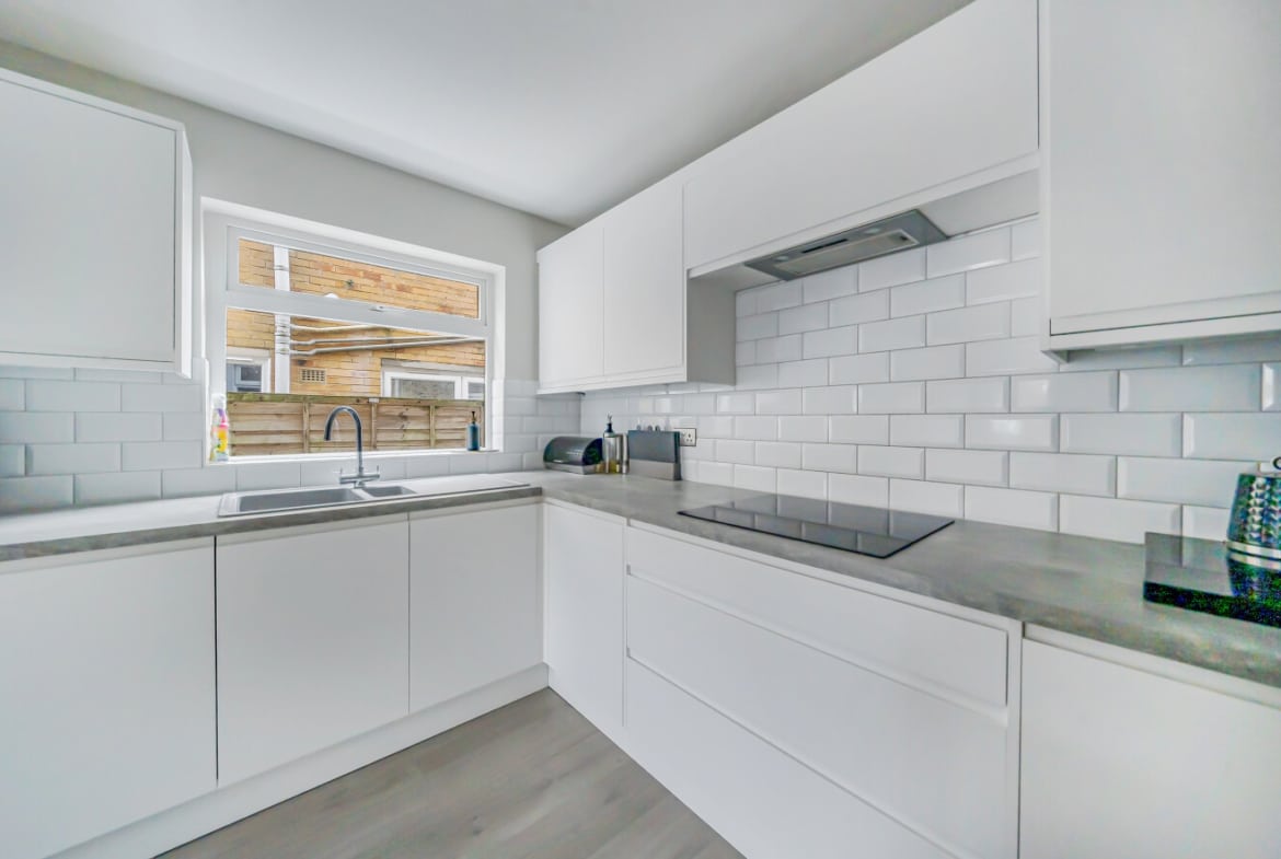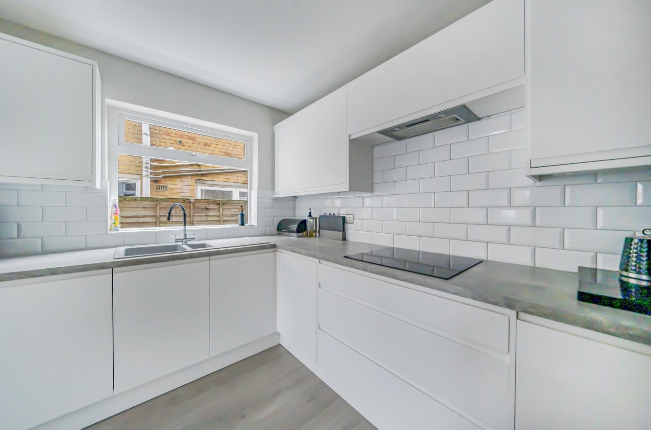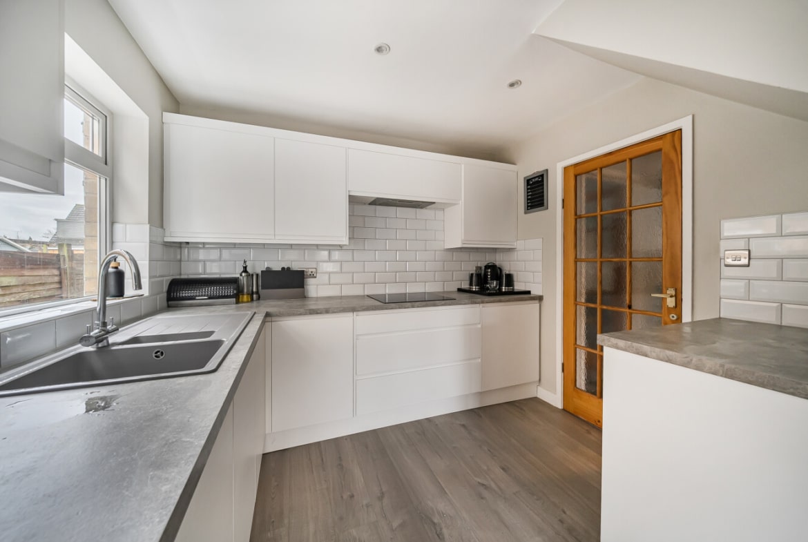Adjacent to the living area is a small office, leading through to a ground-floor bathroom, adding valuable practicality to the layout. The kitchen is accessed from the entrance hallway and is well equipped with an integrated fridge/freezer, generous worktop space, and a window overlooking the garden. A rear door leads to an area suitable for use as a utility space, with an additional door opening onto a courtyard.