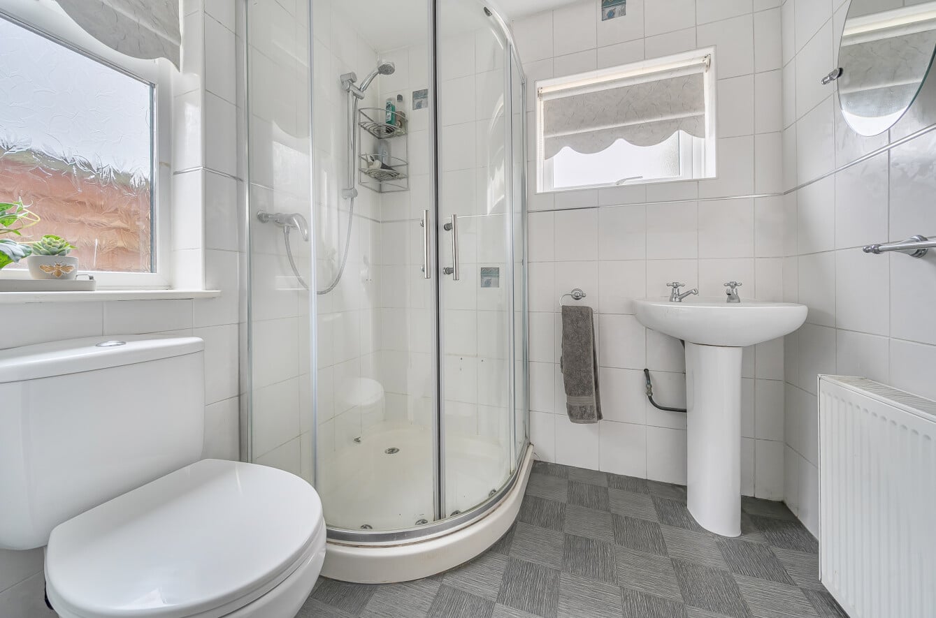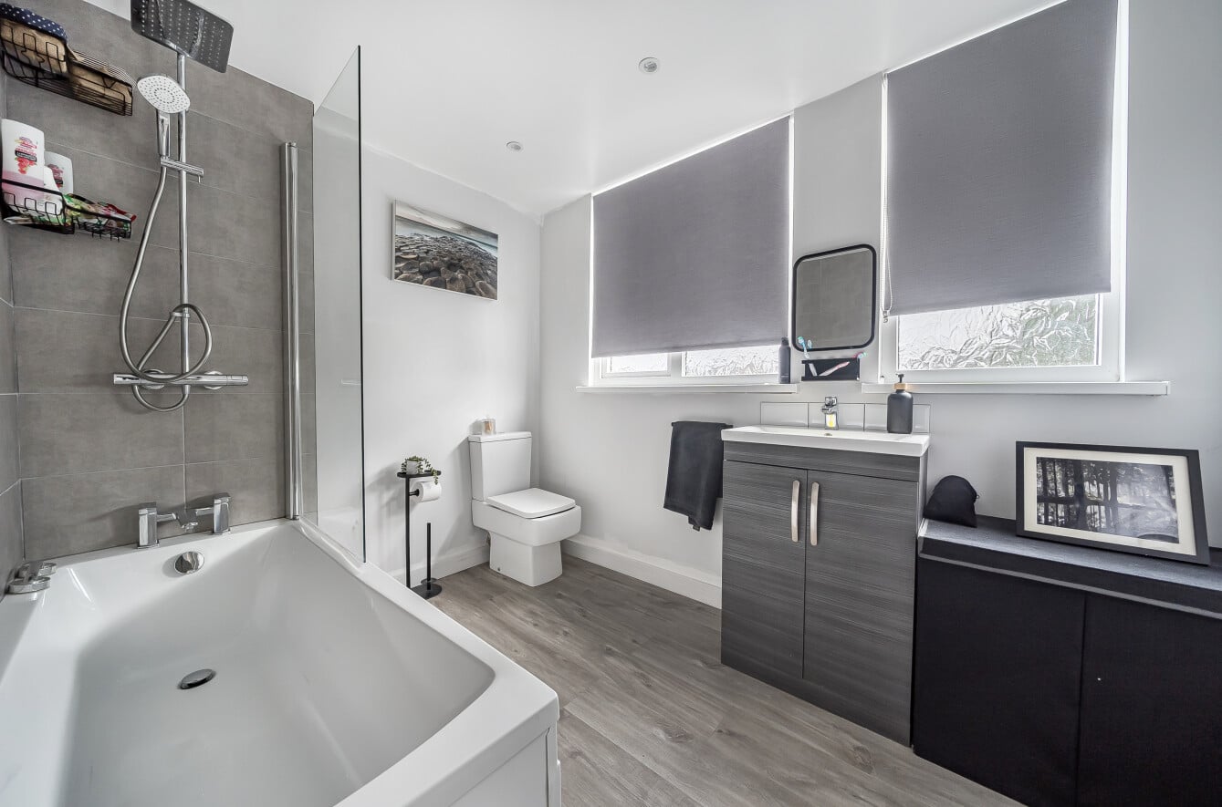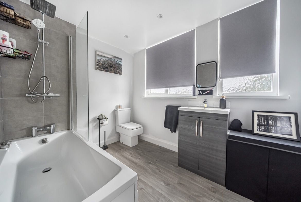Upstairs, the accommodation comprises two well-proportioned double bedrooms and a single bedroom. The master bedroom benefits from ample built-in storage. The family bathroom is finished to a high standard and includes lino flooring, a bath with shower over, WC, and wash hand basin.