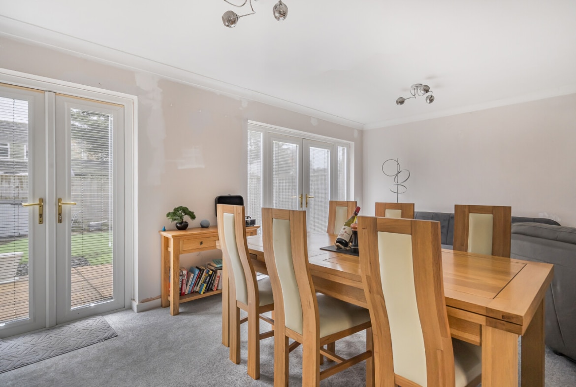 To the rear, the property opens into an impressive open-plan living and dining area, perfectly designed for both everyday family life and entertaining. The striking archway ceiling enhances the feeling of height and openness, while allowing natural light to flood the room. There is ample space for both comfortable seating and formal dining, and double doors provide a seamless connection to the enclosed rear garden—ideal for summer gatherings, family time, or quiet relaxation.