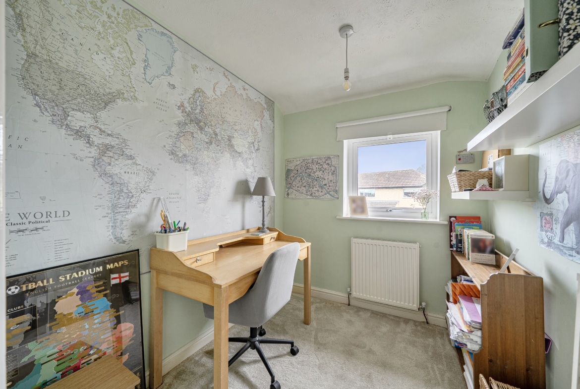 Upstairs, the property offers three bedrooms, including a generous principal bedroom and a well-proportioned second bedroom, alongside a third room ideal as a nursery, home office, or guest space. A family bathroom completes the first-floor accommodation.