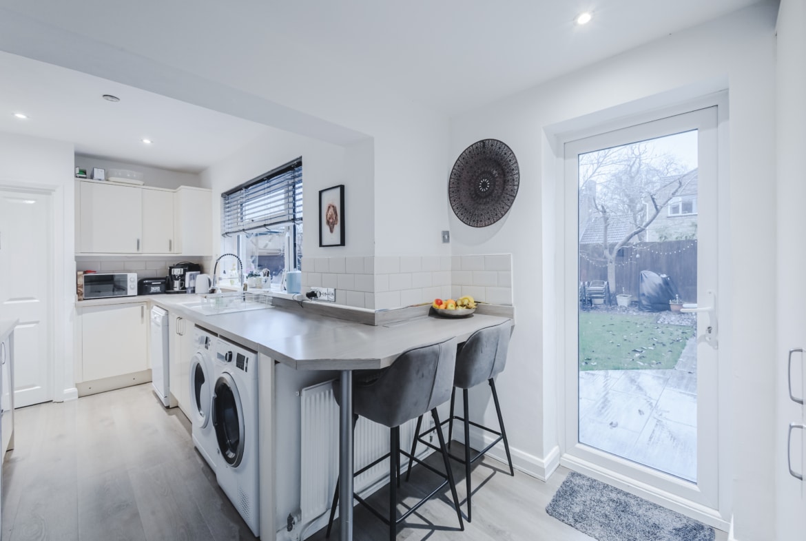 The ground floor features a welcoming entrance hall leading to a dual-aspect living room with abundant natural light and access to the garden. There is a separate dining room, a stylish refitted kitchen, a practical study created from part of the original garage, and a convenient cloakroom.