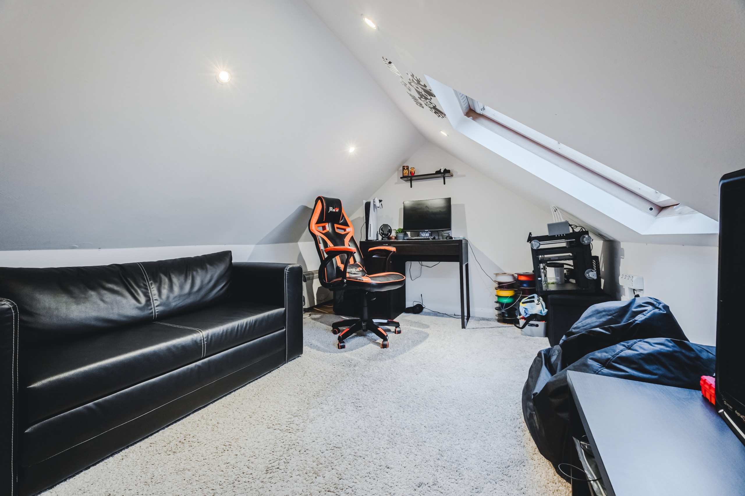 The first floor offers four well-balanced bedrooms, including a principal bedroom with a private ensuite shower room, alongside a beautifully refitted family bathroom. A further converted loft room provides additional flexibility and could serve as a workspace, hobby room, or independent bedroom space.