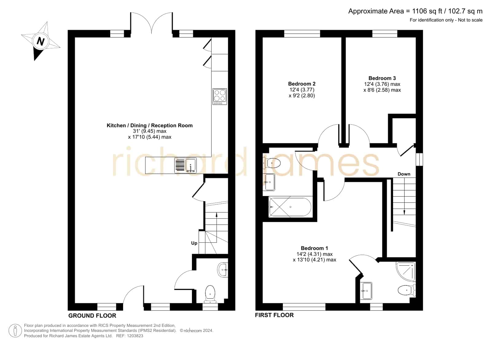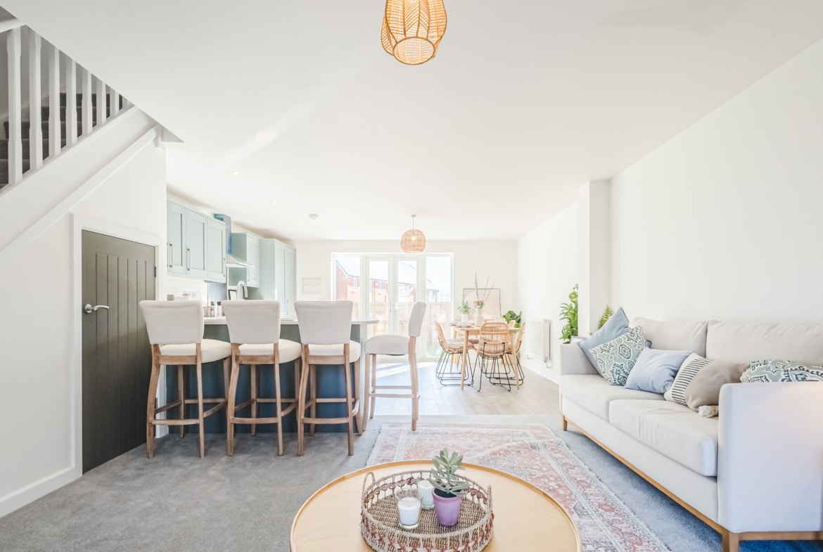 Upon entering, you’re welcomed by a generous living room filled with natural light. To the rear of the home, the open-plan kitchen/dining room is designed to be a bright and sociable space, complete French doors that open to the private, lawned rear garden—perfect for alfresco dining or relaxing outdoors.