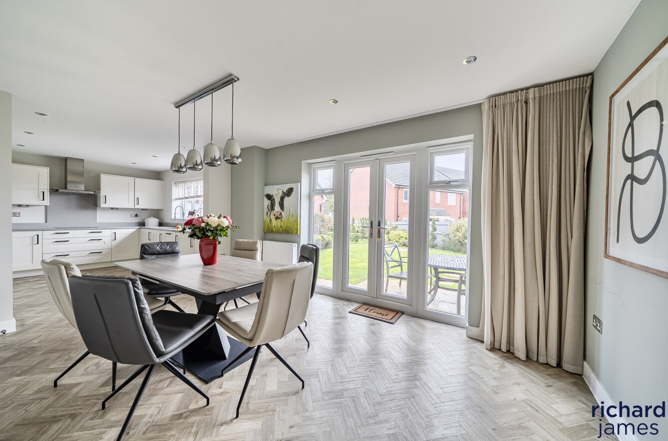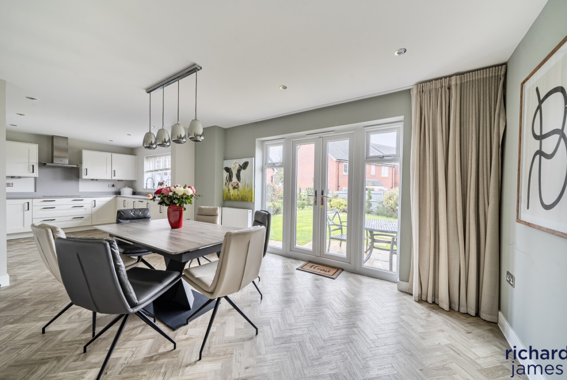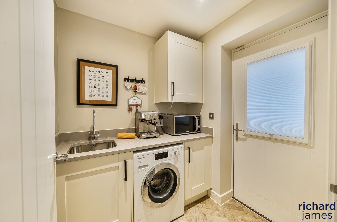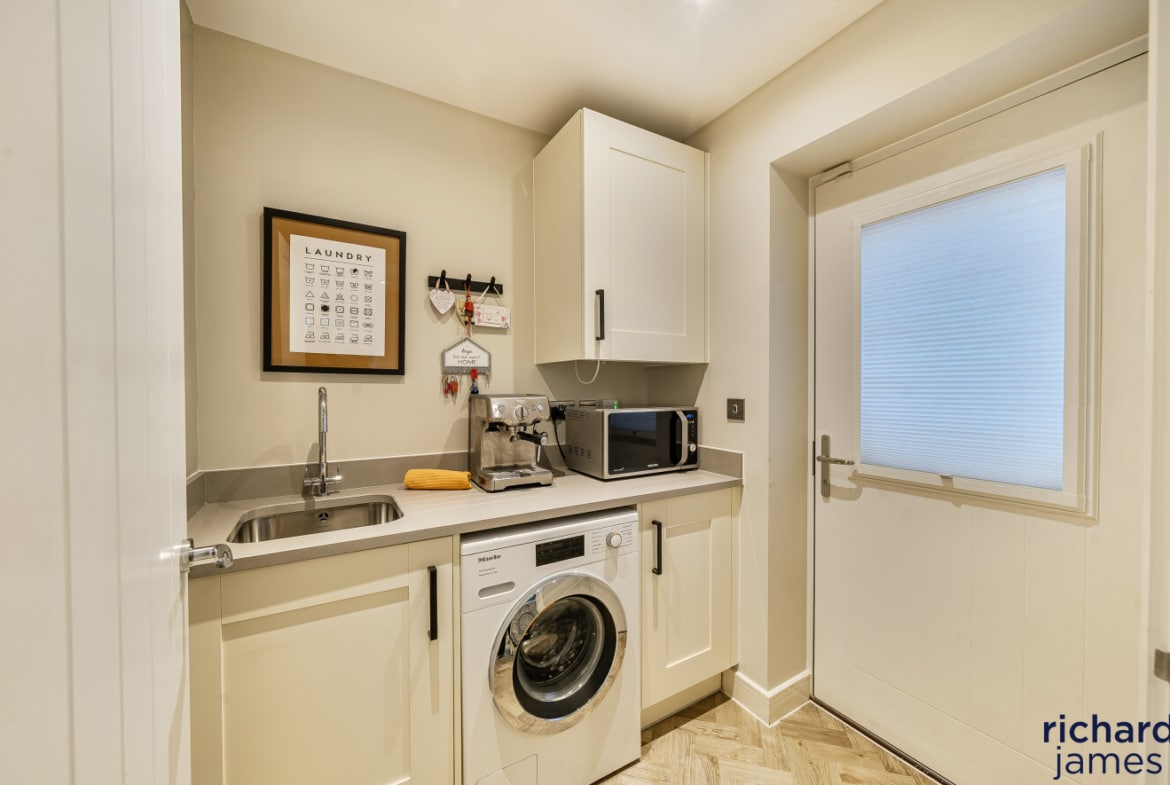 The accommodation is both generous and well balanced, centred around a superb open-plan kitchen and dining room that forms the hub of the home. This is a bright, stylish space designed for modern living, with ample room for family life and entertaining, complemented by contemporary cabinetry, quality appliances and direct access out to the garden. A separate living room provides a calm and comfortable retreat, while a useful study on the ground floor is ideal for home working. Practical additions such as the utility room and cloakroom further enhance the everyday functionality of the layout.