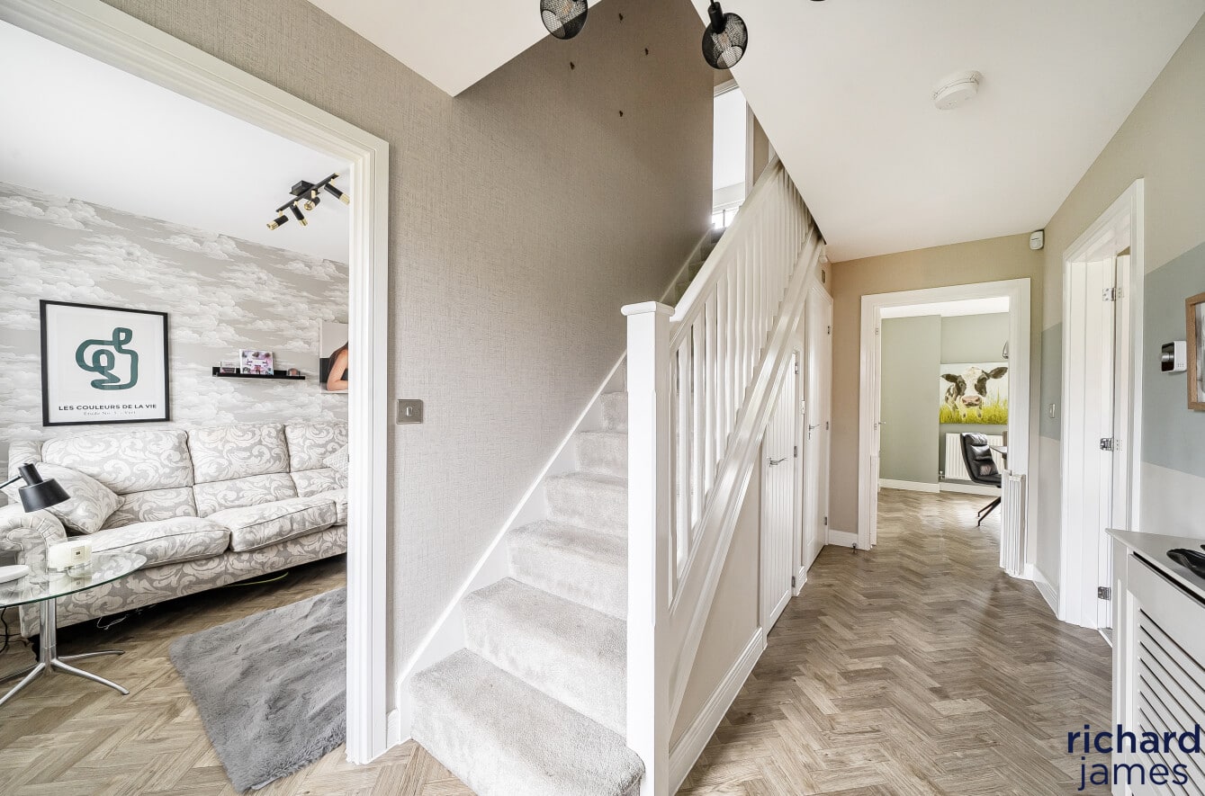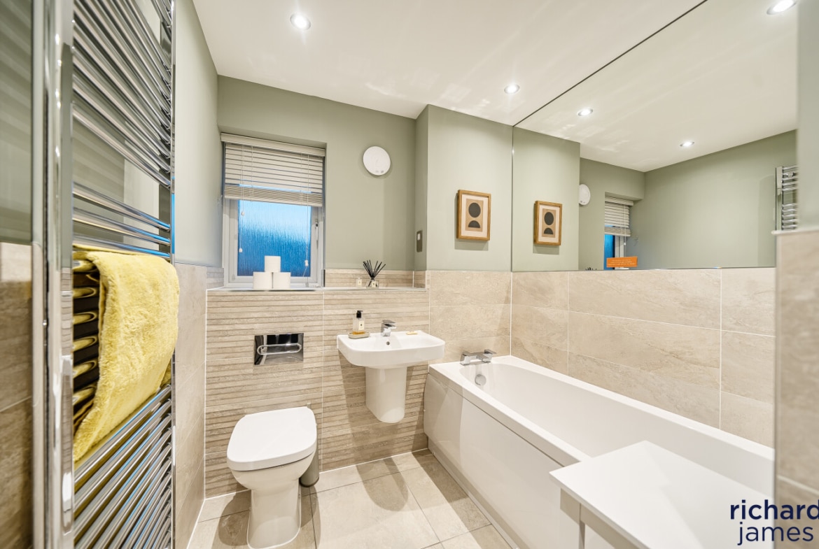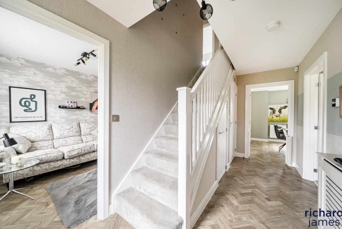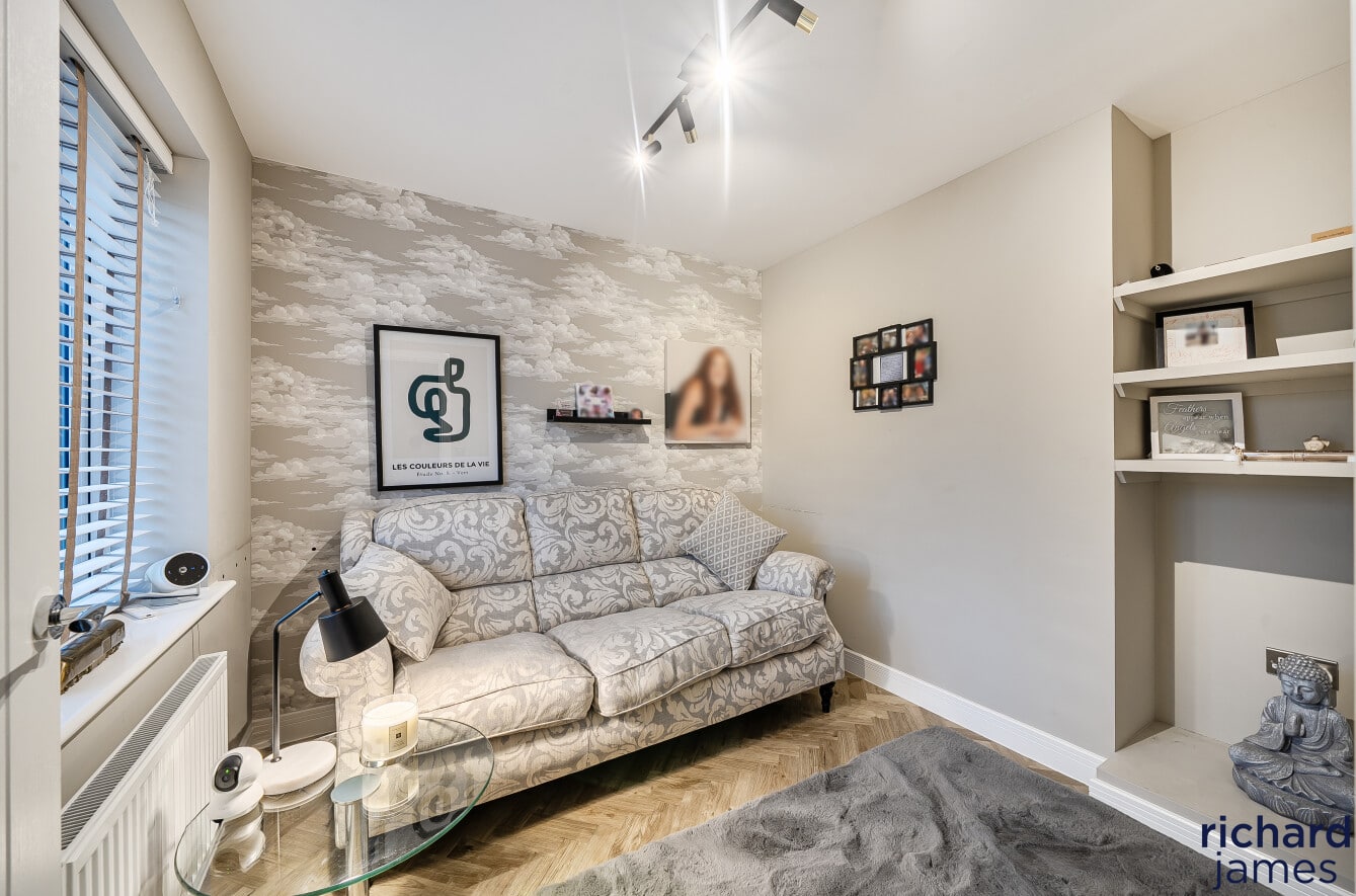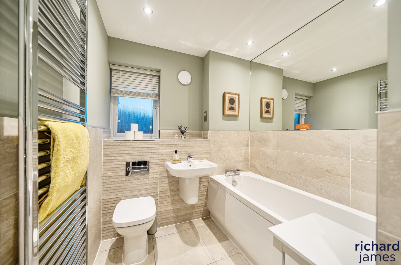 Upstairs, the bedrooms are well proportioned and beautifully presented, with the principal bedroom benefiting from fitted storage and a sleek en-suite shower room. The remaining bedrooms are served by a modern family bathroom, all finished to a high standard and continuing the neutral, well-considered styling seen throughout the property.