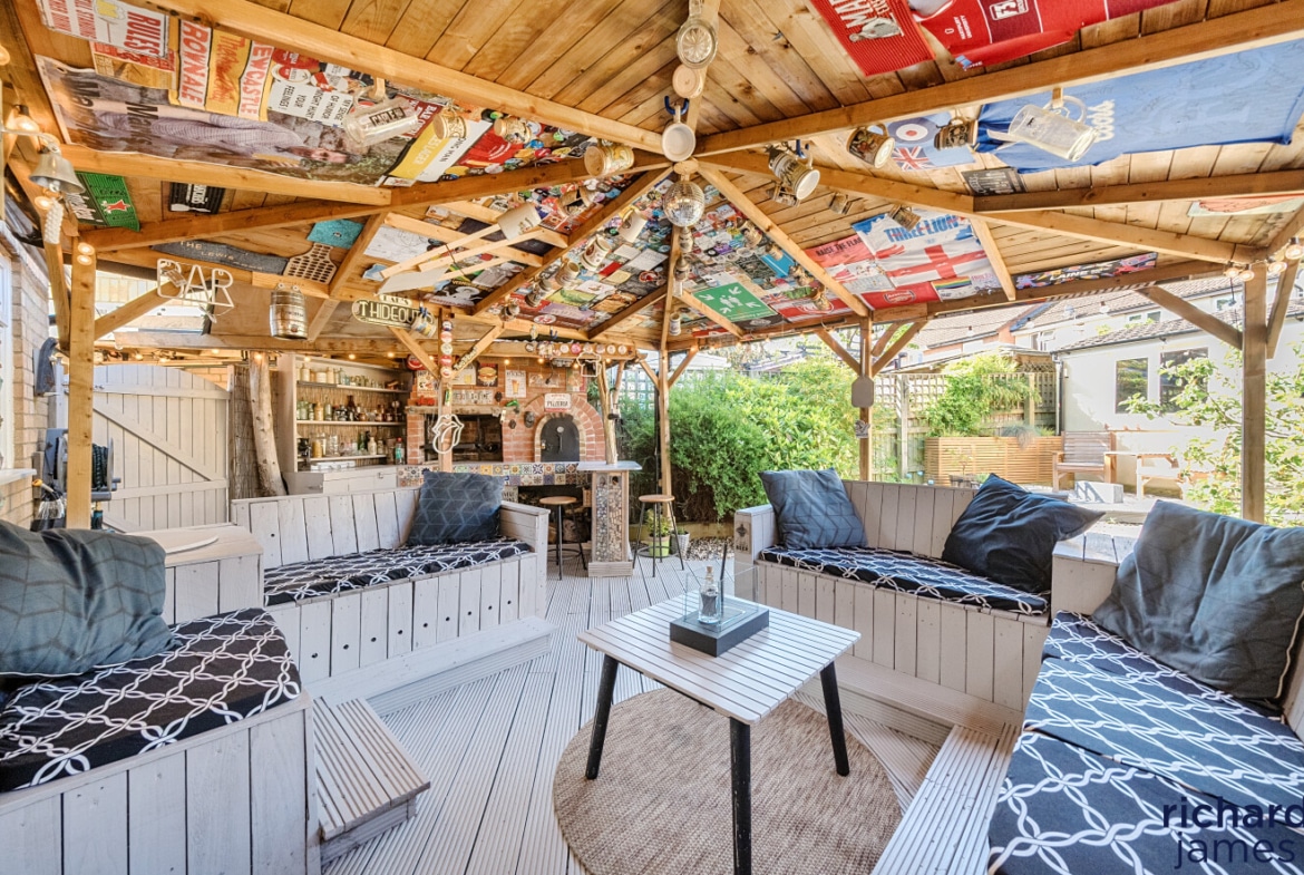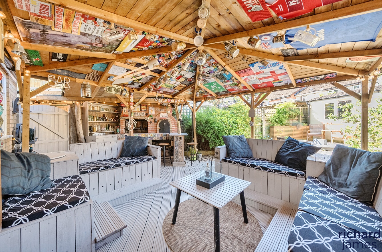 The exterior of the house is equally impressive, featuring a low-maintenance front garden and a driveway that accommodates parking for two vehicles. The south-westerly facing rear garden is a true delight, designed for relaxation and entertainment. It includes a distinct man cave at the garden’s end, perfect for a variety of uses. An exceptional feature is the hand-built undercover seating area, complete with a pizza oven, offering a unique space for outdoor cooking and dining. This garden setting is perfect for social gatherings or enjoying serene evenings in your own slice of outdoor paradise.