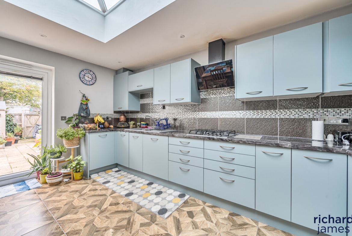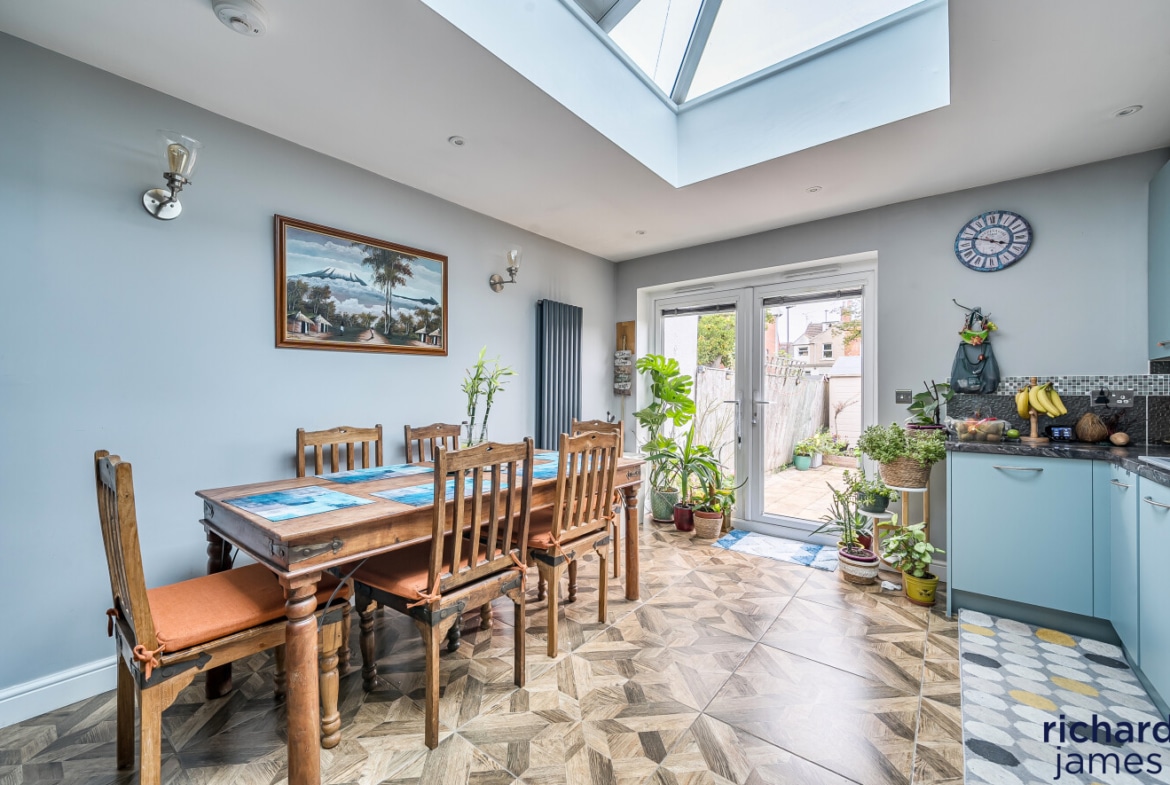 The ground floor living accommodation comprises; Living room, study/utility room, a modern bathroom plus an extended, modern kitchen/dining room with roof lantern and french doors giving access and views of the rear garden.