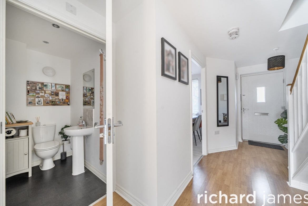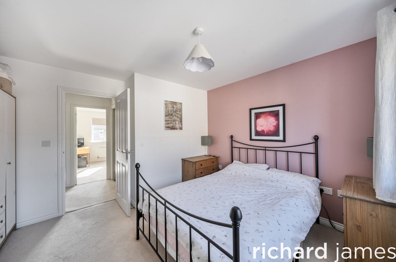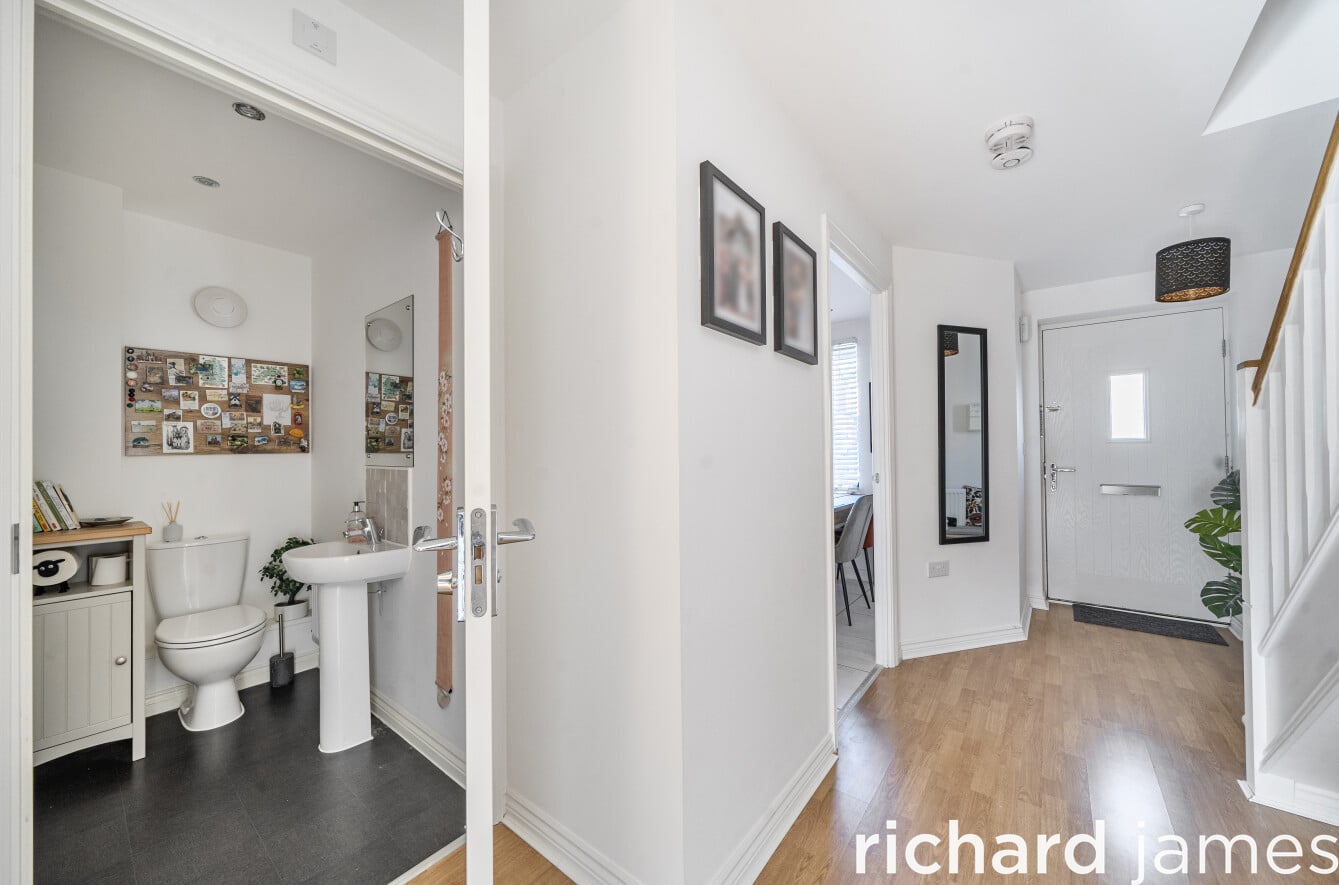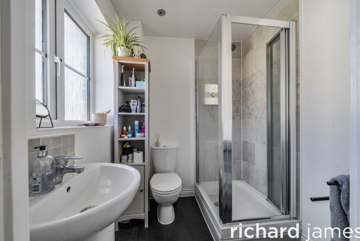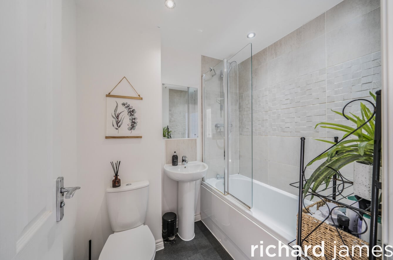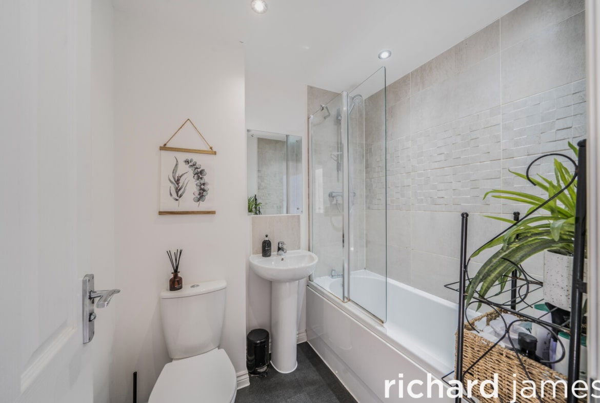 Upstairs, the first floor continues to impress with a generous main bedroom complete with its own en‑suite shower room. Two further well-sized bedrooms provide flexibility for family members, guests, or home working, and are served by a contemporary family bathroom.
