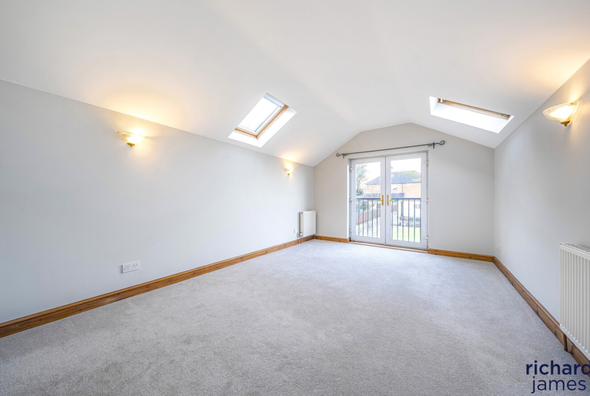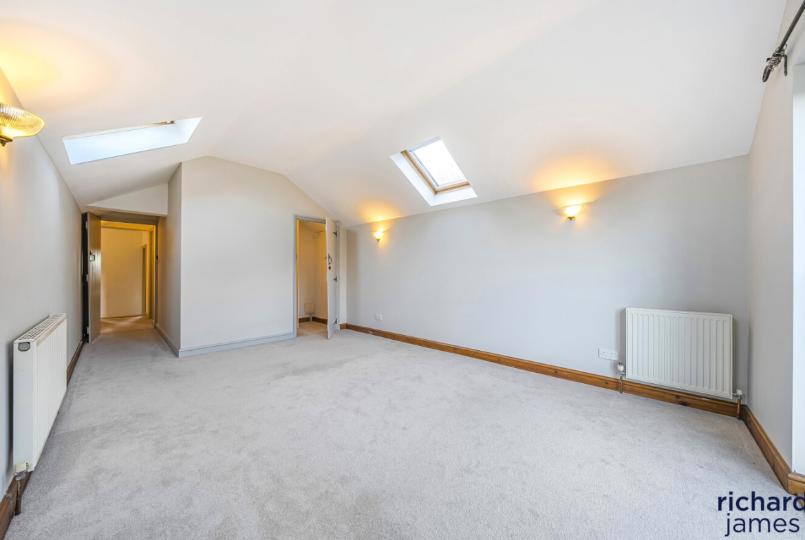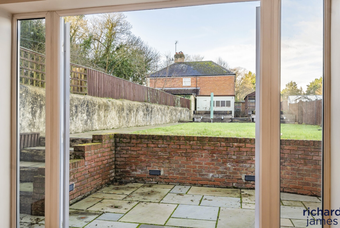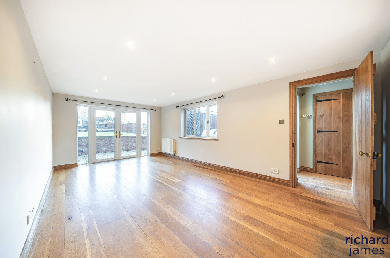 The interior of this home is equally impressive, beginning with a cosy sitting room featuring a charming wood burner. At the front, a dedicated home office space is complemented by a staircase leading to the first floor. A spacious inner hallway provides access to the well-appointed kitchen, while a convenient downstairs shower room and cloakroom offer practical living. The rear of the house opens up into a large, inviting sitting room, which boasts French doors that lead out to the rear terrace and garden, creating a seamless connection between indoor and outdoor spaces.