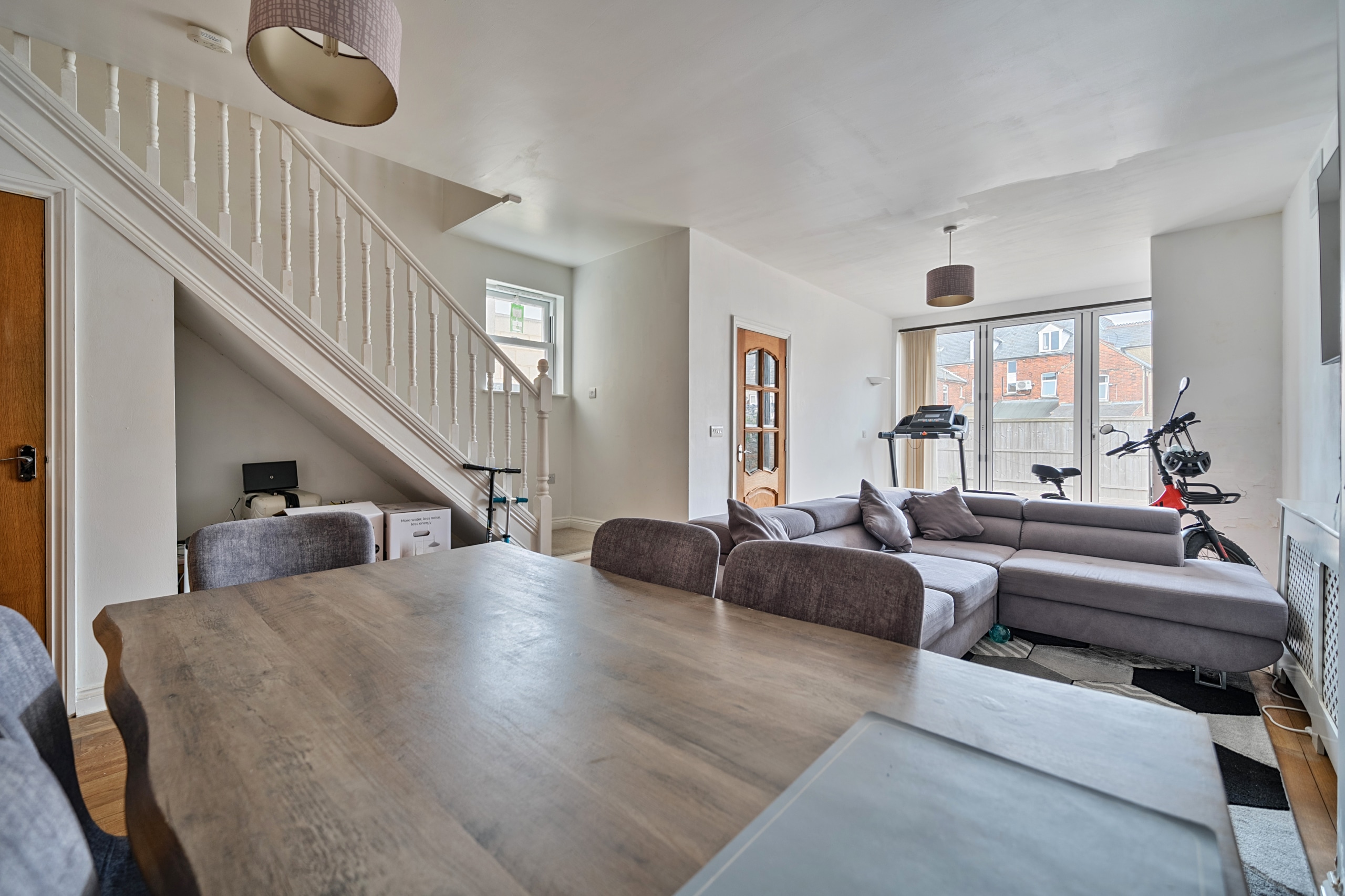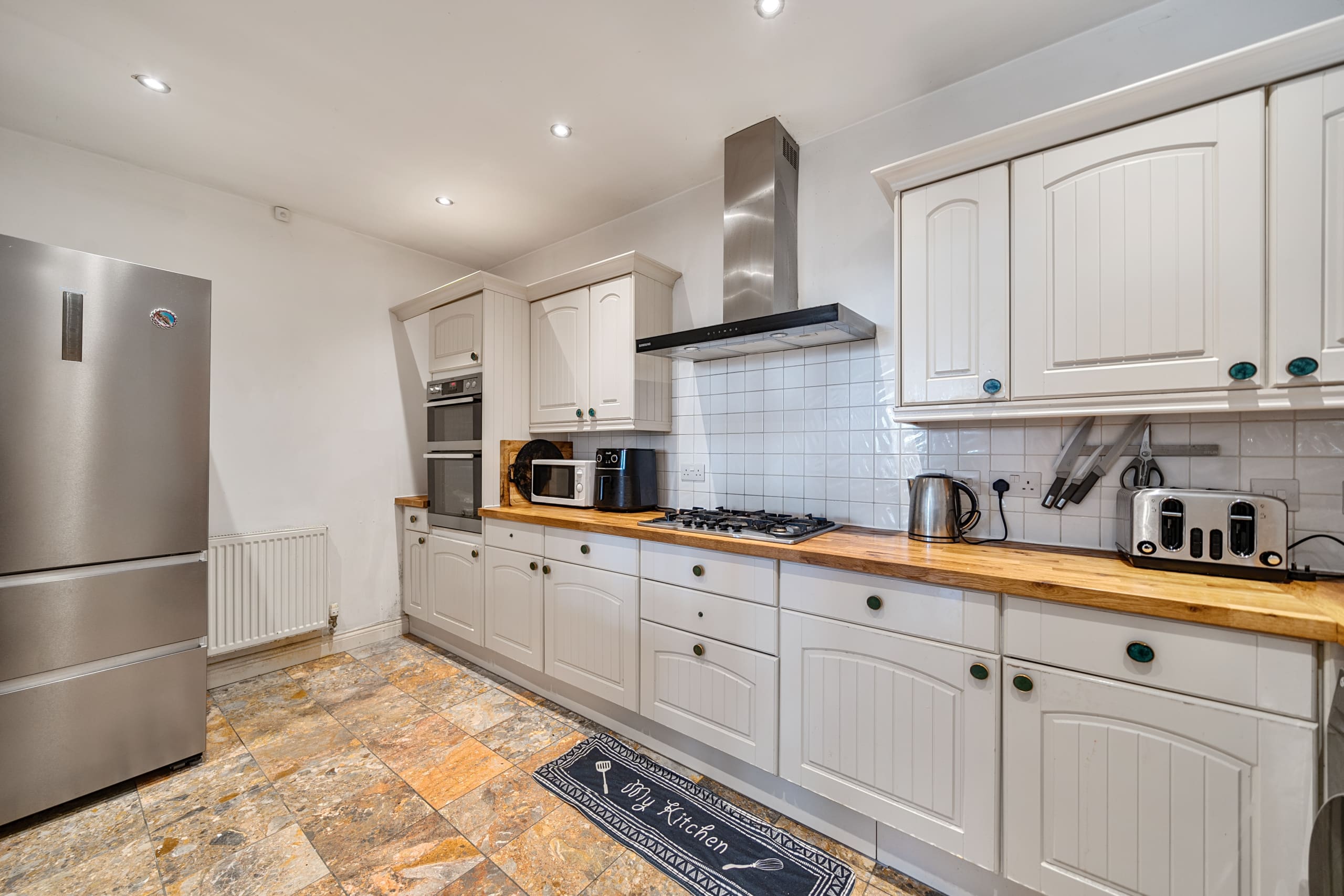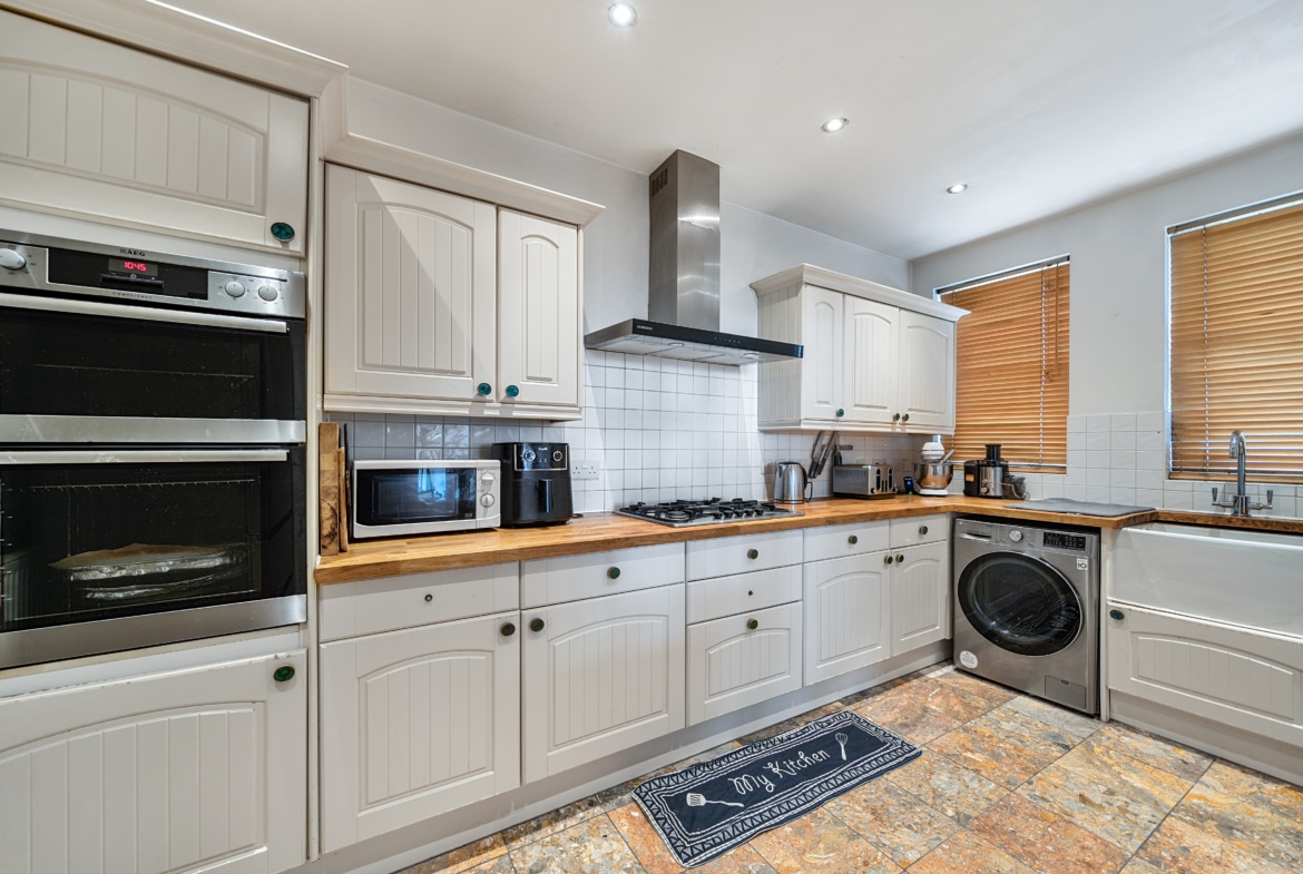 Step inside to a spacious and light-filled open plan living/dining room, the perfect space for entertaining or relaxing with family. Seamlessly leading through to a stylish kitchen finished with wood worktops and belfast sink. A convenient downstairs cloakroom completes the ground floor.