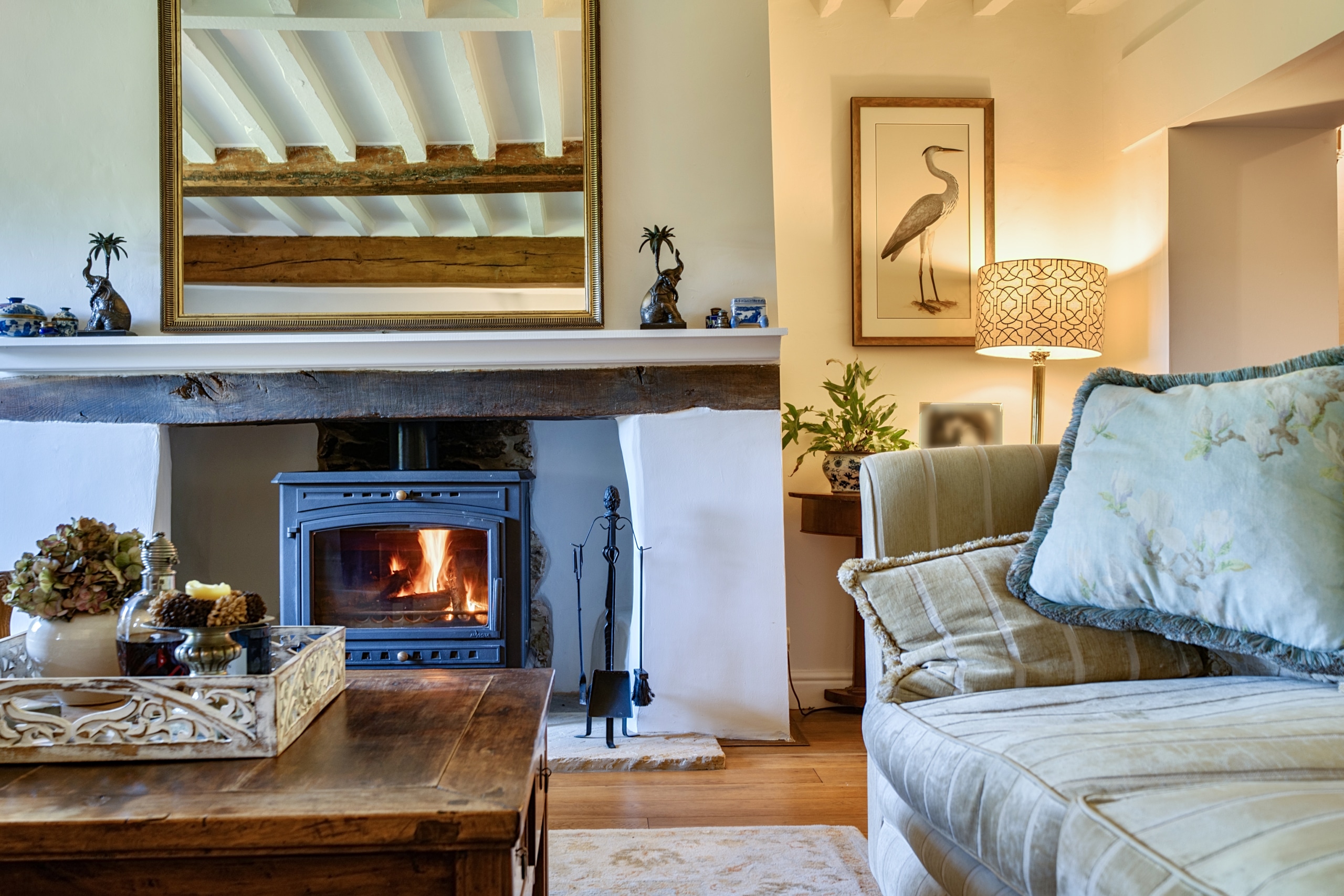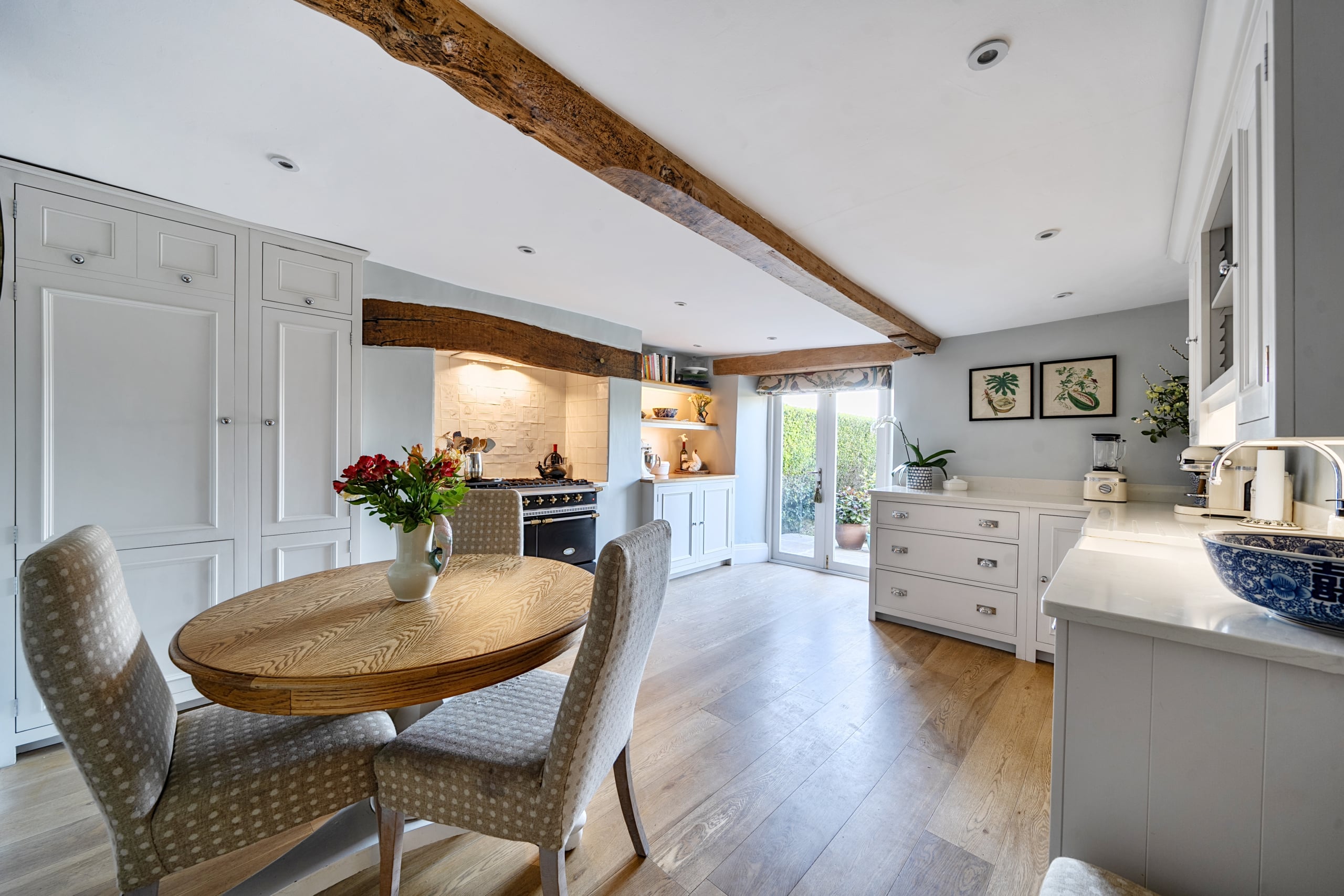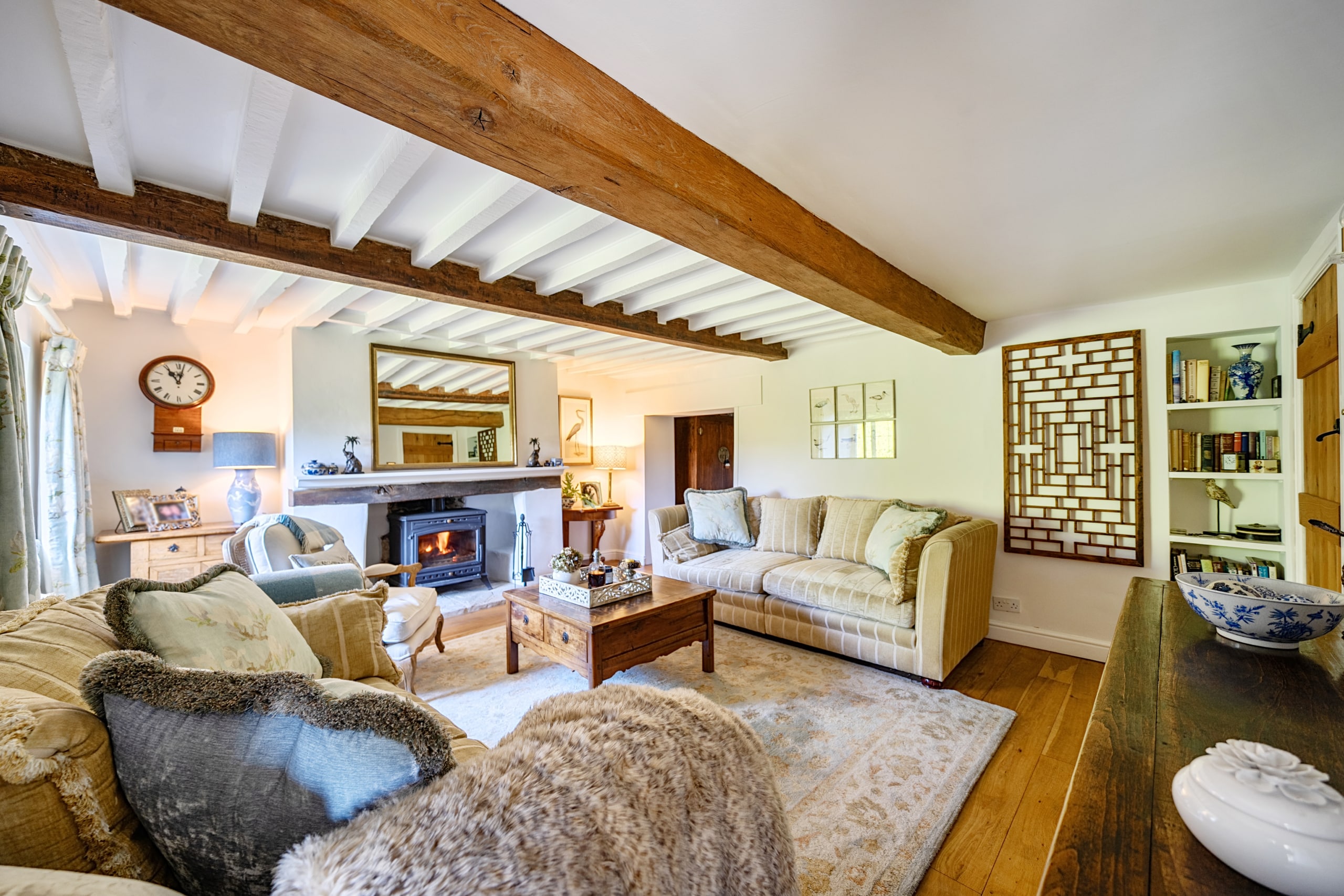 The accommodation is thoughtfully arranged over three floors and is immaculately presented throughout. At the heart of the home is a welcoming entrance hall leading to a charming reception room, featuring exposed beams and a striking fireplace with wood-burning stove, creating a wonderfully cosy