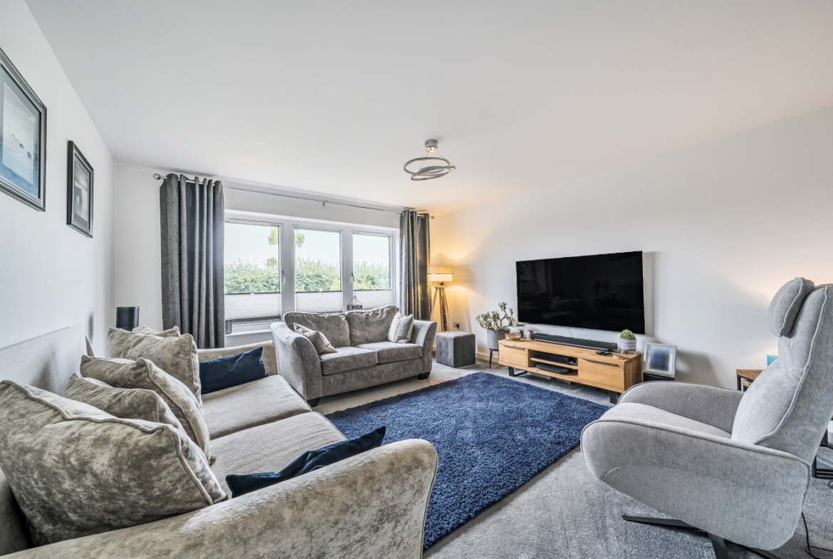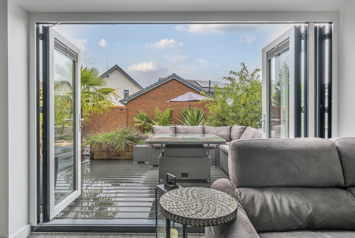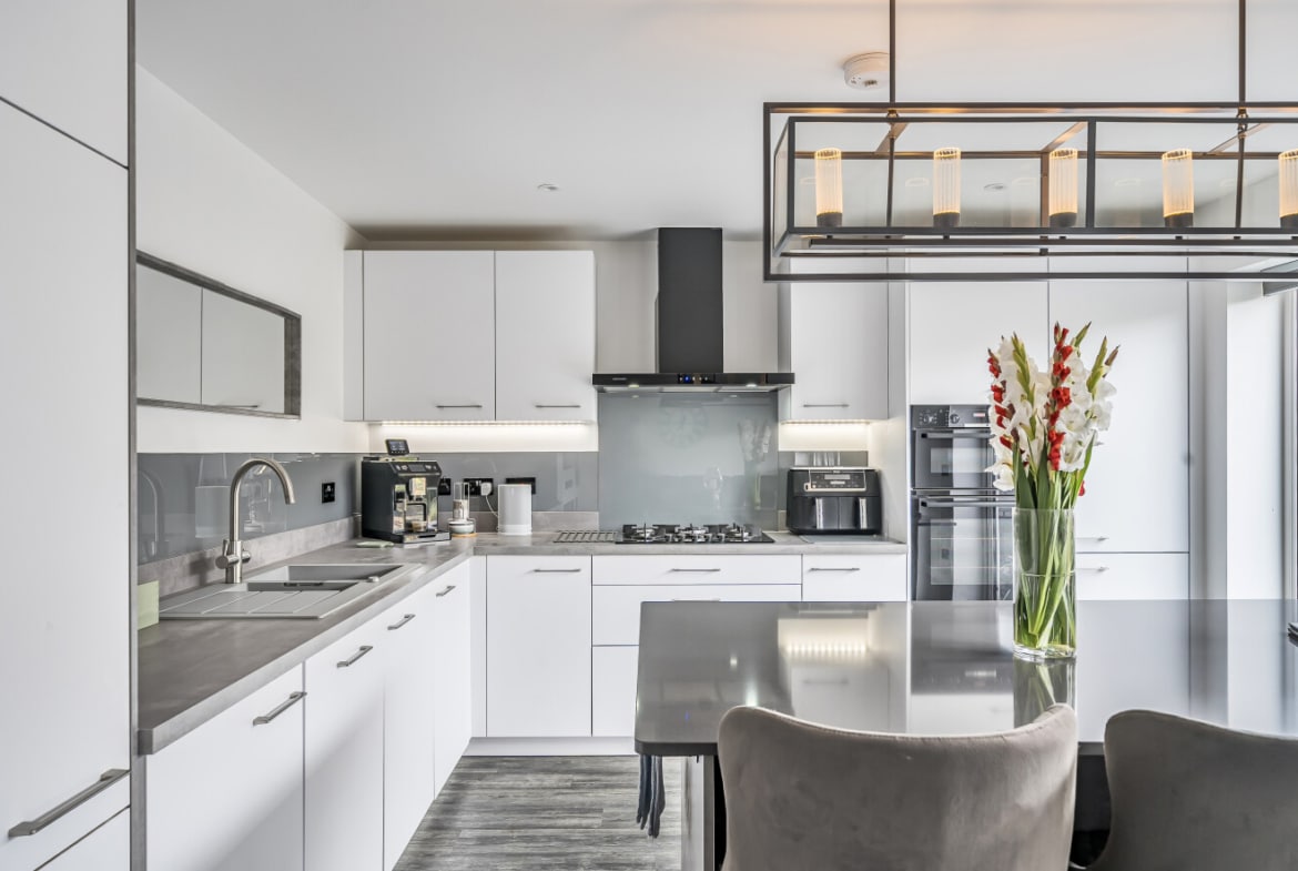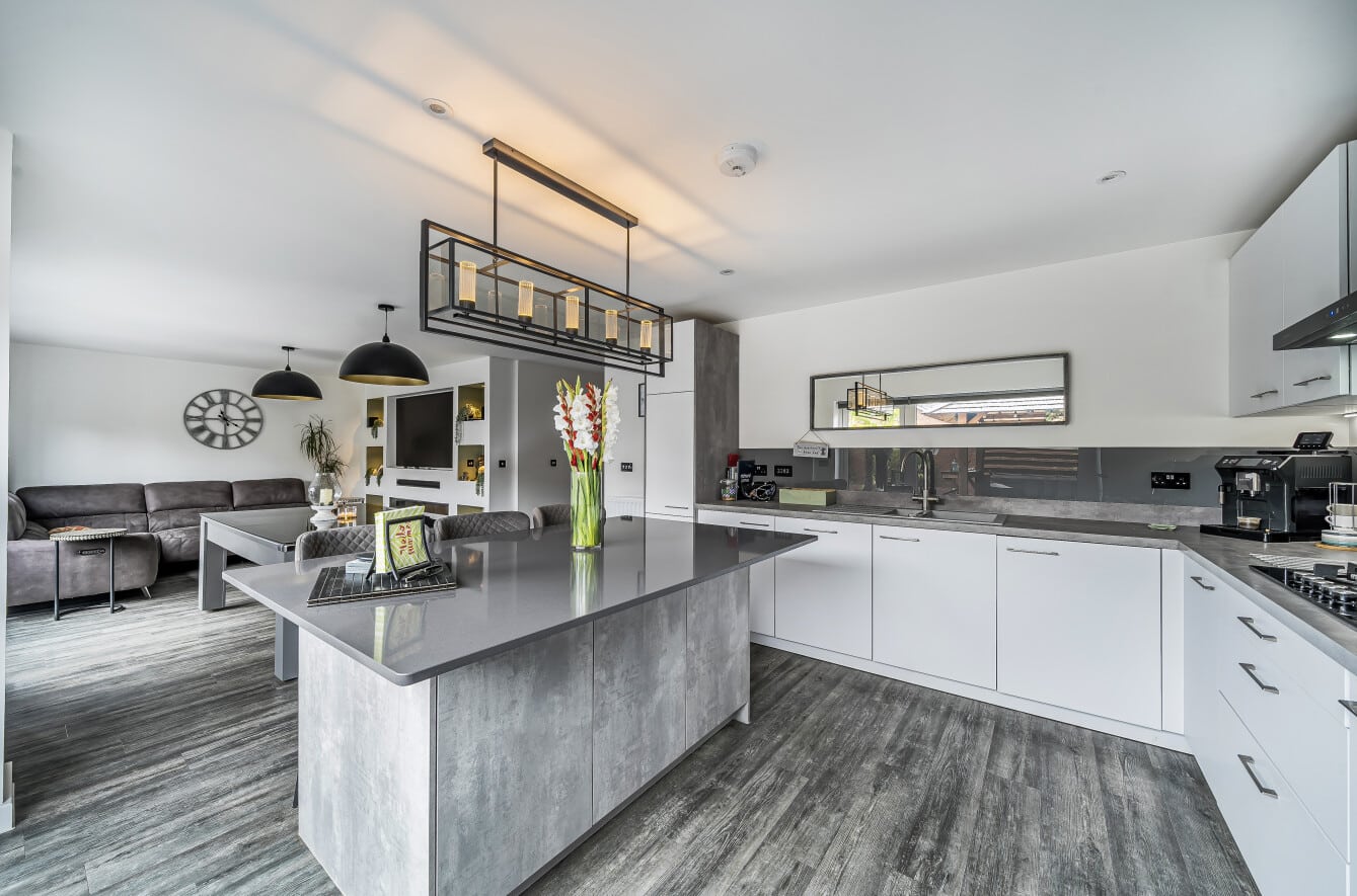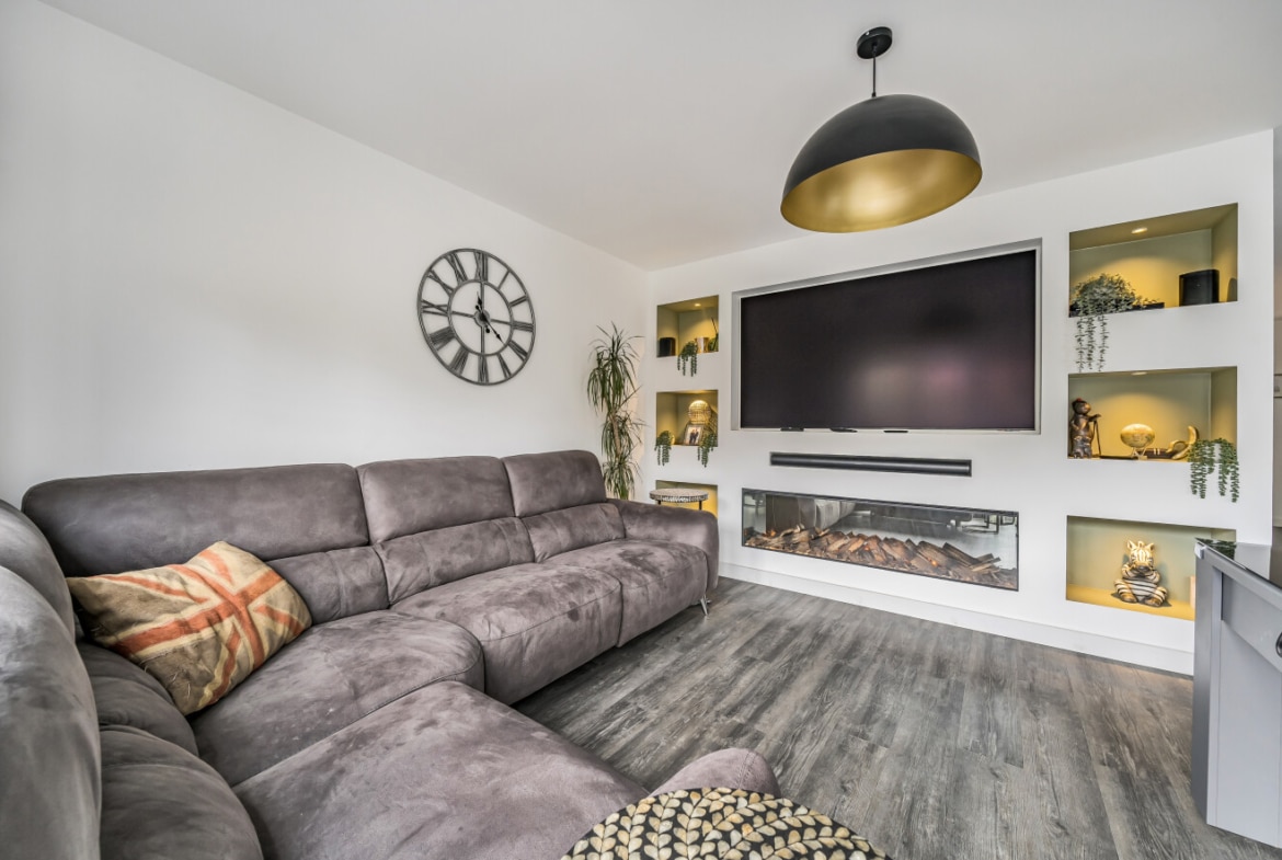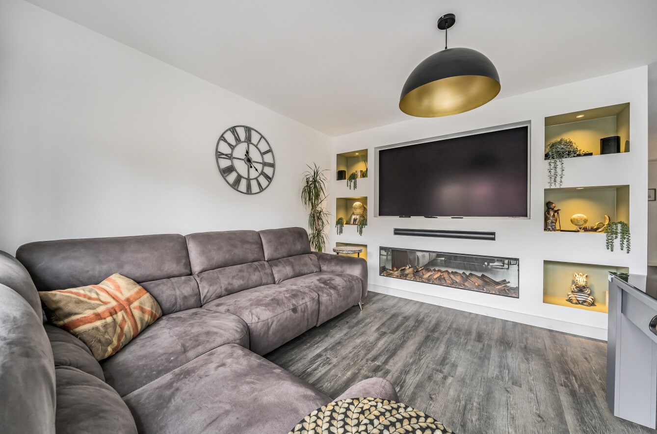 The property has been finished to a very high standard throughout and offers versatile accommodation, perfect for modern family living. From the moment you step into welcoming Hall, you’re drawn into the heart of the home, with the spacious 31′ open plan Kitchen/Dining/Family Room before you. With sleek upgraded Kitchen units and worktops with boiling water tap and integrated appliances, island unit with seating under ideal for everyday family life, with feature picture window overlooking the garden, opening to Dining area and in turn the Family Room, with media wall and bi-fold doors leading out into the garden. To the front, is a generous Sitting Room, ideal for relaxing in the evening, with Cloakroom, with Utility Cupboard.
