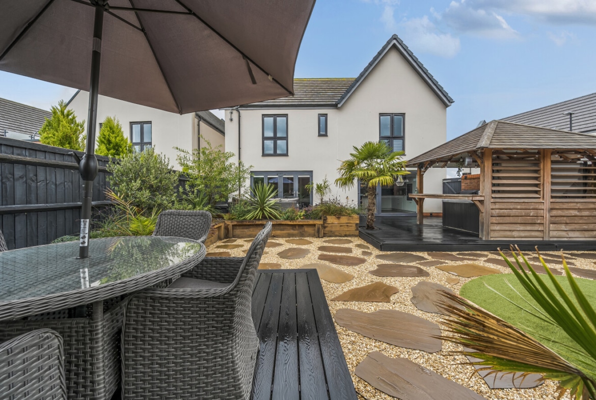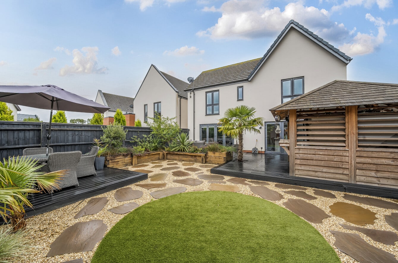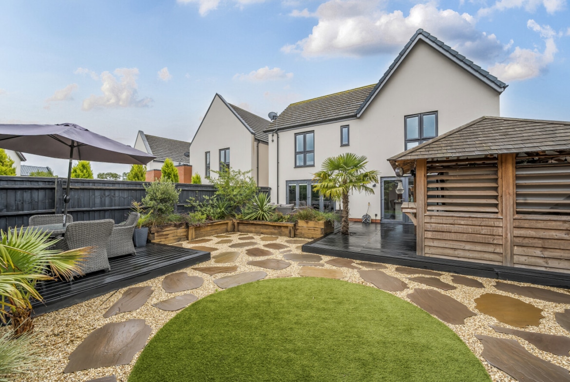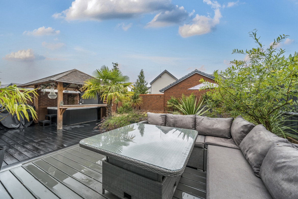The Rear Garden has been extensively landscaped to provide different areas of rest and relaxation, including an extensive composite decked area, ideal for alfresco dining and solid Oak gazebo, ideal for your hot tub with complete privacy. Extensive pea chipped area with Indian sandstone stepping stones with central circular artificial lawn and selection of continental palms and plants. With further raised composite decked area to the rear, to make the most of the evening sunshine. All enclosed by attractive brick walling and timber fencing, offering a high degree of privacy. To the front, there is double driveway with EV charging point and gives access to the Garage, with remote controlled roller door.