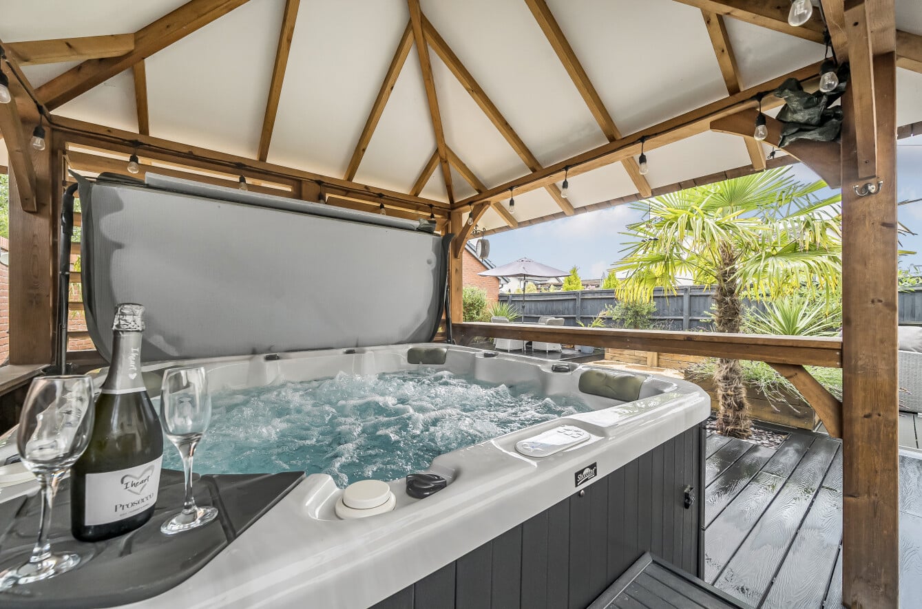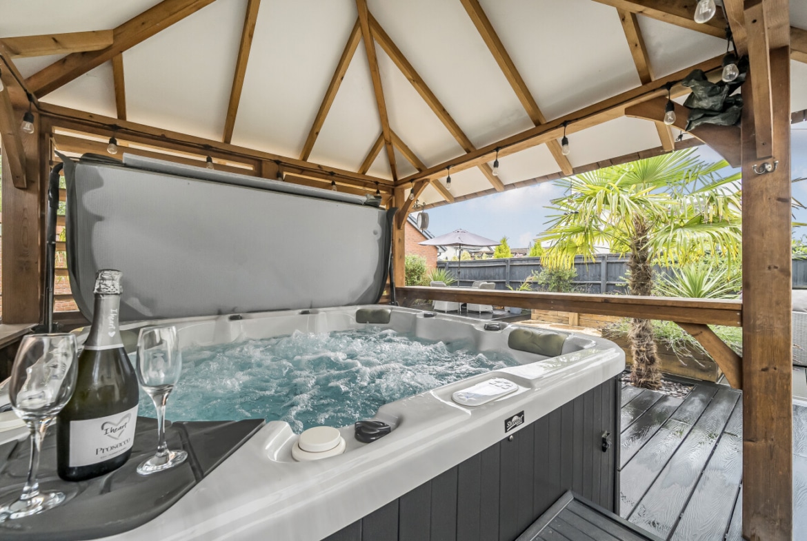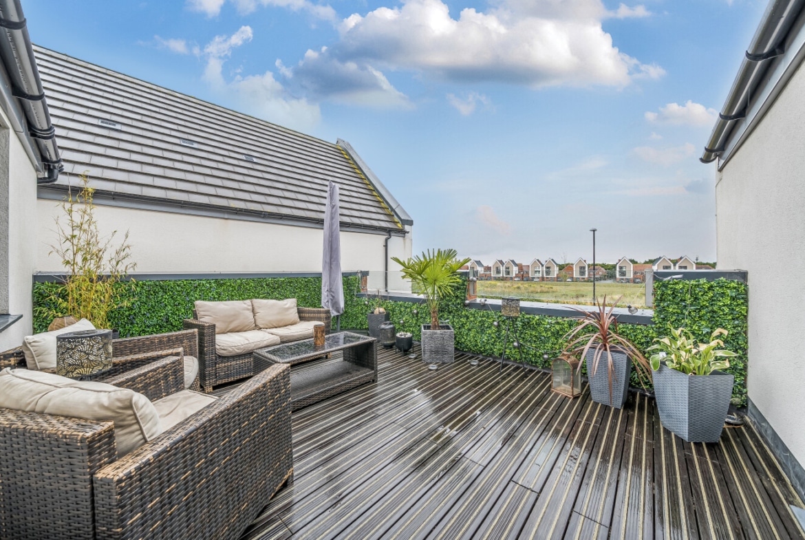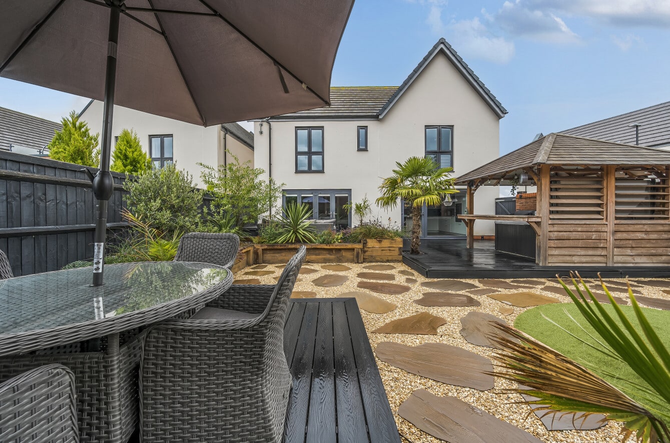The Rear Garden has been extensively landscaped to provide different areas of rest and relaxation, including an extensive composite decked area, ideal for alfresco dining and solid Oak gazebo, ideal for your hot tub with complete privacy. Extensive pea chipped area with Indian sandstone stepping stones with central circular artificial lawn and selection of continental palms and plants. With further raised composite decked area to the rear, to make the most of the evening sunshine. All enclosed by attractive brick walling and timber fencing, offering a high degree of privacy. To the front, there is double driveway with EV charging point and gives access to the Garage, with remote controlled roller door.