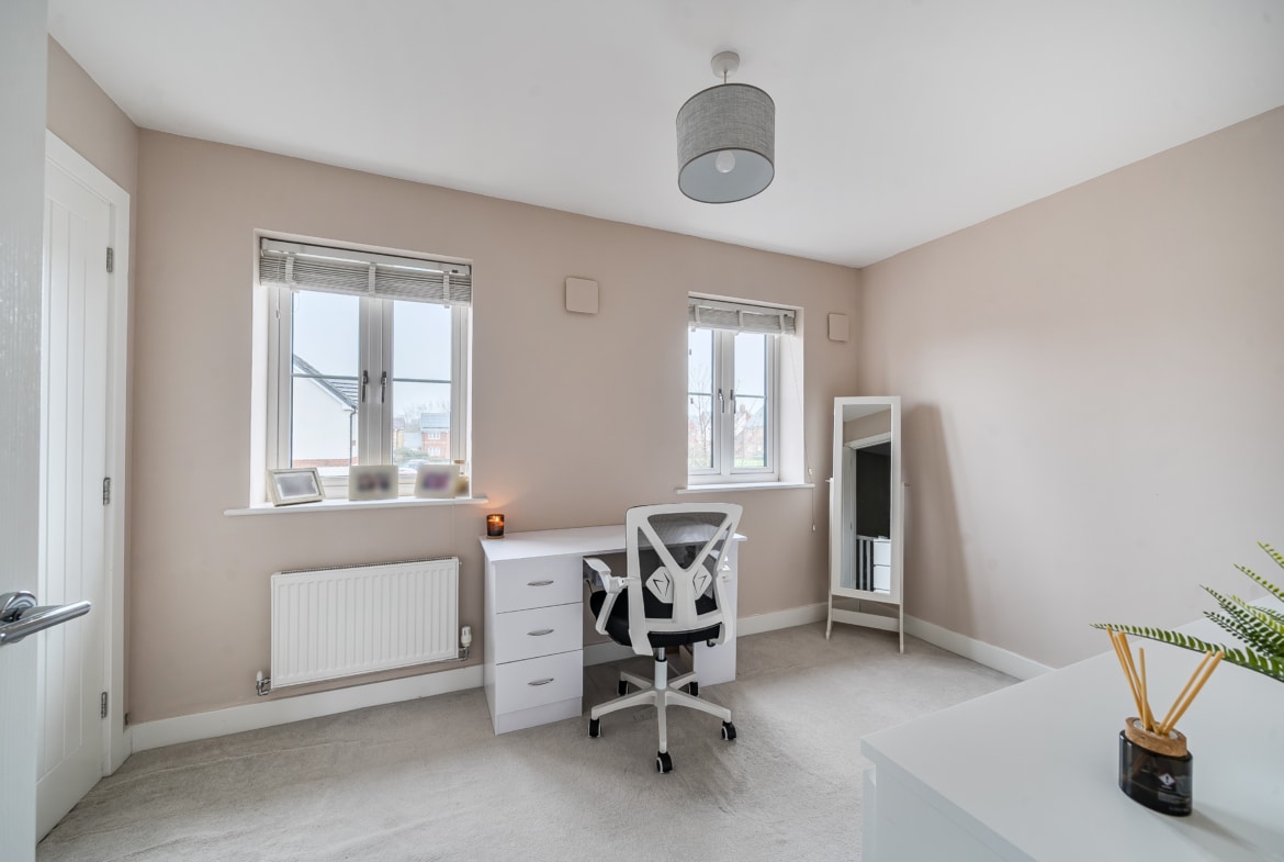Upstairs, the first floor landing provides access to two well-proportioned double bedrooms and the family bathroom. Both bedrooms offer comfortable accommodation and are versatile enough to suit a variety of needs, whether as guest rooms, a home office or additional storage space. They are served by a stylish, modern family bathroom fitted with a contemporary white suite and shower over the bath.