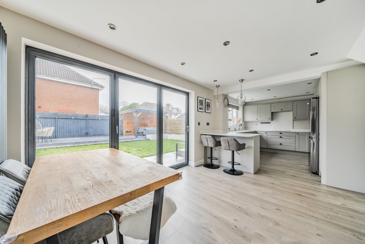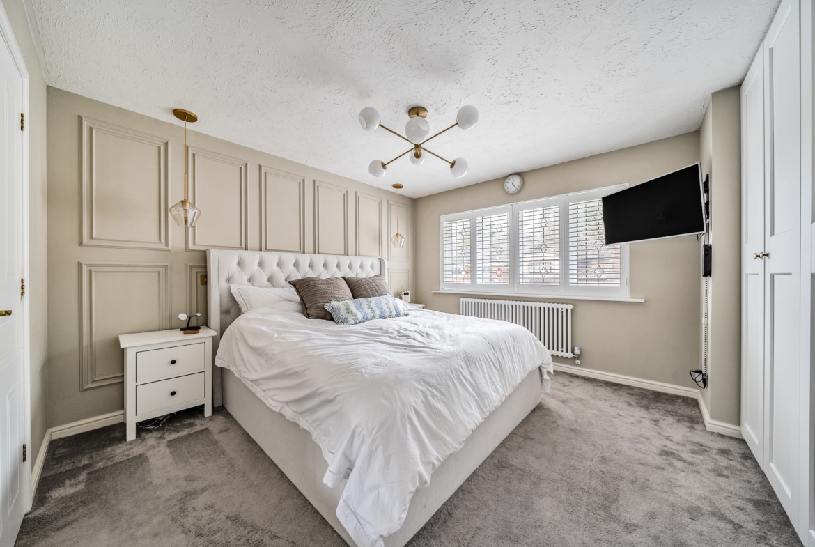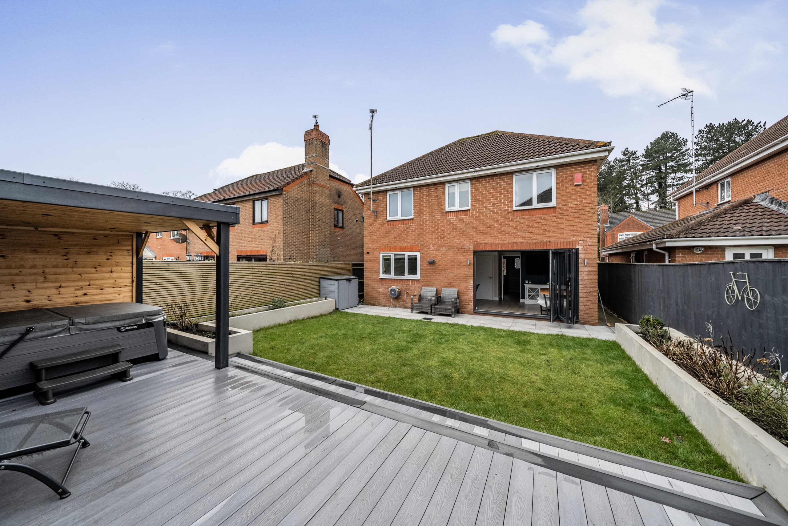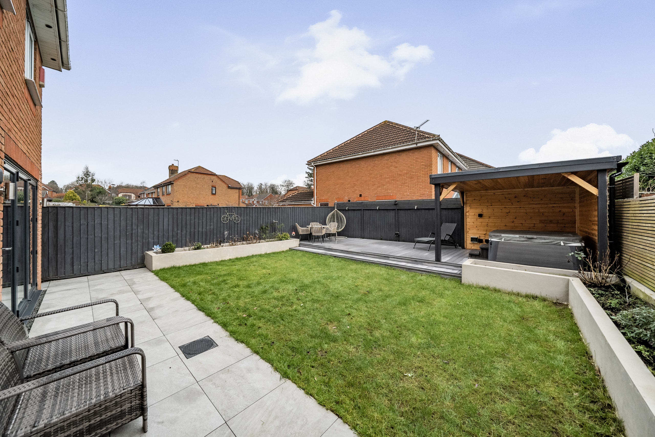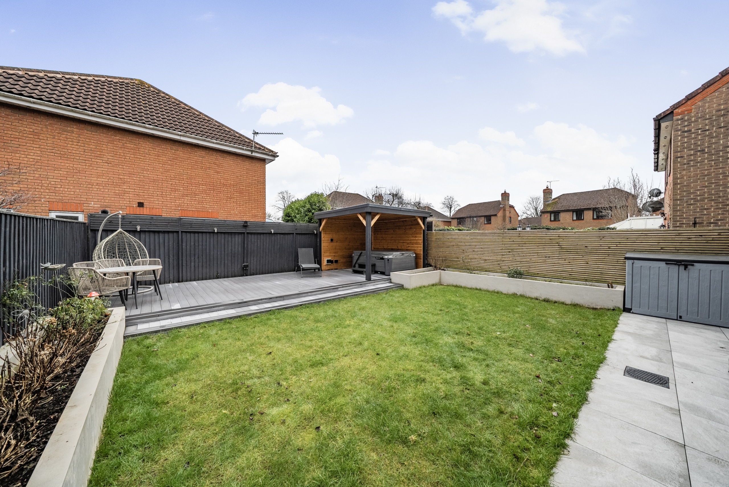 Stepping outside, this property continues to impress with its fantastic outdoor spaces. The generously proportioned rear garden offers a well-maintained lawn at its heart, complemented by a front patio and a rear decking area with a delightful covered pergola perfect for outdoor entertaining and relaxation. Additionally, the property benefits from driveway parking to the front, ensuring convenience for residents and guests alike.