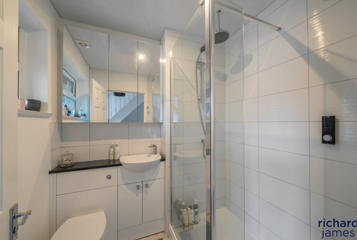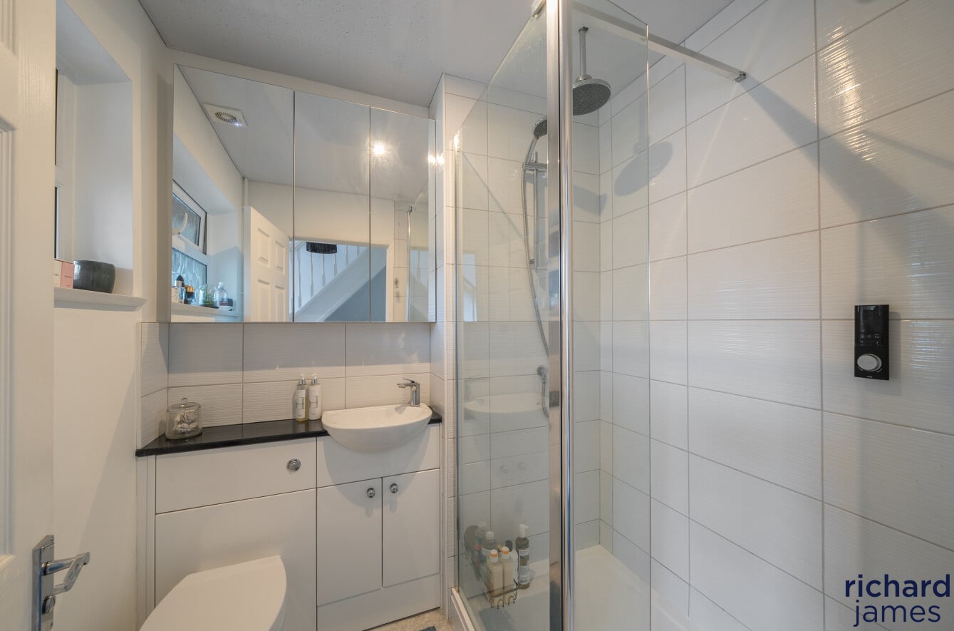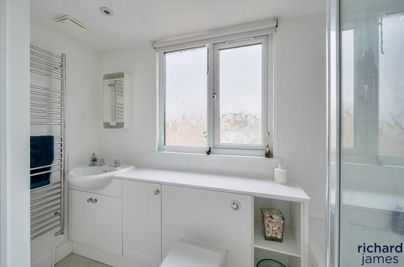 Upstairs, there are three well-proportioned bedrooms, including a principal bedroom with built-in storage and a stylish en-suite bathroom featuring a bath with shower over, WC, basin, and heated towel rail. The boarded and insulated loft provides excellent additional storage space.