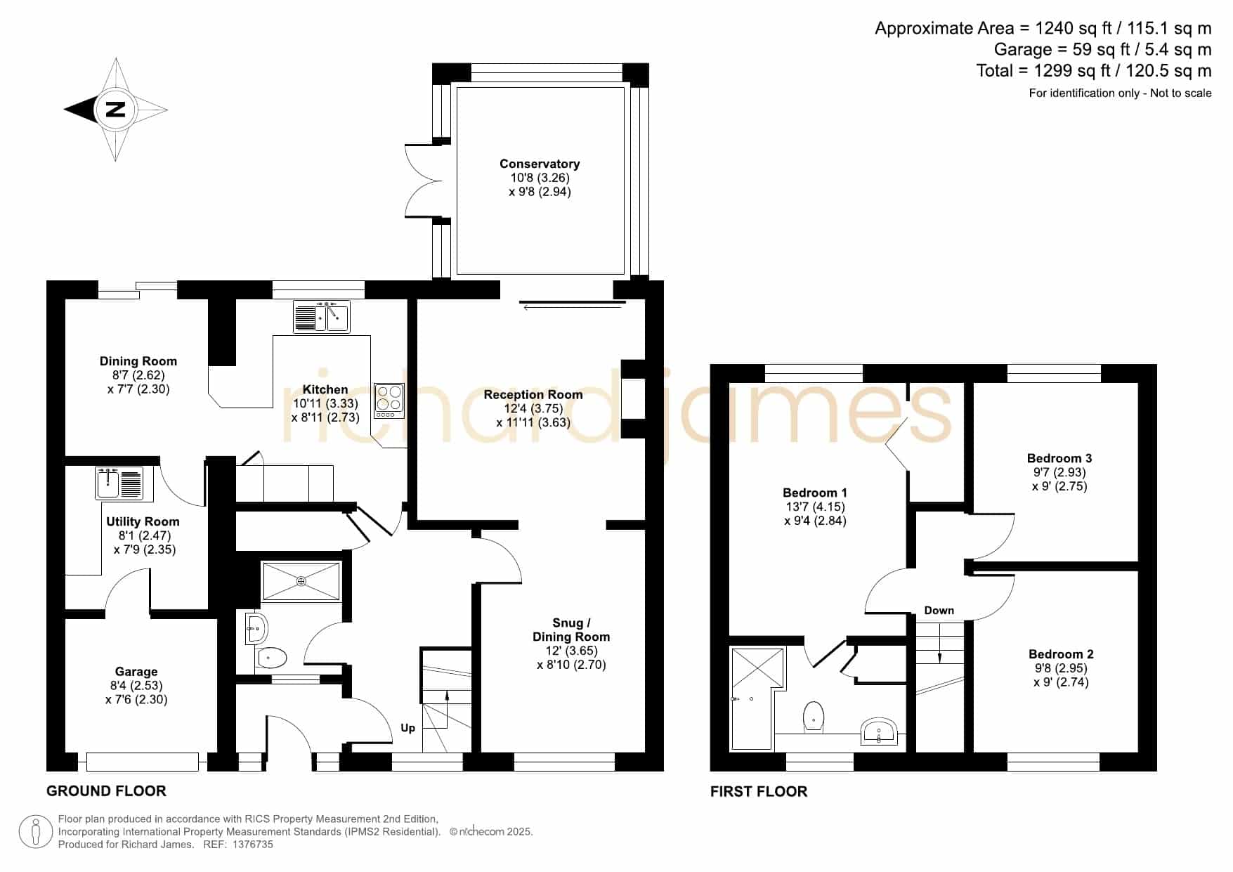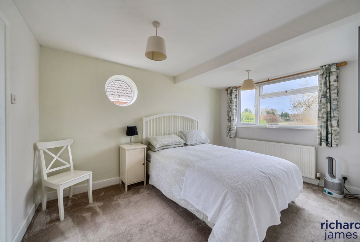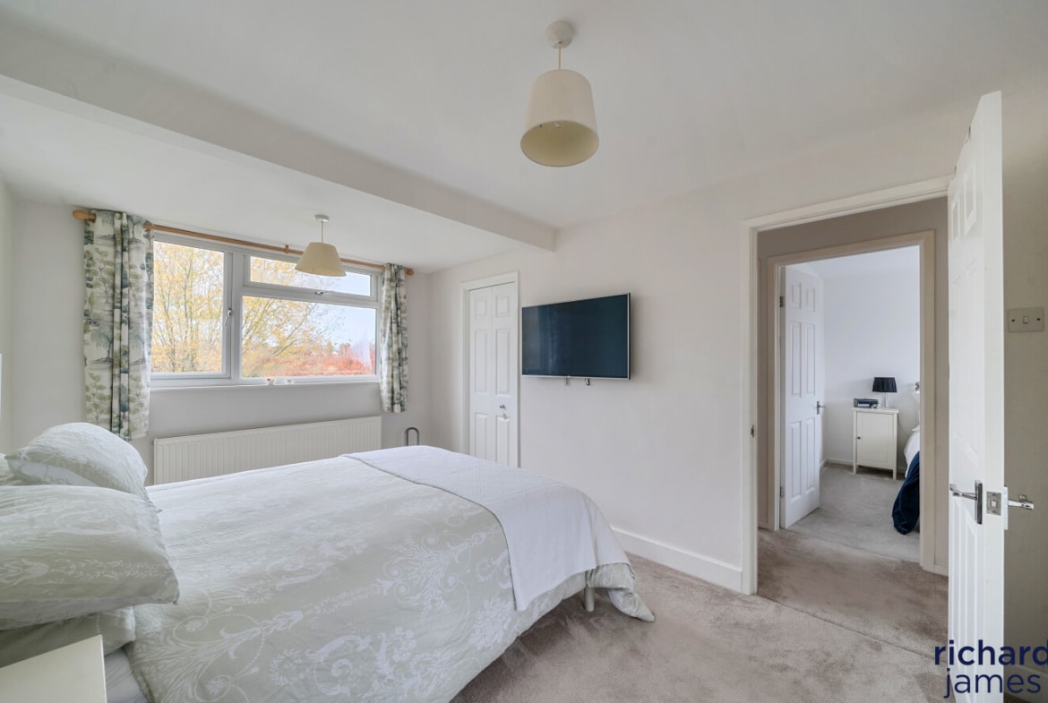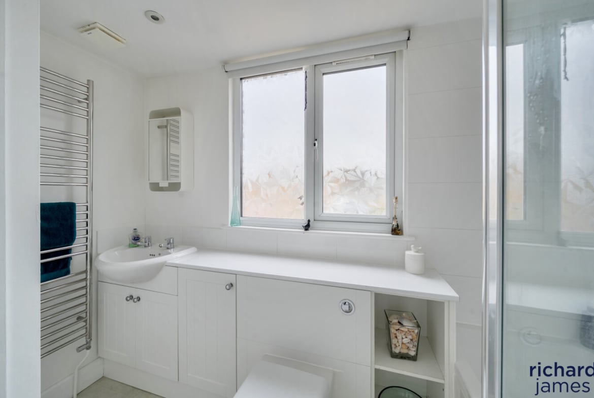 Upstairs, there are three well-proportioned bedrooms, including a principal bedroom with built-in storage and a stylish en-suite bathroom featuring a bath with shower over, WC, basin, and heated towel rail. The boarded and insulated loft provides excellent additional storage space.