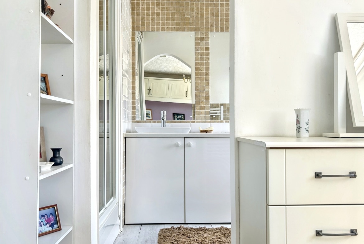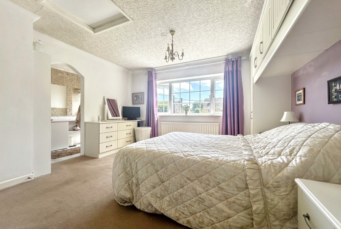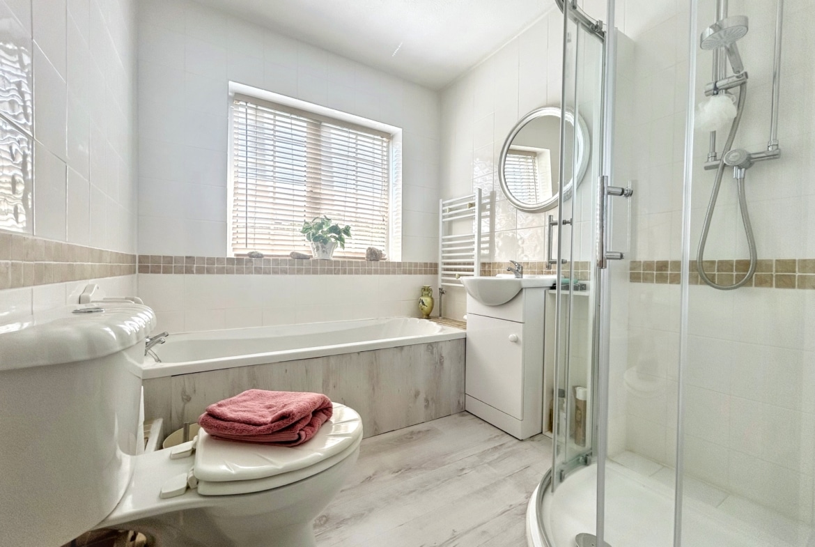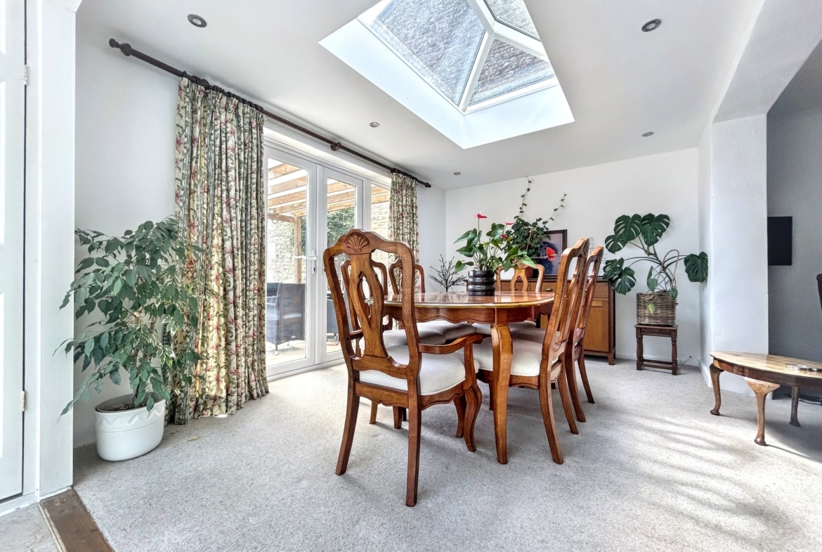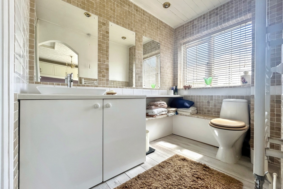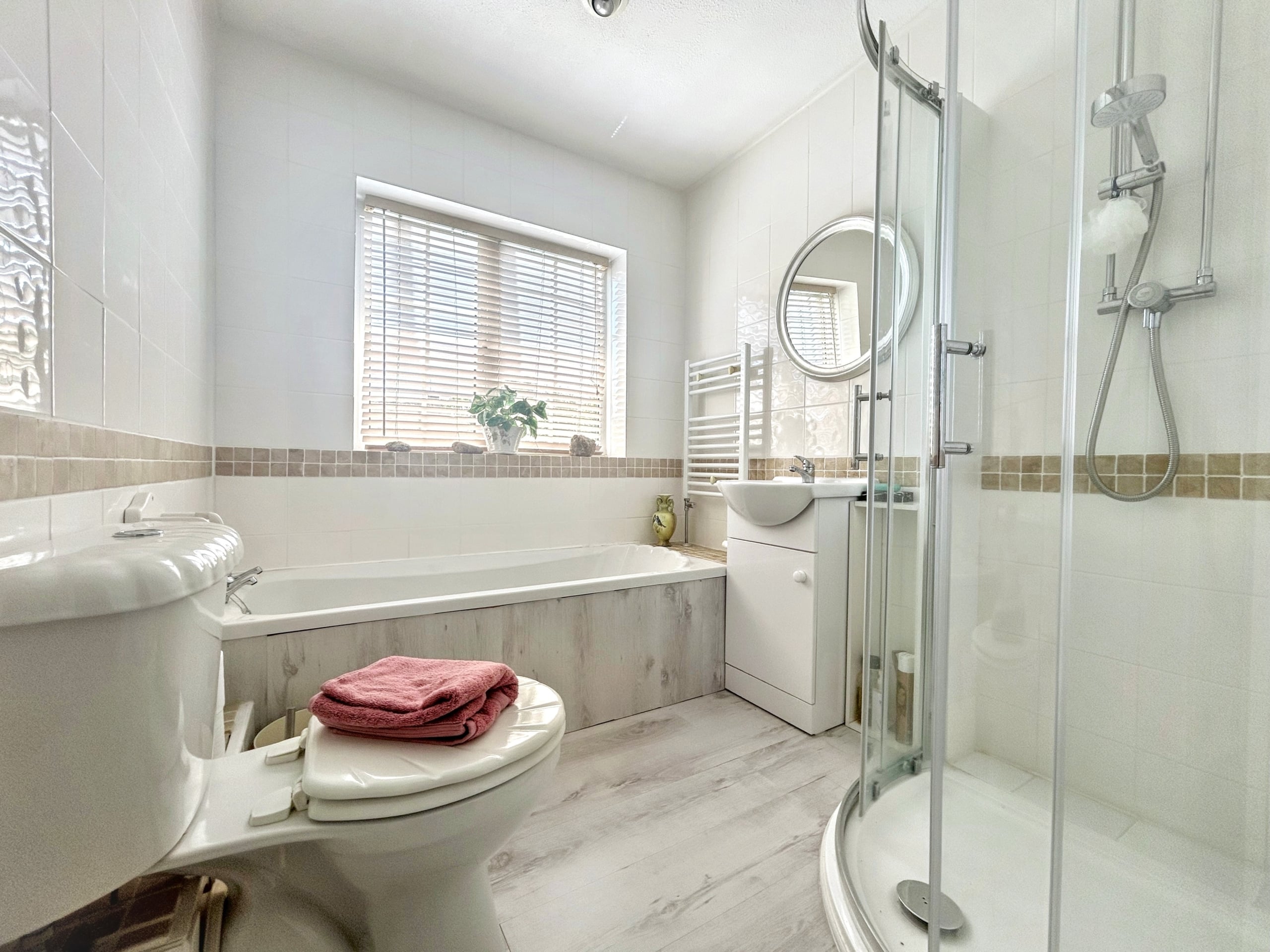 Internally, the home comprises a spacious living room, dining area, and breakfast area adjoining a well-laid-out kitchen. A ground-floor WC adds convenience, while the upper floor features two double bedrooms, including a principal bedroom with en-suite, and a family bathroom. The layout offers flexibility and room for modernisation to suit individual tastes.